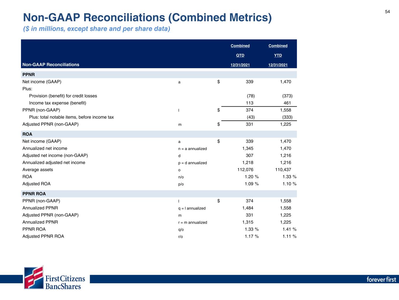 53 Non-GAAP Reconciliations (Combined Metrics) ($ in millions) Combined Combined QTD YTD Non-GAAP Reconciliations 12/31/2021 12/31/2021 Net income Net income (GAAP) a $ 339 1,470 Preferred stock dividends 16 48 Net income available to common stockholders (GAAP) b 323 1,422 Total notable items, after income tax c (32) (254) Adjusted net income (non-GAAP) d = (a+c) 307 1,216 Adjusted net income available to common stockholders (non-GAAP) e = (b+c) $ 291 1,168 Noninterest income and expense Noninterest income h 464 1,940 Impact of notable items, before income tax (200) (944) Adjusted noninterest income i 264 996 Noninterest expense j 709 2,823 Impact of notable items, before income tax (157) (611) Adjusted noninterest expense k 552 2,212 Provision (benefit) for credit losses Provision (benefit) for credit losses (78) (373) Plus: Day 2 provision for credit losses — — Adjusted provision (benefit) for credit losses (78) (373)