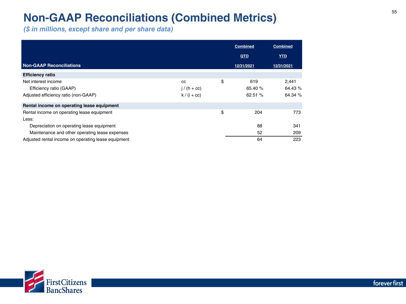 55 Non-GAAP Reconciliations (Combined Metrics) ($ in millions, except share and per share data) Combined Combined QTD YTD Non-GAAP Reconciliations 12/31/2021 12/31/2021 Efficiency ratio Net interest income cc $ 619 2,441 Efficiency ratio (GAAP) j / (h + cc) 65.40 % 64.43 % Adjusted efficiency ratio (non-GAAP) k / (i + cc) 62.51 % 64.34 % Rental income on operating lease equipment Rental income on operating lease equipment $ 204 773 Less: Depreciation on operating lease equipment 88 341 Maintenance and other operating lease expenses 52 209 Adjusted rental income on operating lease equipment 64 223