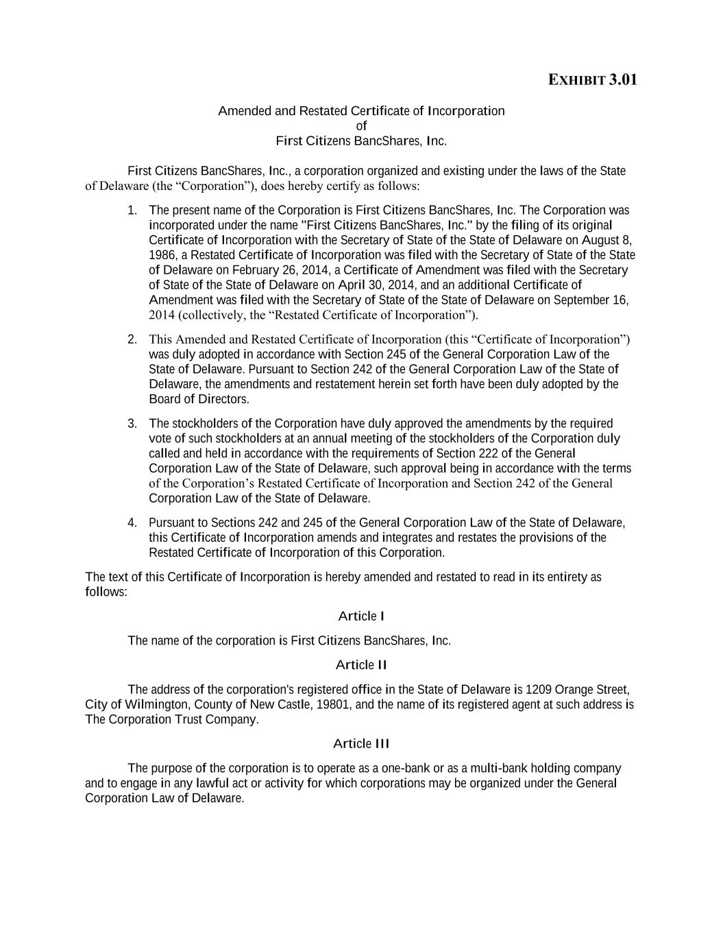 EXHIBIT 3.01 Amended and Restated Certificate of Incorporation of First Citizens BancShares, Inc. First Citizens BancShares, Inc., a corporation organized and existing under the laws of the State of Delaware (the “Corporation”), does hereby certify as follows: 1. The present name of the Corporation is First Citizens BancShares, Inc. The Corporation was incorporated under the name "First Citizens BancShares, Inc." by the filing of its original Certificate of Incorporation with the Secretary of State of the State of Delaware on August 8, 1986, a Restated Certificate of Incorporation was filed with the Secretary of State of the State of Delaware on February 26, 2014, a Certificate of Amendment was filed with the Secretary of State of the State of Delaware on April 30, 2014, and an additional Certificate of Amendment was filed with the Secretary of State of the State of Delaware on September 16, 2014 (collectively, the “Restated Certificate of Incorporation”). 2. This Amended and Restated Certificate of Incorporation (this “Certificate of Incorporation”) was duly adopted in accordance with Section 245 of the General Corporation Law of the State of Delaware. Pursuant to Section 242 of the General Corporation Law of the State of Delaware, the amendments and restatement herein set forth have been duly adopted by the Board of Directors. 3. The stockholders of the Corporation have duly approved the amendments by the required vote of such stockholders at an annual meeting of the stockholders of the Corporation duly called and held in accordance with the requirements of Section 222 of the General Corporation Law of the State of Delaware, such approval being in accordance with the terms of the Corporation’s Restated Certificate of Incorporation and Section 242 of the General Corporation Law of the State of Delaware. 4. Pursuant to Sections 242 and 245 of the General Corporation Law of the State of Delaware, this Certificate of Incorporation amends and integrates and restates the provisions of the Restated Certificate of Incorporation of this Corporation. The text of this Certificate of Incorporation is hereby amended and restated to read in its entirety as follows: Article I The name of the corporation is First Citizens BancShares, Inc. Article II The address of the corporation's registered office in the State of Delaware is 1209 Orange Street, City of Wilmington, County of New Castle, 19801, and the name of its registered agent at such address is The Corporation Trust Company. Article III The purpose of the corporation is to operate as a one-bank or as a multi-bank holding company and to engage in any lawful act or activity for which corporations may be organized under the General Corporation Law of Delaware.