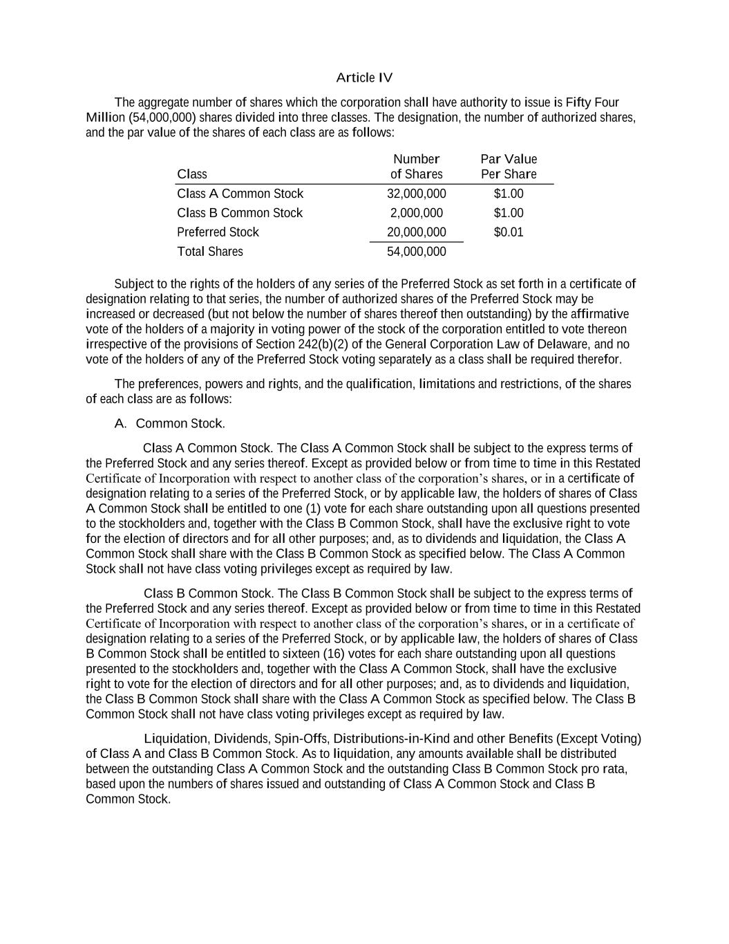 Article IV The aggregate number of shares which the corporation shall have authority to issue is Fifty Four Million (54,000,000) shares divided into three classes. The designation, the number of authorized shares, and the par value of the shares of each class are as follows: Class Number of Shares Par Value Per Share Class A Common Stock 32,000,000 $1.00 Class B Common Stock 2,000,000 $1.00 Preferred Stock 20,000,000 $0.01 Total Shares 54,000,000 Subject to the rights of the holders of any series of the Preferred Stock as set forth in a certificate of designation relating to that series, the number of authorized shares of the Preferred Stock may be increased or decreased (but not below the number of shares thereof then outstanding) by the affirmative vote of the holders of a majority in voting power of the stock of the corporation entitled to vote thereon irrespective of the provisions of Section 242(b)(2) of the General Corporation Law of Delaware, and no vote of the holders of any of the Preferred Stock voting separately as a class shall be required therefor. The preferences, powers and rights, and the qualification, limitations and restrictions, of the shares of each class are as follows: A. Common Stock. Class A Common Stock. The Class A Common Stock shall be subject to the express terms of the Preferred Stock and any series thereof. Except as provided below or from time to time in this Restated Certificate of Incorporation with respect to another class of the corporation’s shares, or in a certificate of designation relating to a series of the Preferred Stock, or by applicable law, the holders of shares of Class A Common Stock shall be entitled to one (1) vote for each share outstanding upon all questions presented to the stockholders and, together with the Class B Common Stock, shall have the exclusive right to vote for the election of directors and for all other purposes; and, as to dividends and liquidation, the Class A Common Stock shall share with the Class B Common Stock as specified below. The Class A Common Stock shall not have class voting privileges except as required by law. Class B Common Stock. The Class B Common Stock shall be subject to the express terms of the Preferred Stock and any series thereof. Except as provided below or from time to time in this Restated Certificate of Incorporation with respect to another class of the corporation’s shares, or in a certificate of designation relating to a series of the Preferred Stock, or by applicable law, the holders of shares of Class B Common Stock shall be entitled to sixteen (16) votes for each share outstanding upon all questions presented to the stockholders and, together with the Class A Common Stock, shall have the exclusive right to vote for the election of directors and for all other purposes; and, as to dividends and liquidation, the Class B Common Stock shall share with the Class A Common Stock as specified below. The Class B Common Stock shall not have class voting privileges except as required by law. Liquidation, Dividends, Spin-Offs, Distributions-in-Kind and other Benefits (Except Voting) of Class A and Class B Common Stock. As to liquidation, any amounts available shall be distributed between the outstanding Class A Common Stock and the outstanding Class B Common Stock pro rata, based upon the numbers of shares issued and outstanding of Class A Common Stock and Class B Common Stock.