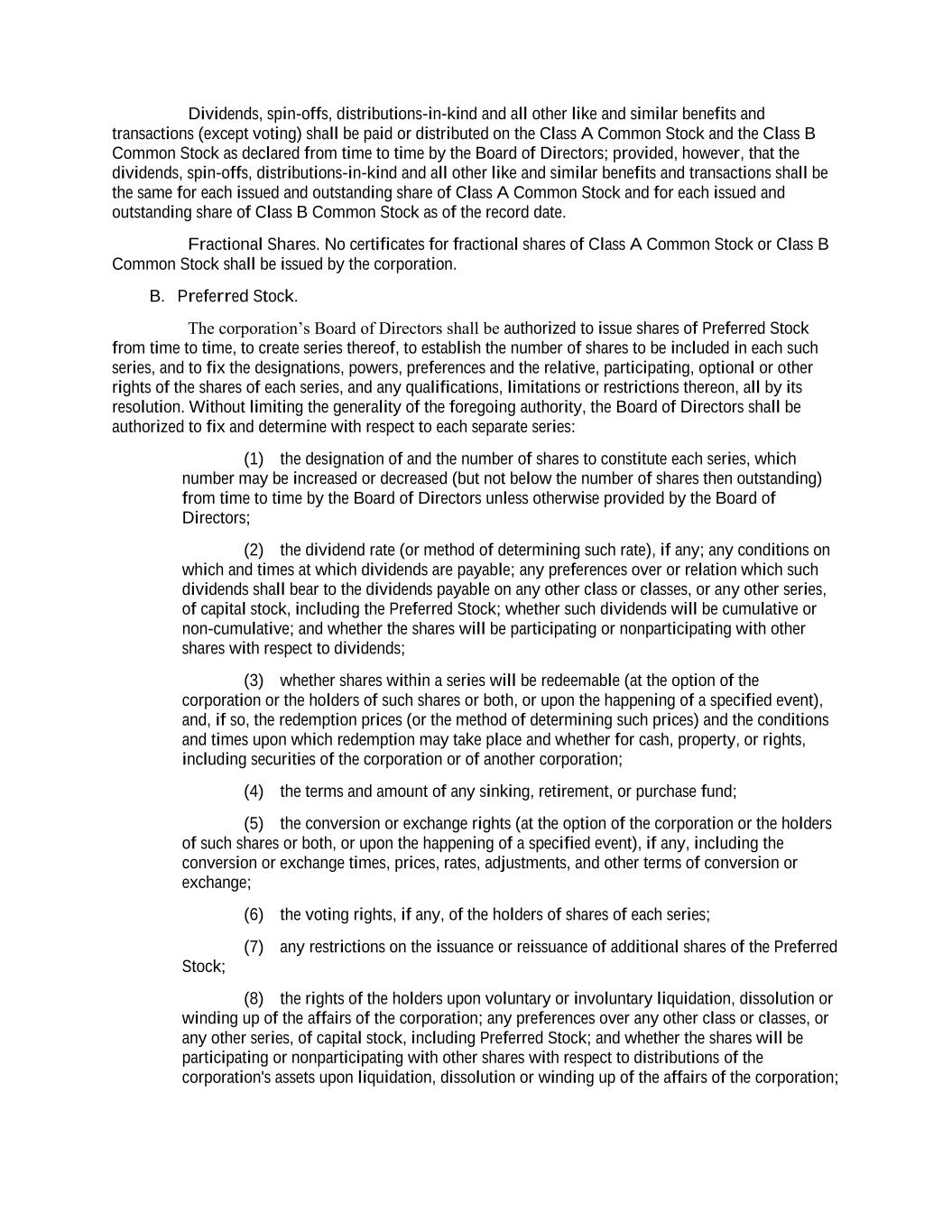 Dividends, spin-offs, distributions-in-kind and all other like and similar benefits and transactions (except voting) shall be paid or distributed on the Class A Common Stock and the Class B Common Stock as declared from time to time by the Board of Directors; provided, however, that the dividends, spin-offs, distributions-in-kind and all other like and similar benefits and transactions shall be the same for each issued and outstanding share of Class A Common Stock and for each issued and outstanding share of Class B Common Stock as of the record date. Fractional Shares. No certificates for fractional shares of Class A Common Stock or Class B Common Stock shall be issued by the corporation. B. Preferred Stock. The corporation’s Board of Directors shall be authorized to issue shares of Preferred Stock from time to time, to create series thereof, to establish the number of shares to be included in each such series, and to fix the designations, powers, preferences and the relative, participating, optional or other rights of the shares of each series, and any qualifications, limitations or restrictions thereon, all by its resolution. Without limiting the generality of the foregoing authority, the Board of Directors shall be authorized to fix and determine with respect to each separate series: (1) the designation of and the number of shares to constitute each series, which number may be increased or decreased (but not below the number of shares then outstanding) from time to time by the Board of Directors unless otherwise provided by the Board of Directors; (2) the dividend rate (or method of determining such rate), if any; any conditions on which and times at which dividends are payable; any preferences over or relation which such dividends shall bear to the dividends payable on any other class or classes, or any other series, of capital stock, including the Preferred Stock; whether such dividends will be cumulative or non-cumulative; and whether the shares will be participating or nonparticipating with other shares with respect to dividends; (3) whether shares within a series will be redeemable (at the option of the corporation or the holders of such shares or both, or upon the happening of a specified event), and, if so, the redemption prices (or the method of determining such prices) and the conditions and times upon which redemption may take place and whether for cash, property, or rights, including securities of the corporation or of another corporation; (4) the terms and amount of any sinking, retirement, or purchase fund; (5) the conversion or exchange rights (at the option of the corporation or the holders of such shares or both, or upon the happening of a specified event), if any, including the conversion or exchange times, prices, rates, adjustments, and other terms of conversion or exchange; (6) the voting rights, if any, of the holders of shares of each series; (7) any restrictions on the issuance or reissuance of additional shares of the Preferred Stock; (8) the rights of the holders upon voluntary or involuntary liquidation, dissolution or winding up of the affairs of the corporation; any preferences over any other class or classes, or any other series, of capital stock, including Preferred Stock; and whether the shares will be participating or nonparticipating with other shares with respect to distributions of the corporation's assets upon liquidation, dissolution or winding up of the affairs of the corporation;