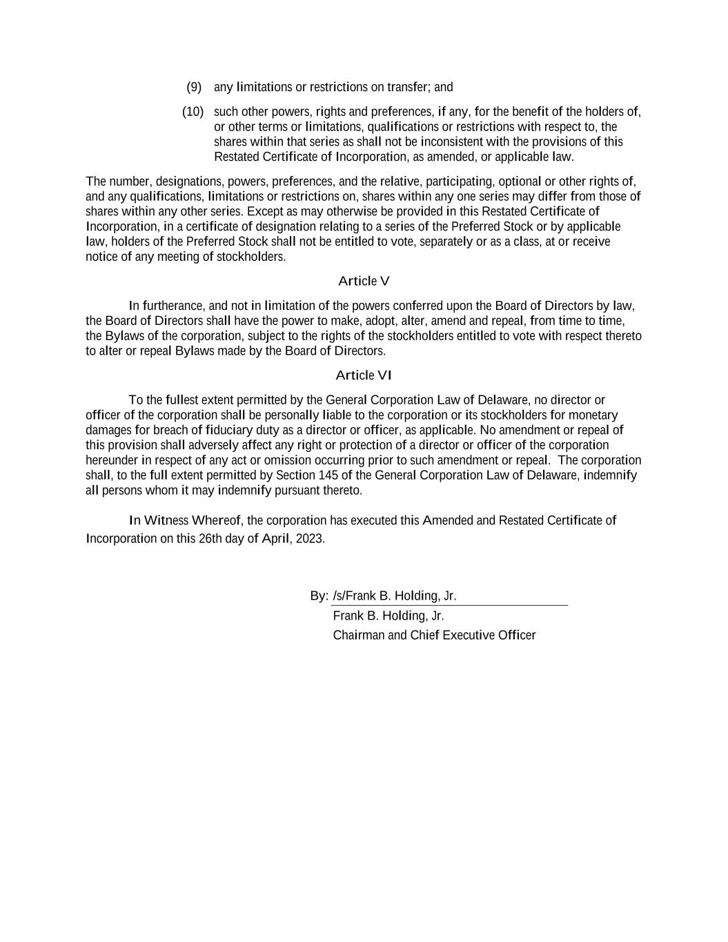 (9) any limitations or restrictions on transfer; and (10) such other powers, rights and preferences, if any, for the benefit of the holders of, or other terms or limitations, qualifications or restrictions with respect to, the shares within that series as shall not be inconsistent with the provisions of this Restated Certificate of Incorporation, as amended, or applicable law. The number, designations, powers, preferences, and the relative, participating, optional or other rights of, and any qualifications, limitations or restrictions on, shares within any one series may differ from those of shares within any other series. Except as may otherwise be provided in this Restated Certificate of Incorporation, in a certificate of designation relating to a series of the Preferred Stock or by applicable law, holders of the Preferred Stock shall not be entitled to vote, separately or as a class, at or receive notice of any meeting of stockholders. Article V In furtherance, and not in limitation of the powers conferred upon the Board of Directors by law, the Board of Directors shall have the power to make, adopt, alter, amend and repeal, from time to time, the Bylaws of the corporation, subject to the rights of the stockholders entitled to vote with respect thereto to alter or repeal Bylaws made by the Board of Directors. Article VI To the fullest extent permitted by the General Corporation Law of Delaware, no director or officer of the corporation shall be personally liable to the corporation or its stockholders for monetary damages for breach of fiduciary duty as a director or officer, as applicable. No amendment or repeal of this provision shall adversely affect any right or protection of a director or officer of the corporation hereunder in respect of any act or omission occurring prior to such amendment or repeal. The corporation shall, to the full extent permitted by Section 145 of the General Corporation Law of Delaware, indemnify all persons whom it may indemnify pursuant thereto. In Witness Whereof, the corporation has executed this Amended and Restated Certificate of Incorporation on this 26th day of April, 2023. By: /s/Frank B. Holding, Jr. Frank B. Holding, Jr. Chairman and Chief Executive Officer