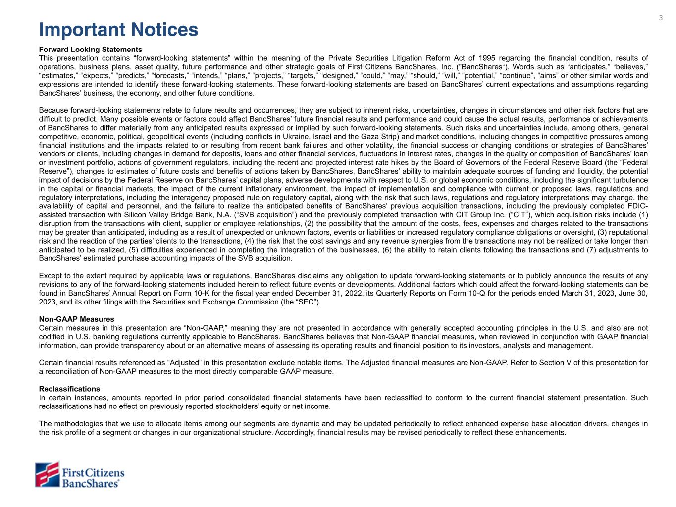 3 Forward Looking Statements This presentation contains “forward-looking statements” within the meaning of the Private Securities Litigation Reform Act of 1995 regarding the financial condition, results of operations, business plans, asset quality, future performance and other strategic goals of First Citizens BancShares, Inc. ("BancShares“). Words such as “anticipates,” “believes,” “estimates,” “expects,” “predicts,” “forecasts,” “intends,” “plans,” “projects,” “targets,” “designed,” “could,” “may,” “should,” “will,” “potential,” “continue”, “aims” or other similar words and expressions are intended to identify these forward-looking statements. These forward-looking statements are based on BancShares’ current expectations and assumptions regarding BancShares’ business, the economy, and other future conditions. Because forward-looking statements relate to future results and occurrences, they are subject to inherent risks, uncertainties, changes in circumstances and other risk factors that are difficult to predict. Many possible events or factors could affect BancShares’ future financial results and performance and could cause the actual results, performance or achievements of BancShares to differ materially from any anticipated results expressed or implied by such forward-looking statements. Such risks and uncertainties include, among others, general competitive, economic, political, geopolitical events (including conflicts in Ukraine, Israel and the Gaza Strip) and market conditions, including changes in competitive pressures among financial institutions and the impacts related to or resulting from recent bank failures and other volatility, the financial success or changing conditions or strategies of BancShares’ vendors or clients, including changes in demand for deposits, loans and other financial services, fluctuations in interest rates, changes in the quality or composition of BancShares’ loan or investment portfolio, actions of government regulators, including the recent and projected interest rate hikes by the Board of Governors of the Federal Reserve Board (the “Federal Reserve”), changes to estimates of future costs and benefits of actions taken by BancShares, BancShares’ ability to maintain adequate sources of funding and liquidity, the potential impact of decisions by the Federal Reserve on BancShares’ capital plans, adverse developments with respect to U.S. or global economic conditions, including the significant turbulence in the capital or financial markets, the impact of the current inflationary environment, the impact of implementation and compliance with current or proposed laws, regulations and regulatory interpretations, including the interagency proposed rule on regulatory capital, along with the risk that such laws, regulations and regulatory interpretations may change, the availability of capital and personnel, and the failure to realize the anticipated benefits of BancShares’ previous acquisition transactions, including the previously completed FDIC- assisted transaction with Silicon Valley Bridge Bank, N.A. (“SVB acquisition”) and the previously completed transaction with CIT Group Inc. (“CIT”), which acquisition risks include (1) disruption from the transactions with client, supplier or employee relationships, (2) the possibility that the amount of the costs, fees, expenses and charges related to the transactions may be greater than anticipated, including as a result of unexpected or unknown factors, events or liabilities or increased regulatory compliance obligations or oversight, (3) reputational risk and the reaction of the parties’ clients to the transactions, (4) the risk that the cost savings and any revenue synergies from the transactions may not be realized or take longer than anticipated to be realized, (5) difficulties experienced in completing the integration of the businesses, (6) the ability to retain clients following the transactions and (7) adjustments to BancShares’ estimated purchase accounting impacts of the SVB acquisition. Except to the extent required by applicable laws or regulations, BancShares disclaims any obligation to update forward-looking statements or to publicly announce the results of any revisions to any of the forward-looking statements included herein to reflect future events or developments. Additional factors which could affect the forward-looking statements can be found in BancShares’ Annual Report on Form 10-K for the fiscal year ended December 31, 2022, its Quarterly Reports on Form 10-Q for the periods ended March 31, 2023, June 30, 2023, and its other filings with the Securities and Exchange Commission (the “SEC”). Non-GAAP Measures Certain measures in this presentation are “Non-GAAP,” meaning they are not presented in accordance with generally accepted accounting principles in the U.S. and also are not codified in U.S. banking regulations currently applicable to BancShares. BancShares believes that Non-GAAP financial measures, when reviewed in conjunction with GAAP financial information, can provide transparency about or an alternative means of assessing its operating results and financial position to its investors, analysts and management. Certain financial results referenced as “Adjusted” in this presentation exclude notable items. The Adjusted financial measures are Non-GAAP. Refer to Section V of this presentation for a reconciliation of Non-GAAP measures to the most directly comparable GAAP measure. Reclassifications In certain instances, amounts reported in prior period consolidated financial statements have been reclassified to conform to the current financial statement presentation. Such reclassifications had no effect on previously reported stockholders’ equity or net income. The methodologies that we use to allocate items among our segments are dynamic and may be updated periodically to