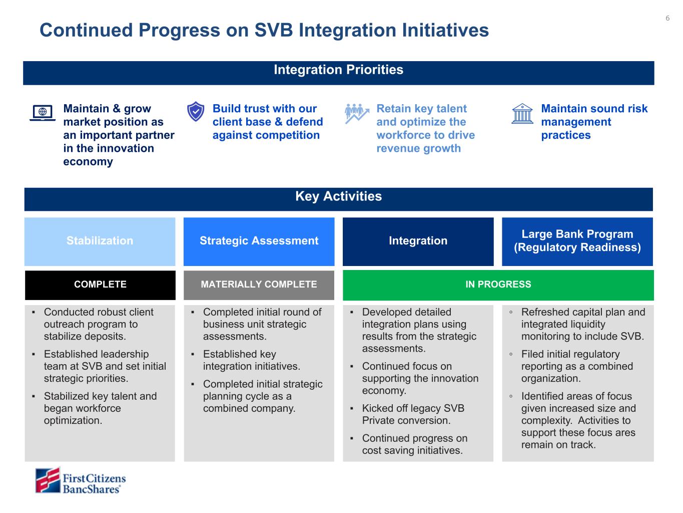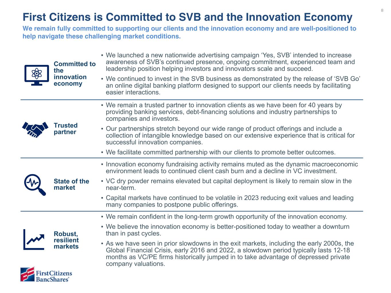 7 Strategic Priorities Grow Core Lines of Business • Allocate capital and investments to grow lines of business with the highest returns and opportunity. Scale Talent with an Eye Towards the Future • Attract, retain and develop associates who align with our long-term direction and culture while scaling for continued growth. Optimize Capital & Core Funding • Continue to optimize core funding by growing lower cost deposits. • Use innovation to facilitate growth, expand revenue opportunities and reduce cost of delivery while building a foundation for the future. Manage Risk Effectively • Continue to manage risk within our defined risk appetite. • Align risk management activities to support our move to the large financial institution framework. Maintain Positive Operating Leverage • Identify areas to enhance revenue and control costs beyond acquisition synergy goals. Deliver value from SVB acquisition • Maintain position as an important partner for the innovation economy. • Continue to rebuild trust with legacy SVB client base. • Focus on retaining legacy SVB talent and driving revenue growth. • Leverage complementary capabilities and cultural attributes to differentiate our value proposition throughout customers' life cycle.