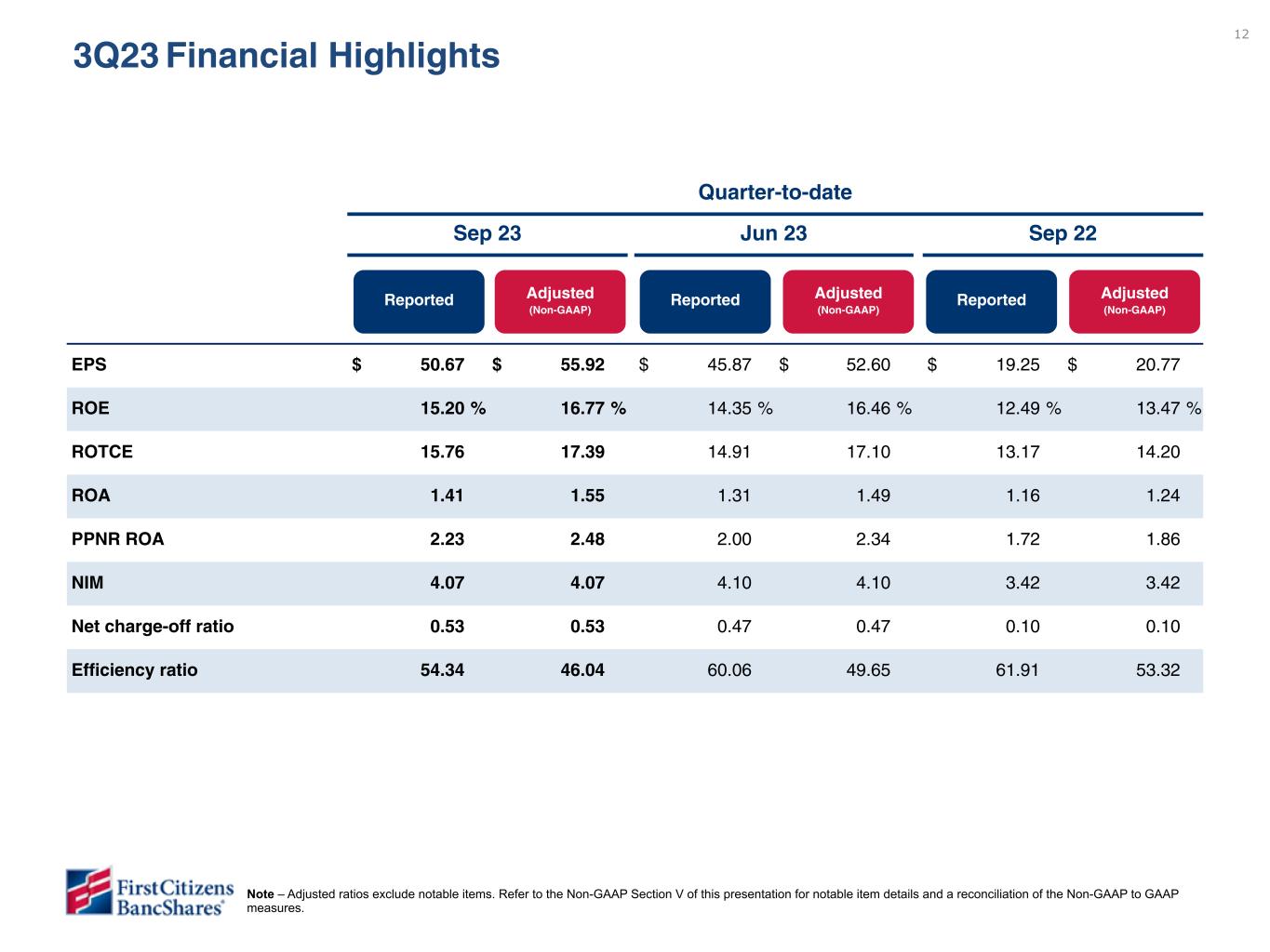 11 3Q23 Financial Results - Takeaways Quarter-to-date Year-to-date Mar 23 Dec 22 Mar 22 Mar 23 Dec 21 EPS $ 16.67 $ 20.94 $ 19.25 $ 20.77 $ 12.09 $ 12.82 $ 67.40 $ 77.24 $ 53.88 $ 51.88 ROE 11.05 % 13.89 % 12.49 % 13.47 % 10.96 % 11.63 % 11.15 % 12.78 % 12.84 % 12.36 % ROTCE 11.70 % 14.71 % 13.17 % 14.20 % 12.00 % 12.72 % 11.78 % 13.50 % 14.12 % 13.60 % ROA 0.93 % 1.15 % 1.16 % 1.24 % 1.20 % 1.09 % 1.01 % 1.15 % 1.33 % 1.10 % PPNR ROA 1.70 % 1.81 % 1.72 % 1.86 % 1.33 % 1.17 % 1.84 % 1.64 % 1.41 % 1.11 % NIM 3.36 % 3.36 % 3.40 % 3.40 % 2.56 % 2.56 % 3.14 % 3.14 % 2.55 % 2.55 % Net charge-off ratio 0.14 % 0.14 % 0.10 % 0.10 % 0.04 % 0.04 % 0.12 % 0.12 % 0.08 % 0.08 % Efficiency ratio 61.74 % 54.08 % 61.91 % 53.32 % 65.40 % 62.51 % 60.50 % 56.40 % 64.43 % 64.34 % Reported Adjusted (Non-GAAP) Reported Adjusted (Non-GAAP) Reported Adjusted (Non-GAAP) Reported Adjusted (Non-GAAP) Reported Adjusted (Non-GAAP) Strong EPS, ROE and ROA performance.1 Solid net interest income and NIM performance.2 Continued low levels of private equity/ venture capital activity remain a headwind for loan and deposit growth in the SVB segment. 6 Net charge-offs increased during the quarter driven by continued headwinds in the general office and the innovation portfolios. 7 Sustained deposit growth momentum driven by the Direct Bank channel. 5 Another quarter of PPNR growth leading to further improvement in the efficiency ratio.3 Loan growth was strong in the General and Commercial Bank segments. 4 Office-related CRE exposure remains limited and CRE-related reserve build continued. 8 Maintained a strong balance sheet position in terms of capital and liquidity due to strong earnings and deposit growth. 9 Continued to implement, review and develop plans for the large bank program and proposed regulatory changes. 10