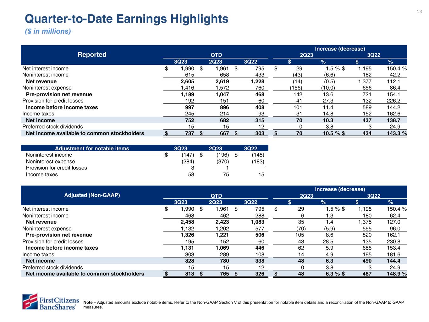 12 Quarter-to-date Sep 23 Jun 23 Sep 22 EPS $ 50.67 $ 55.92 $ 45.87 $ 52.60 $ 19.25 $ 20.77 ROE 15.20 % 16.77 % 14.35 % 16.46 % 12.49 % 13.47 % ROTCE 15.76 17.39 14.91 17.10 13.17 14.20 ROA 1.41 1.55 1.31 1.49 1.16 1.24 PPNR ROA 2.23 2.48 2.00 2.34 1.72 1.86 NIM 4.07 4.07 4.10 4.10 3.42 3.42 Net charge-off ratio 0.53 0.53 0.47 0.47 0.10 0.10 Efficiency ratio 54.34 46.04 60.06 49.65 61.91 53.32 Reported Adjusted (Non-GAAP) Reported Adjusted (Non-GAAP) Reported Adjusted (Non-GAAP) 3Q23 Financial Highlights Quarter-to-date Year-to-date Mar 23 Dec 22 Mar 22 Mar 23 Dec 21 EPS $ 16.67 $ 20.94 $ 19.25 $ 20.77 $ 12.09 $ 12.82 $ 67.40 $ 77.24 $ 53.88 $ 51.88 ROE 11.05 % 13.89 % 12.49 % 13.47 % 10.96 % 11.63 % 11.15 % 12.78 % 12.84 % 12.36 % ROTCE 11.70 % 14.71 % 13.17 % 14.20 % 12.00 % 12.72 % 11.78 % 13.50 % 14.12 % 13.60 % ROA 0.93 % 1.15 % 1.16 % 1.24 % 1.20 % 1.09 % 1.01 % 1.15 % 1.33 % 1.10 % PPNR ROA 1.70 % 1.81 % 1.72 % 1.86 % 1.33 % 1.17 % 1.84 % 1.64 % 1.41 % 1.11 % NIM 3.36 % 3.36 % 3.40 % 3.40 % 2.56 % 2.56 % 3.14 % 3.14 % 2.55 % 2.55 % Net charge-off ratio 0.14 % 0.14 % 0.10 % 0.10 % 0.04 % 0.04 % 0.12 % 0.12 % 0.08 % 0.08 % Efficiency ratio 61.74 % 54.08 % 61.91 % 53.32 % 65.40 % 62.51 % 60.50 % 56.40 % 64.43 % 64.34 % Reported Adjusted (Non-GAAP) Reported Adjusted (Non-GAAP) Reported Adjusted (Non-GAAP) Reported Adjusted (Non-GAAP) Reported Adjusted (Non-GAAP) Note – Adjusted ratios exclude notable items. Refer to the Non-GAAP Section V of this presentation for notable item details and a reconciliation of the Non-GAAP to GAAP measures.