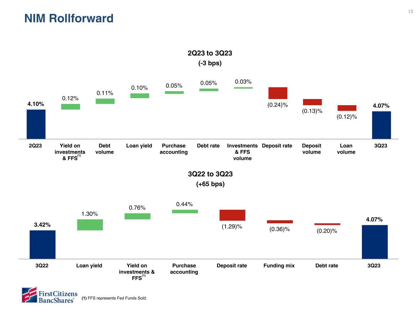 14 $795 $802 $850 $1,961 $1,990 3.42% 3.39% 3.41% 4.10% 4.07% NII NIM 3Q22 4Q22 1Q23 2Q23 3Q23 $2,441 $2,946 2.55% 3.14% YTD Dec 21 YTD Dec 22 3Q23 vs 2Q23 Net interest income increased by $29 million due to a $157 million increase in interest income, partially offset by a $128 million increase in interest expense. The change in net interest income was primarily due to the following: ◦ $73 million increase in interest income on loans due to loan accretion ($32 million) and a higher yield, partially offset by a lower average balance, ◦ $60 million increase in interest on investment securities due to a higher average balance and yield, ◦ $24 million increase in interest income on overnight investments due to a higher yield, and a ◦ $66 million decrease in borrowing costs primarily due to the pay down of FHLB borrowings, and a lower rate paid; partially offset by a ◦ $194 million increase in interest expense on deposits due to deposit growth, and a higher rate paid. NIM contracted by 3 basis points from 4.10% to 4.07%. See the following page for a rollforward of NIM between 2Q23 and 3Q23. YTD December 2022 vs YTD December 2021 Net interest income increased by $505 million due to a $483 million increase in interest income and a $22 million decrease in interest expense. The change in net interest income was primarily due to the following: ◦ $256 million increase on interest income on loans due to a higher yield and growth offset by lower SBA- PPP interest and fee income and lower accretion income, ◦ $138 million increase in interest income on investment securities due to higher yield and average balance, ◦ $118 million decline in interest expense on borrowings due to a lower rate and average balance, ◦ $89 million increase in interest income on overnight investments due to a higher yield despite a lower average balance; partially offset by a ◦ $96 million increase in interest expense on deposits due to a higher rate paid. NIM expanded from 2.55% to 3.14%. $505 million & 59 bps Highlights $29 million & (-3 bps) 3Q23 vs 3Q22 Net interest income increased by $1.2 billion due to a $2.2 billion increase in interest income, partially offset by a $1.0 billion increase in interest expense. The change in net interest income was primarily due to the following: ◦ $1.6 billion increase in interest income on loans due to a higher average balance and increased loan accretion ($263 million) both as a result of the SVB acquisition, an increase in loan yield, and loan growth in the General Bank and Commercial Bank, ◦ $473 million increase in interest on overnight investments due to a higher yield and higher average balance resulting from the SVB acquisition; partially offset by a ◦ $691 million increase in interest expense on deposits due to a higher average balance resulting from the SVB acquisition, deposit growth, and a higher rate paid, and a ◦ $318 million increase in interest expense on borrowings primarily due to the Purchase Money Note related to the SVB acquisition. NIM expanded 65 basis points from 3.42% to 4.07%. See the following page for a rollforward of NIM between 3Q22 and 3Q23. Net interest income and margin (NIM) ($ in millions)