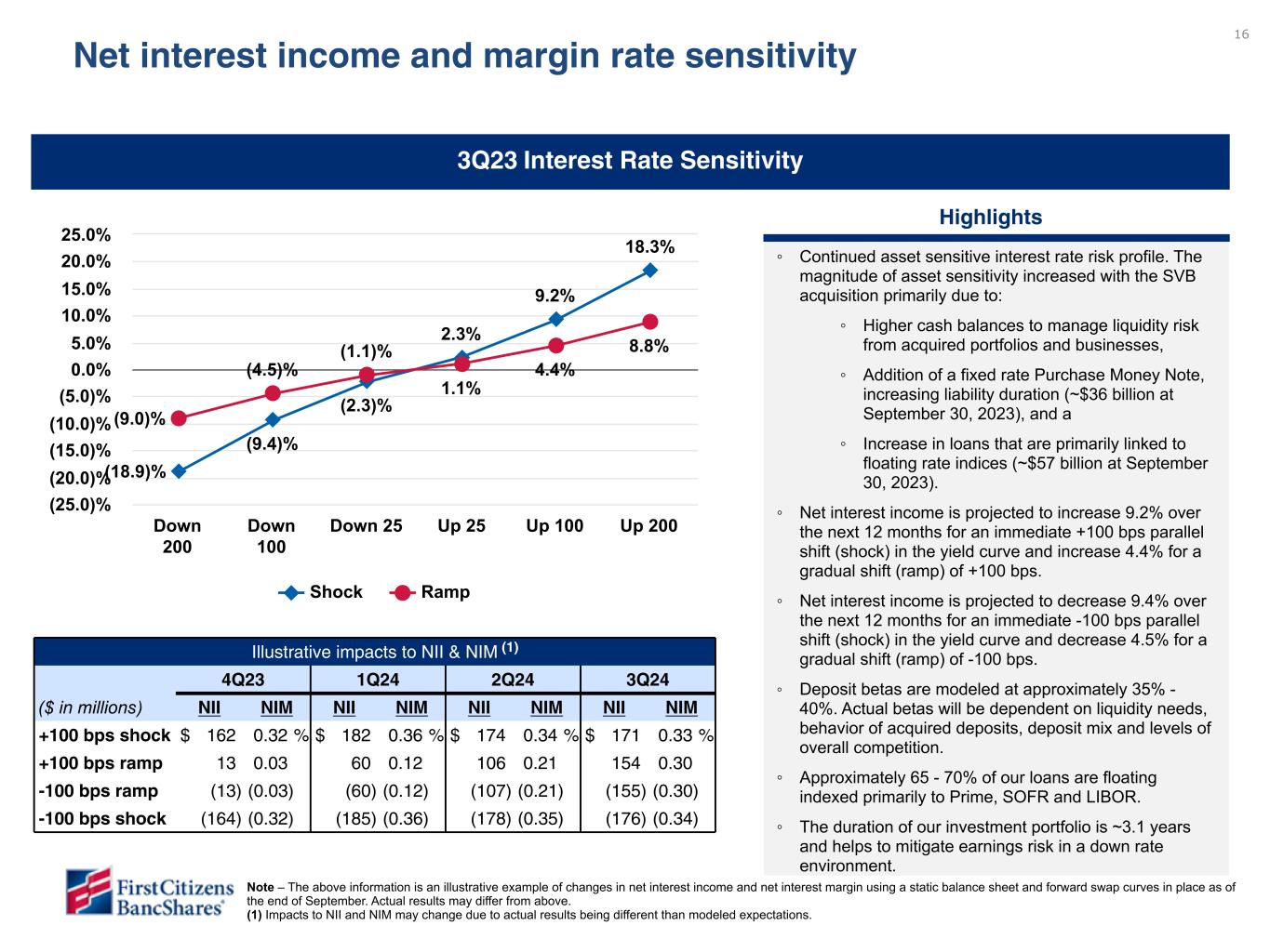 32 9.31% 8.99% 16.72% 9.50% 9.72% Tier 1 Leverage ratio 3Q22 4Q22 1Q23 2Q23 3Q23 Risk-based capital ratios Capital ratio rollforward Tier 1 Leverage ratio Tangible book value per share (Non-GAAP) Capital Risk-Based Capital Tier 1 Leverage Total Tier 1 CET1 December 31, 2022 13.18 % 11.06 % 10.08 % 8.99 % SVB acquisition - net 1.63 % 1.91 % 2.28 % 0.05 % Net income 1.28 % 1.28 % 1.28 % 1.17 % Change in risk-weighted/average assets 0.64 % 0.57 % 0.55 % -0.45 % Sub debt phase-out -0.10 % 0.00 % 0.00 % 0.00 % Shared loss agreement coverage runoff -1.06 % -0.94 % -0.90 % 0.00 % Common dividends -0.03 % -0.03 % -0.03 % -0.02 % Preferred dividends -0.04 % -0.04 % -0.03 % -0.03 % Other 0.14 % 0.01 % 0.00 % 0.01 % September 30, 2023 15.64 % 13.82 % 13.23 % 9.72 % Change since December 31, 2022 2.46 % 2.76 % 3.15 % 0.73 % Note – The above capital ratios represent BancShares ratios and are preliminary pending completion of quarterly regulatory filings. Refer to Section V of this presentation for a reconciliation of Non-GAAP measures to the most directly comparable GAAP measure. (1) The Tier 1 Leverage ratio for 1Q23 only includes the impact of SVB for five days. 10.37% 10.08% 12.53% 13.38% 13.23% 11.36% 11.06% 13.13% 14.00% 13.82%13.46% 13.18% 14.86% 15.84% 15.64% CET1 Tier 1 Total 3Q22 4Q22 1Q23 2Q23 3Q23 $571.89 $627.58 $109.82 ($10.04) ($2.25) $1,297.00 4Q22 SVB acquisition Retained earnings AOCI Common dividends 3Q23(1)