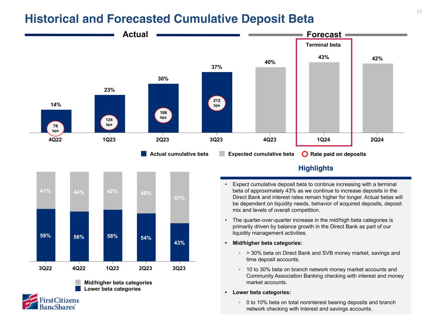 16 3Q23 Interest Rate Sensitivity Highlights ◦ Continued asset sensitive interest rate risk profile. The magnitude of asset sensitivity increased with the SVB acquisition primarily due to: ◦ Higher cash balances to manage liquidity risk from acquired portfolios and businesses, ◦ Addition of a fixed rate Purchase Money Note, increasing liability duration (~$36 billion at September 30, 2023), and a ◦ Increase in loans that are primarily linked to floating rate indices (~$57 billion at September 30, 2023). ◦ Net interest income is projected to increase 9.2% over the next 12 months for an immediate +100 bps parallel shift (shock) in the yield curve and increase 4.4% for a gradual shift (ramp) of +100 bps. ◦ Net interest income is projected to decrease 9.4% over the next 12 months for an immediate -100 bps parallel shift (shock) in the yield curve and decrease 4.5% for a gradual shift (ramp) of -100 bps. ◦ Deposit betas are modeled at approximately 35% - 40%. Actual betas will be dependent on liquidity needs, behavior of acquired deposits, deposit mix and levels of overall competition. ◦ Approximately 65 - 70% of our loans are floating indexed primarily to Prime, SOFR and LIBOR. ◦ The duration of our investment portfolio is ~3.1 years and helps to mitigate earnings risk in a down rate environment. (18.9)% (9.4)% (2.3)% 2.3% 9.2% 18.3% (9.0)% (4.5)% (1.1)% 1.1% 4.4% 8.8% Shock Ramp Down 200 Down 100 Down 25 Up 25 Up 100 Up 200 (25.0)% (20.0)% (15.0)% (10.0)% (5.0)% 0.0% 5.0% 10.0% 15.0% 20.0% 25.0% Illustrative impacts to NII & NIM 4Q23 1Q24 2Q24 3Q24 ($ in millions) NII NIM NII NIM NII NIM NII NIM +100 bps shock $ 162 0.32 % $ 182 0.36 % $ 174 0.34 % $ 171 0.33 % +100 bps ramp 13 0.03 60 0.12 106 0.21 154 0.30 -100 bps ramp (13) (0.03) (60) (0.12) (107) (0.21) (155) (0.30) -100 bps shock (164) (0.32) (185) (0.36) (178) (0.35) (176) (0.34) (1) Net interest income and margin rate sensitivity Note – The above information is an illustrative example of changes in net interest income and net interest margin using a static balance sheet and forward swap curves in place as of the end of September. Actual results may differ from above. (1) Impacts to NII and NIM may change due to actual results being different than modeled expectations.