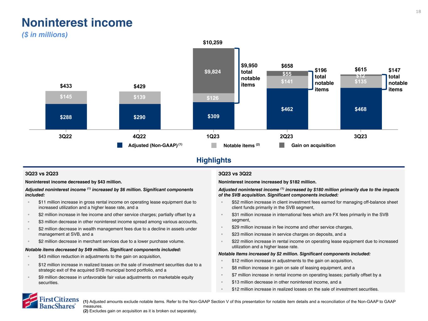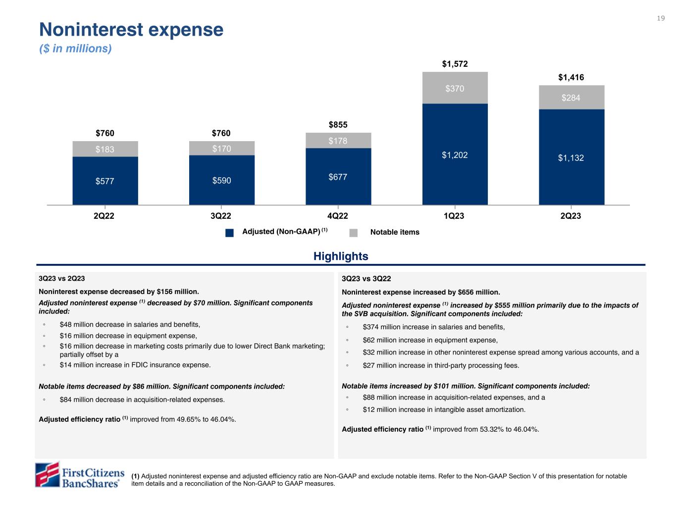 18 $433 $429 $658 $615 $288 $290 $309 $462 $468 $145 $139 $141 $135 $55 $12 3Q22 4Q22 1Q23 2Q23 3Q23 $295 $135 1Q23 SVB contribution $1,940 $2,136 $996 $1,141 $944 $995 YTD Dec 21 YTD Dec 22 3Q23 vs 2Q23 Noninterest income decreased by $43 million. Adjusted noninterest income (1) increased by $6 million. Significant components included: ◦ $11 million increase in gross rental income on operating lease equipment due to increased utilization and a higher lease rate, and a ◦ $2 million increase in fee income and other service charges; partially offset by a ◦ $3 million decrease in other noninterest income spread among various accounts, ◦ $2 million decrease in wealth management fees due to a decline in assets under management at SVB, and a ◦ $2 million decrease in merchant services due to a lower purchase volume. Notable items decreased by $49 million. Significant components included: ◦ $43 million reduction in adjustments to the gain on acquisition, ◦ $12 million increase in realized losses on the sale of investment securities due to a strategic exit of the acquired SVB municipal bond portfolio, and a ◦ $9 million decrease in unfavorable fair value adjustments on marketable equity securities. YTD22 vs YTD21 Noninterest income increased $196 million. Significant components of the change were: ◦ Rental income on operating leases increased $91 million due to the same reasons as in the linked quarter. Expenses on operating lease equipment declined $16 million resulting in a $107 million increase in adjusted rental income. ◦ Cardholder services income, net increased $15 million due to higher volume and fee income and other service charges increased $14 million, primarily due to higher capital markets and portfolio servicing fees. ◦ Wealth management services increased $13 million due to increased brokerage transactions and higher assets under management. ◦ Other noninterest income increased $63 million spread among various line items, including a $431 million bargain purchase gain, partially offset by a $147 million decline in investment gains and a $188 million decline in gains on asset and loan sales. Highlights Noninterest income ($ in millions) Core: ### increase 3Q23 vs 3Q22 Noninterest income increased by $182 million. Adjusted noninterest income (1) increased by $180 million primarily due to the impacts of the SVB acquisition. Significant components included: ◦ $52 million increase in client investment fees earned for managing off-balance sheet client funds primarily in the SVB segment, ◦ $31 million increase in international fees which are FX fees primarily in the SVB segment, ◦ $29 million increase in fee income and other service charges, ◦ $23 million increase in service charges on deposits, and a ◦ $22 million increase in rental income on operating lease equipment due to increased utilization and a higher lease rate. Notable Items increased by $2 million. Significant components included: ◦ $12 million increase in adjustments to the gain on acquisition, ◦ $8 million increase in gain on sale of leasing equipment, and a ◦ $7 million increase in rental income on operating leases; partially offset by a ◦ $13 million decrease in other noninterest income, and a ◦ $12 million increase in realized losses on the sale of investment securities. (1) Adjusted amounts exclude notable items. Refer to the Non-GAAP Section V of this presentation for notable item details and a reconciliation of the Non-GAAP to GAAP measures. (2) Excludes gain on acquisition as it is broken out separately. $10,259 $126 Adjusted (Non-GAAP) (1) Notable items (2) Gain on acquisition $9,824 $145 - total notable items $147 - total notable items $468 - total adjusted (Non-GAAP) (1) $9,950 total notable items $196 total notable items $147 total notable items