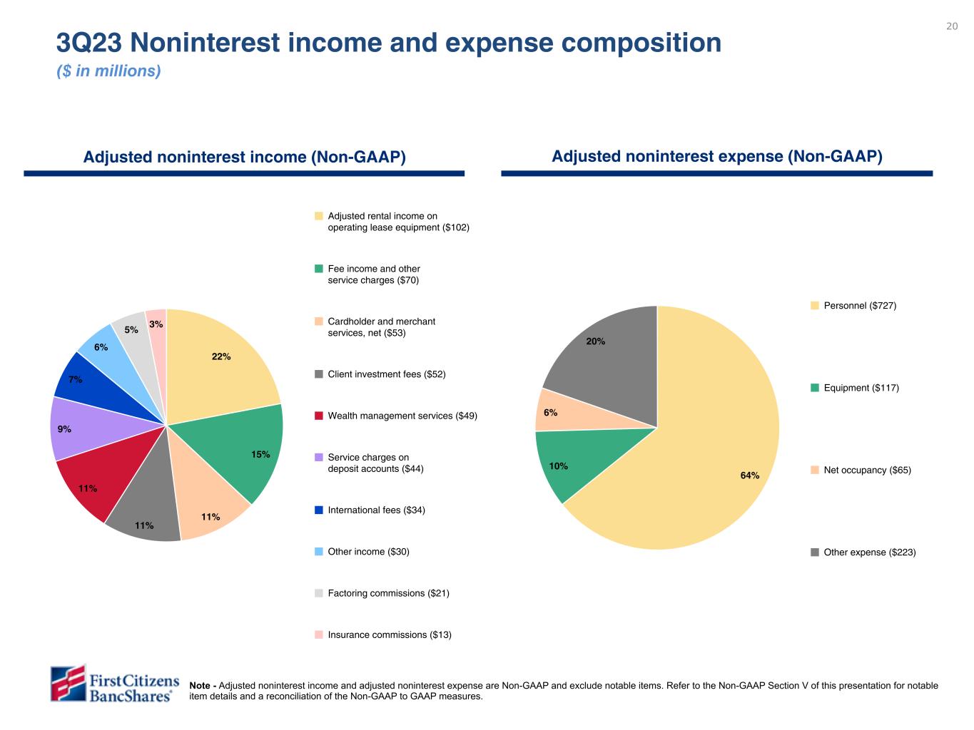 19 Notable items $760 $760 $855 $1,572 $1,416 $577 $590 $677 $1,202 $1,132 $183 $170 $178 $370 $284 2Q22 3Q22 4Q22 1Q23 2Q23 Highlights 3Q23 vs 3Q22 Noninterest expense increased by $656 million. Adjusted noninterest expense (1) increased by $555 million primarily due to the impacts of the SVB acquisition. Significant components included: ◦ $374 million increase in salaries and benefits, ◦ $62 million increase in equipment expense, ◦ $32 million increase in other noninterest expense spread among various accounts, and a ◦ $27 million increase in third-party processing fees. Notable items increased by $101 million. Significant components included: ◦ $88 million increase in acquisition-related expenses, and a ◦ $12 million increase in intangible asset amortization. Adjusted efficiency ratio (1) improved from 53.32% to 46.04%. 3Q23 vs 2Q23 Noninterest expense decreased by $156 million. Adjusted noninterest expense (1) decreased by $70 million. Significant components included: ◦ $48 million decrease in salaries and benefits, ◦ $16 million decrease in equipment expense, ◦ $16 million decrease in marketing costs primarily due to lower Direct Bank marketing; partially offset by a ◦ $14 million increase in FDIC insurance expense. Notable items decreased by $86 million. Significant components included: ◦ $84 million decrease in acquisition-related expenses. Adjusted efficiency ratio (1) improved from 49.65% to 46.04%. YTD22 vs YTD21 Noninterest expense increased $252 million. Significant components of the change were: ◦ Merger-related expenses increased $194 million. ◦ Salaries and benefits expense increased $53 million as a result of merger-related costs, wage increases, revenue- based incentives and temporary personnel costs, partially offset by net staff reductions. ◦ Marketing costs increased $23 million due to the same reasons as the quarterly increases. ◦ Third-party processing expenses increased $14 million and other operating expenses increased $14 million; ◦ Partially offset by an $18 million reduction in FDIC insurance premiums, a $16 million decline in expenses on operating leases, and a $12 million reduction in professional fees. Efficiency ratio improved from 64.43% to 60.50%. Adjusted efficiency ratio improved from 64.34% to 56.40% as adjusted net revenue grew 19% and adjusted noninterest expense grew 4%. Noninterest expense ($ in millions) $2,823 $3,075 $2,212 $2,305 $611 $770 YTD Dec 21 YTD Dec 22 Adjusted (Non-GAAP) (1) (1) Adjusted noninterest expense and adjusted efficiency ratio are Non-GAAP and exclude notable items. Refer to the Non-GAAP Section V of this presentation for notable item details and a reconciliation of the Non-GAAP to GAAP measures.