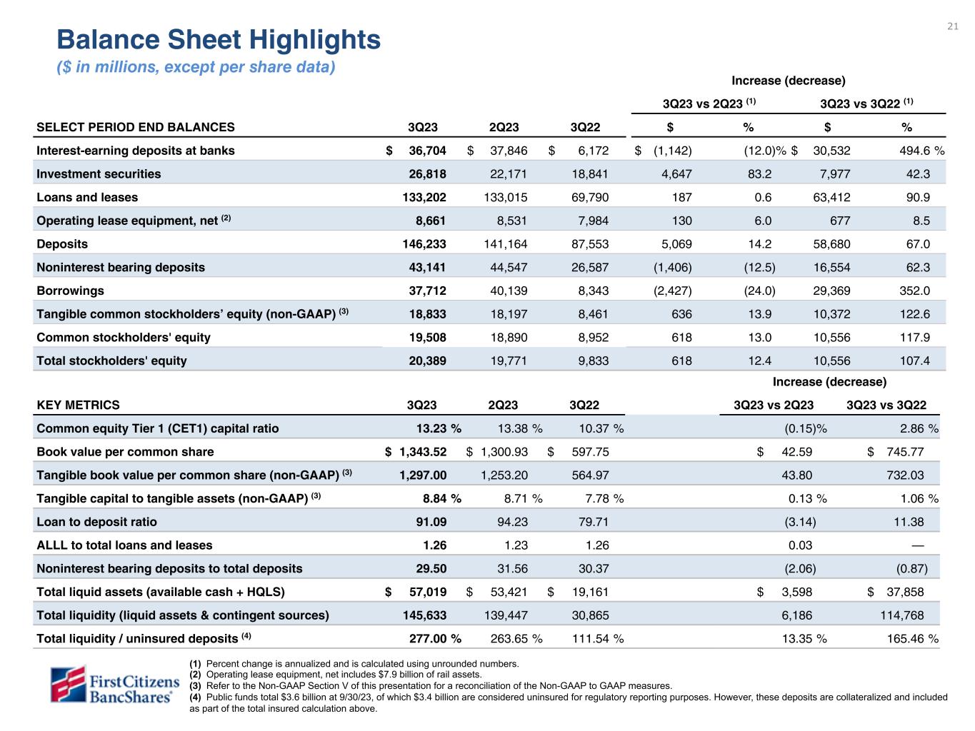 36 Sep 30, 2023 Jun 30, 2023 Mar 31, 2023 Dec 31, 2022 Sep 30, 2022 ASSETS Cash and due from banks $ 791 $ 917 $ 1,598 $ 518 $ 481 Interest-earning deposits at banks 36,704 37,846 38,522 5,025 6,172 Securities purchased under agreements to resell 549 298 — — — Investment in marketable equity securities 75 76 85 95 92 Investment securities available for sale 16,661 11,894 9,061 8,995 9,088 Investment securities held to maturity 10,082 10,201 10,381 10,279 9,661 Assets held for sale 58 117 94 60 21 Loans and leases 133,202 133,015 138,288 70,781 69,790 Allowance for loan and lease losses (1,673) (1,637) (1,605) (922) (882) Loans and leases, net of allowance for loan and lease losses 131,529 131,378 136,683 69,859 68,908 Operating lease equipment, net 8,661 8,531 8,331 8,156 7,984 Premises and equipment, net 1,768 1,782 1,743 1,456 1,410 Goodwill 346 346 346 346 346 Other intangible assets 329 347 364 140 145 Other assets 6,212 5,769 7,450 4,369 5,002 Total assets $ 213,765 $ 209,502 $ 214,658 $ 109,298 $ 109,310 LIABILITIES Deposits: Noninterest-bearing $ 43,141 $ 44,547 $ 54,649 $ 24,922 $ 26,587 Interest-bearing 103,092 96,617 85,401 64,486 60,966 Total deposits 146,233 141,164 140,050 89,408 87,553 Credit balances of factoring clients 1,282 1,067 1,126 995 1,147 Short-term borrowings 453 454 1,009 2,186 3,128 Long-term borrowings 37,259 39,685 45,085 4,459 5,215 Total borrowings 37,712 40,139 46,094 6,645 8,343 Other liabilities 8,149 7,361 8,172 2,588 2,434 Total liabilities 193,376 189,731 195,442 99,636 99,477 STOCKHOLDERS’ EQUITY Preferred stock 881 881 881 881 881 Common stock 15 15 15 15 15 Additional paid in capital 4,106 4,106 4,104 4,109 4,506 Retained earnings 16,267 15,541 14,885 5,392 5,160 Accumulated other comprehensive (loss) income (880) (772) (669) (735) (729) Total stockholders’ equity 20,389 19,771 19,216 9,662 9,833 Total liabilities and stockholders’ equity $ 213,765 $ 209,502 $ 214,658 $ 109,298 $ 109,310 BancShares Balance Sheets (unaudited) ($ in millions)