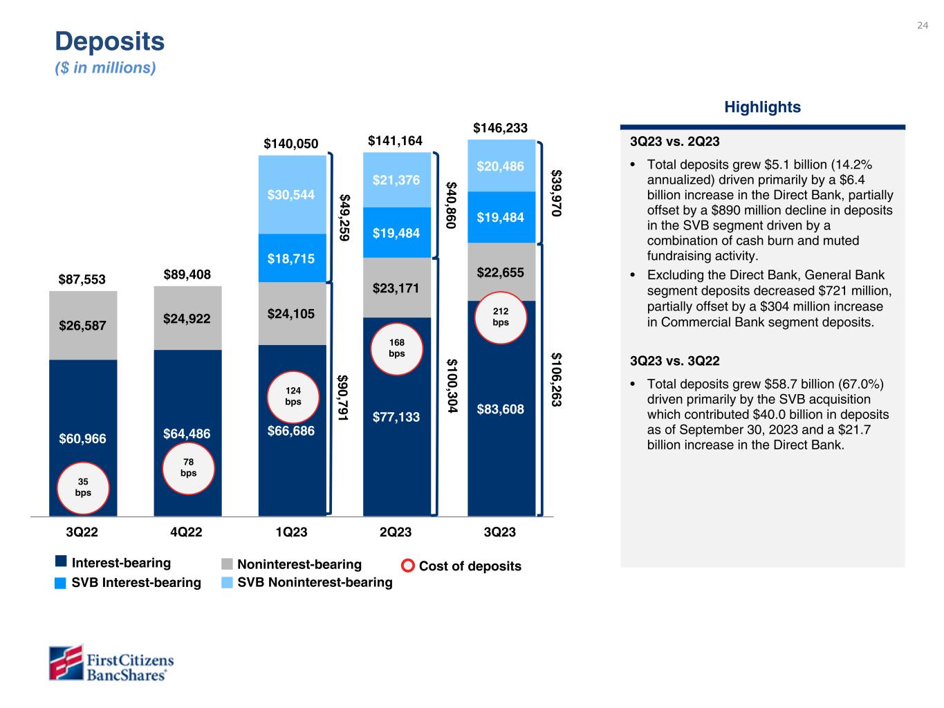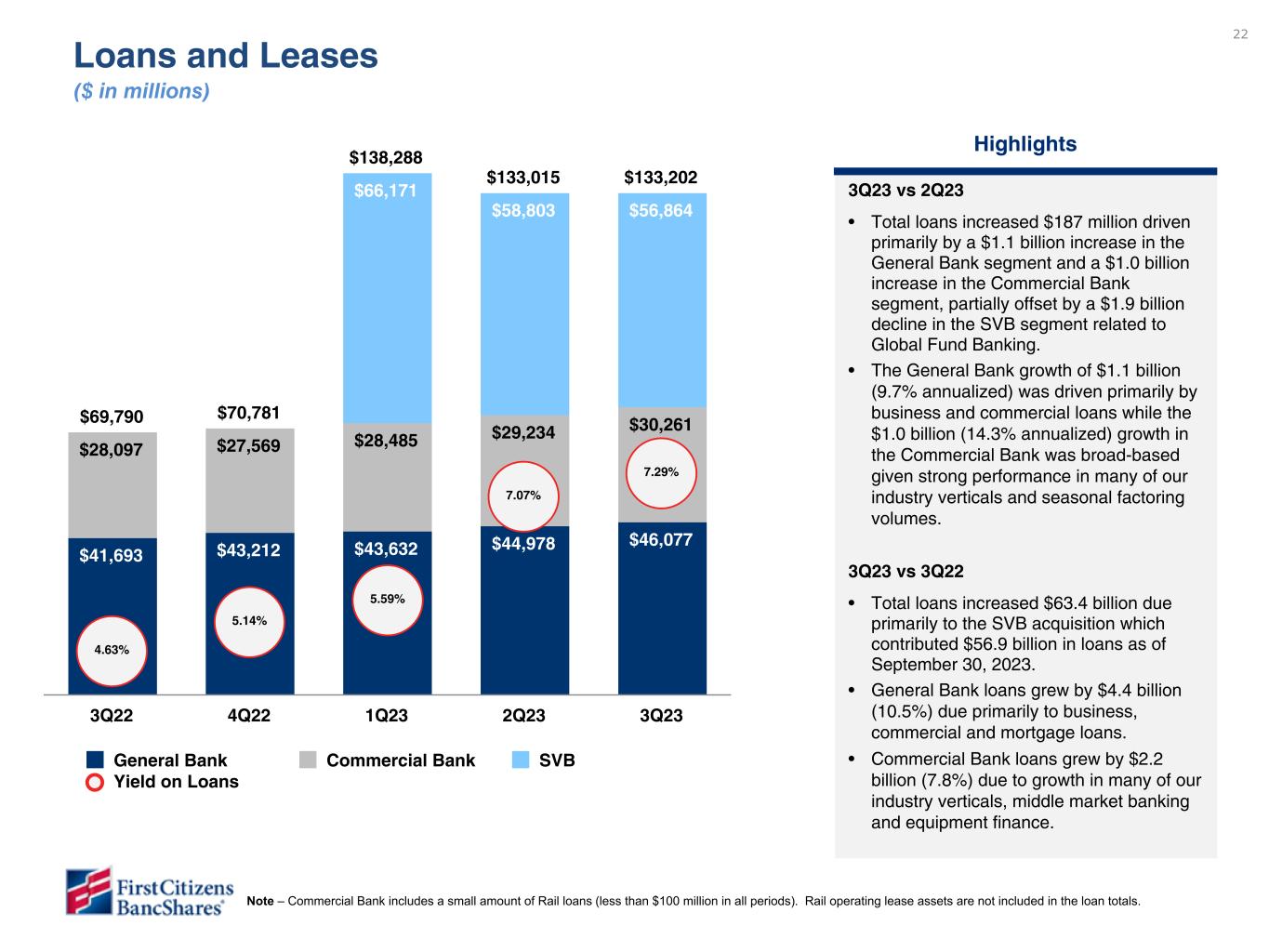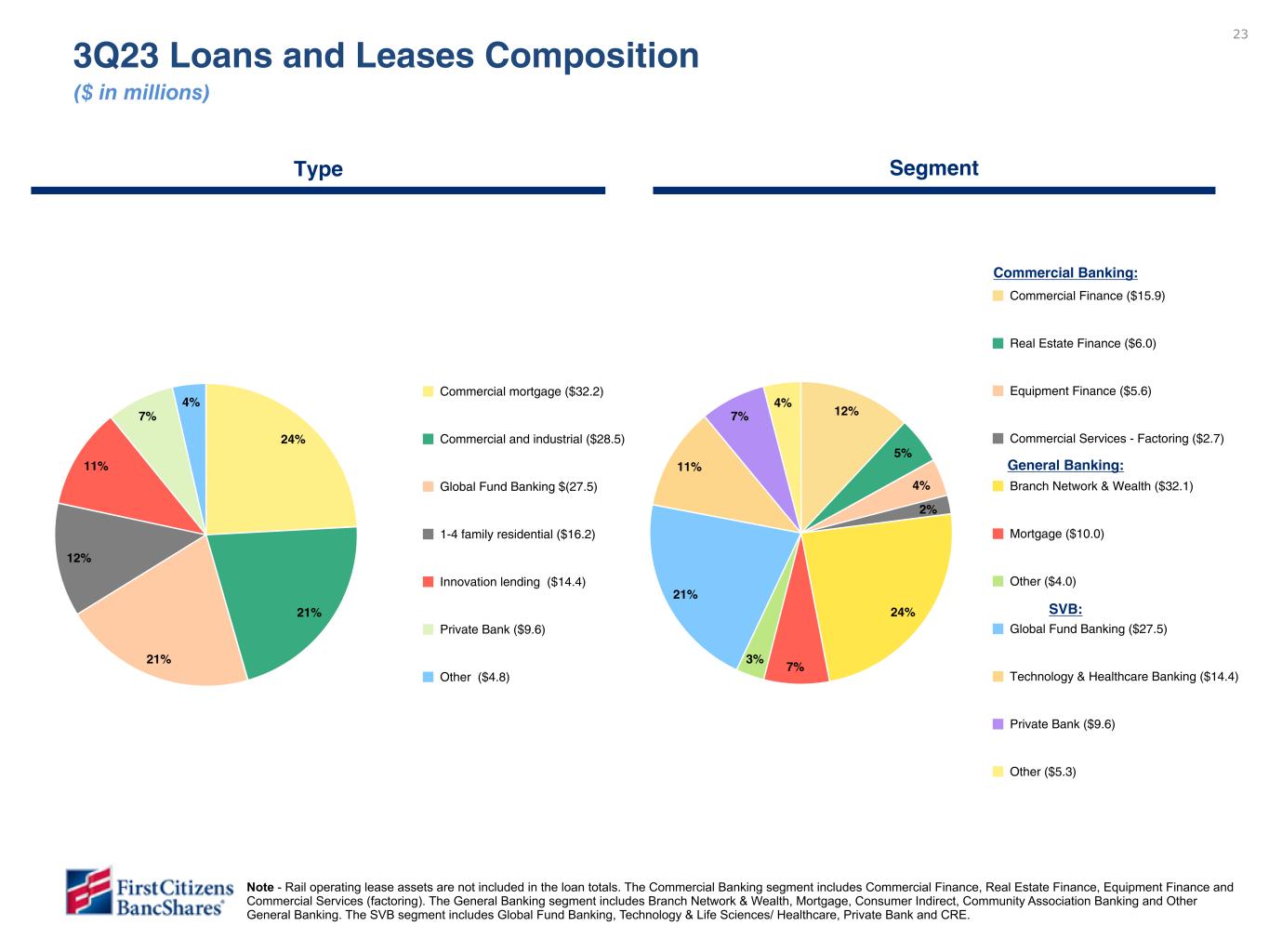 22 $69,790 $70,781 $138,288 $133,015 $133,202 $41,693 $43,212 $43,632 $44,978 $46,077 $28,097 $27,569 $28,485 $29,234 $30,261 $66,171 $58,803 $56,864 General Bank Commercial Bank SVB Yield on Loans 3Q22 4Q22 1Q23 2Q23 3Q23 Highlights 3Q23 vs 2Q23 • Total loans increased $187 million driven primarily by a $1.1 billion increase in the General Bank segment and a $1.0 billion increase in the Commercial Bank segment, partially offset by a $1.9 billion decline in the SVB segment related to Global Fund Banking. • The General Bank growth of $1.1 billion (9.7% annualized) was driven primarily by business and commercial loans while the $1.0 billion (14.3% annualized) growth in the Commercial Bank was broad-based given strong performance in many of our industry verticals and seasonal factoring volumes. 3Q23 vs 3Q22 • Total loans increased $63.4 billion due primarily to the SVB acquisition which contributed $56.9 billion in loans as of September 30, 2023. • General Bank loans grew by $4.4 billion (10.5%) due primarily to business, commercial and mortgage loans. • Commercial Bank loans grew by $2.2 billion (7.8%) due to growth in many of our industry verticals, middle market banking and equipment finance. Loans and Leases ($ in millions) Note – Commercial Bank includes a small amount of Rail loans (less than $100 million in all periods). Rail operating lease assets are not included in the loan totals. 7.07% 5.59% 5.14% 4.63% 7.29% 10.1%