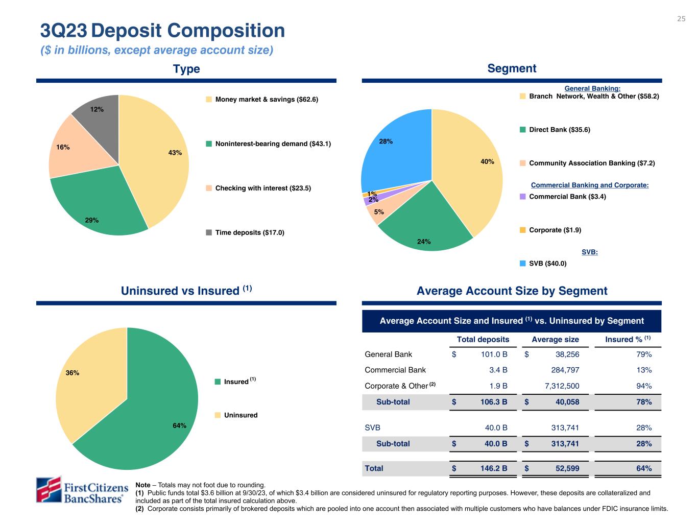 24 $87,553 $89,408 $140,050 $141,164 $146,233 $60,966 $64,486 $66,686 $77,133 $83,608 $26,587 $24,922 $24,105 $23,171 $22,655 $18,715 $19,484 $19,484 $30,544 $21,376 $20,486 3Q22 4Q22 1Q23 2Q23 3Q23 168 bps 124 bps 78 bps 35 bps 212 bps $106,263 $39,970 $40,860 $100,304 $49,259 $90,791 Highlights Deposits ($ in millions) $140,050 $66,686 $24,105 $18,715 $30,544 1Q23 SVB Interest-bearing SVB Noninterest-bearing Interest-bearing Noninterest-bearing Cost of deposits 3Q23 vs. 2Q23 • Total deposits grew $5.1 billion (14.2% annualized) driven primarily by a $6.4 billion increase in the Direct Bank, partially offset by a $890 million decline in deposits in the SVB segment driven by a combination of cash burn and muted fundraising activity. • Excluding the Direct Bank, General Bank segment deposits decreased $721 million, partially offset by a $304 million increase in Commercial Bank segment deposits. 3Q23 vs. 3Q22 • Total deposits grew $58.7 billion (67.0%) driven primarily by the SVB acquisition which contributed $40.0 billion in deposits as of September 30, 2023 and a $21.7 billion increase in the Direct Bank.