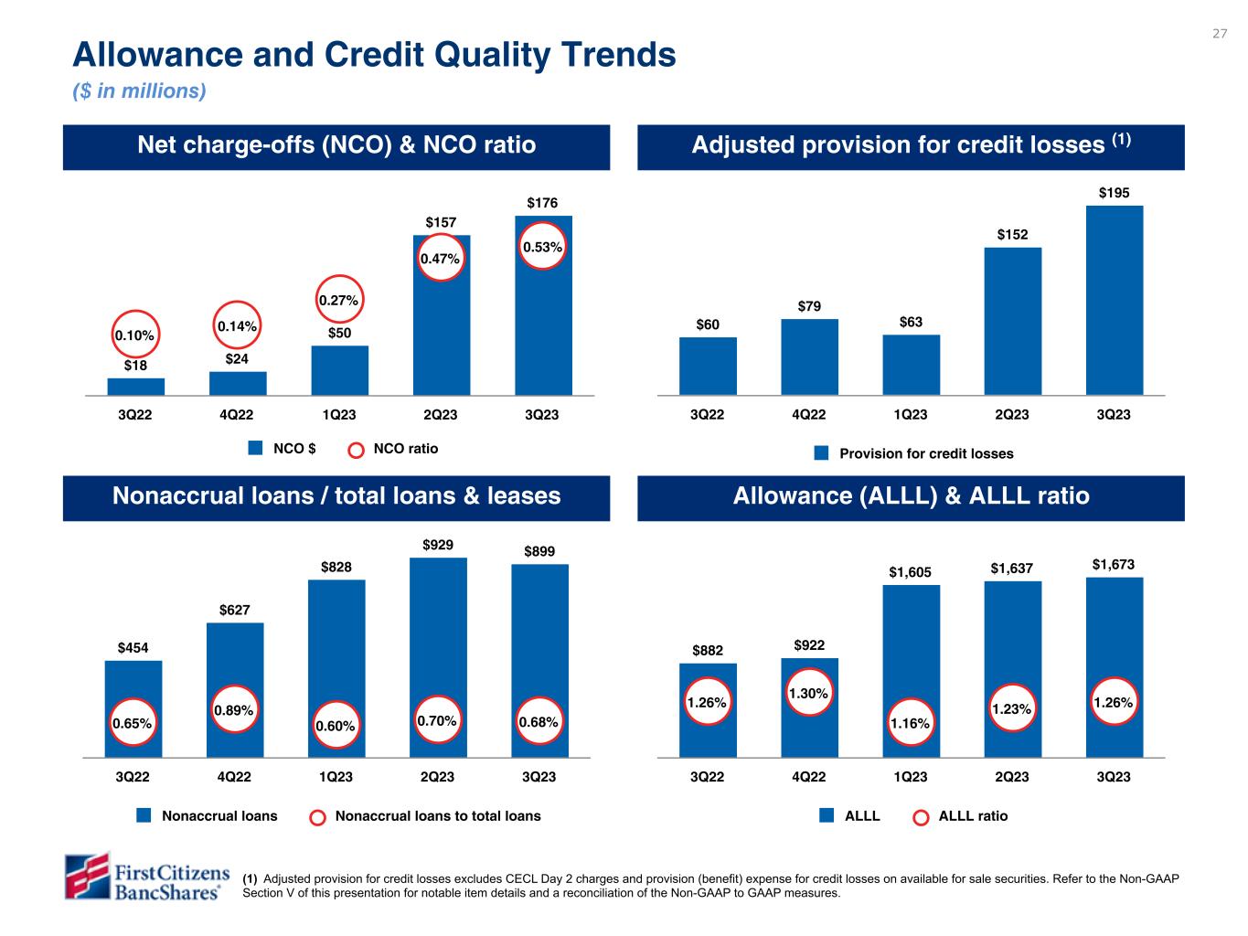27 $60 $79 $63 $152 $195 Provision for credit losses 3Q22 4Q22 1Q23 2Q23 3Q23 Allowance and Credit Quality Trends ($ in millions) Net charge-offs (NCO) & NCO ratio Adjusted provision for credit losses (1) $18 $24 $50 $157 $176 0.10% 0.14% 0.27% 0.47% 0.53% NCO $ NCO ratio 3Q22 4Q22 1Q23 2Q23 3Q23 $454 $627 $828 $929 $899 0.65% 0.89% 0.60% 0.70% 0.68% Nonaccrual loans Nonaccrual loans to total loans 3Q22 4Q22 1Q23 2Q23 3Q23 Nonaccrual loans / total loans & leases Allowance (ALLL) & ALLL ratio $882 $922 $1,605 $1,637 $1,673 1.26% 1.30% 1.16% 1.23% 1.26% ALLL ALLL ratio 3Q22 4Q22 1Q23 2Q23 3Q23 (1) Adjusted provision for credit losses excludes CECL Day 2 charges and provision (benefit) expense for credit losses on available for sale securities. Refer to the Non-GAAP Section V of this presentation for notable item details and a reconciliation of the Non-GAAP to GAAP measures. SEC calc - Key metrics & ratios SEC Master Income Statement SEC calc SEC calc SEC Master Income Statement Calc on Note 4 SEC Master Income Statement