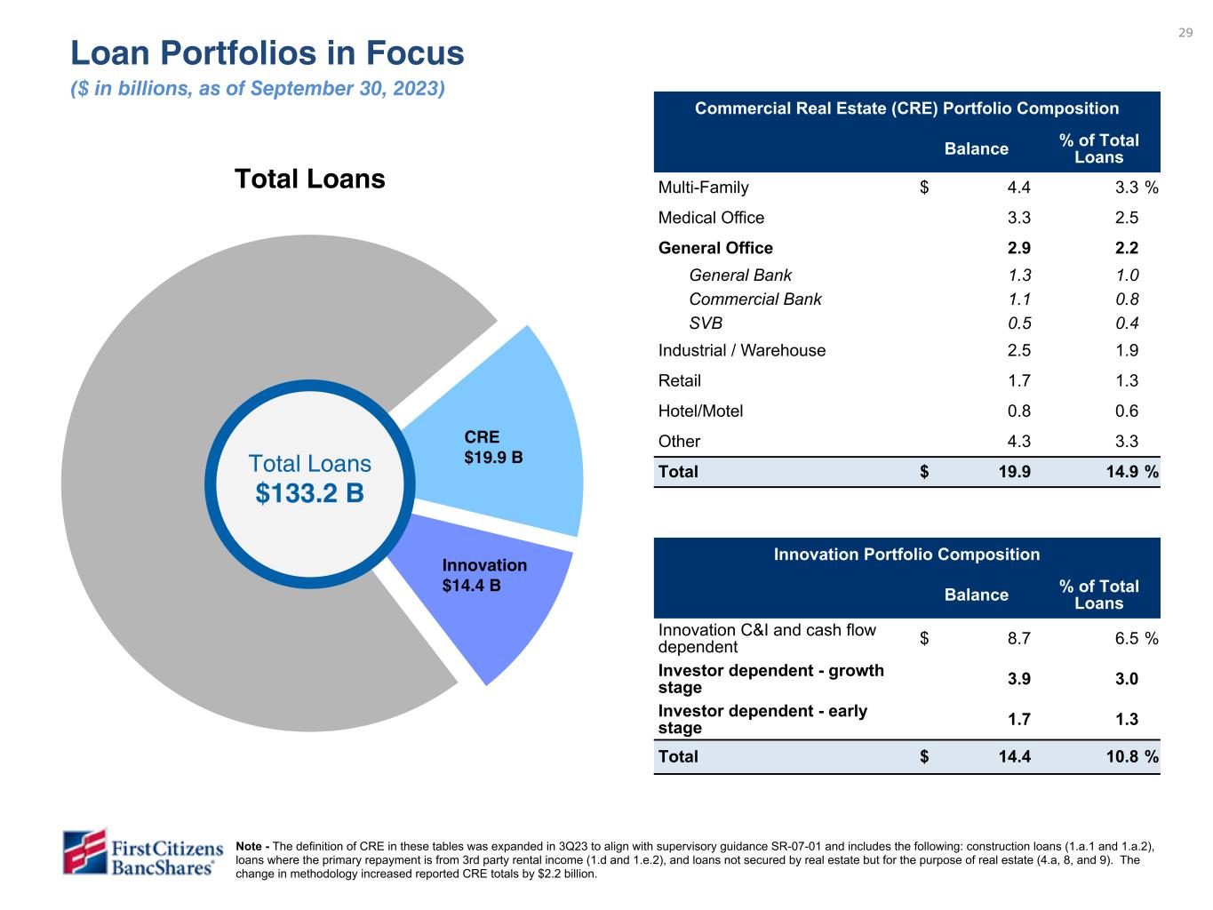 29 Loan Portfolios in Focus ($ in billions, as of September 30, 2023) Total Loans $133.2 B Total Loans CRE $19.9 B Commercial Real Estate (CRE) Portfolio Composition Balance % of Total Loans Multi-Family $ 4.4 3.3 % Medical Office 3.3 2.5 General Office 2.9 2.2 General Bank 1.3 1.0 Commercial Bank 1.1 0.8 SVB 0.5 0.4 Industrial / Warehouse 2.5 1.9 Retail 1.7 1.3 Hotel/Motel 0.8 0.6 Other 4.3 3.3 Total $ 19.9 14.9 % Note - The definition of CRE in these tables was expanded in 3Q23 to align with supervisory guidance SR-07-01 and includes the following: construction loans (1.a.1 and 1.a.2), loans where the primary repayment is from 3rd party rental income (1.d and 1.e.2), and loans not secured by real estate but for the purpose of real estate (4.a, 8, and 9). The change in methodology increased reported CRE totals by $2.2 billion. SEC Master Balance Sheet CRE and Office Charts - Tim Farmer Add footnote that % are full precision and cannot be recalculated? CRE and Office Charts - Tim Farmer IR calcs Innovation Portfolio Composition Balance % of Total Loans Innovation C&I and cash flow dependent $ 8.7 6.5 % Investor dependent - growth stage 3.9 3.0 Investor dependent - early stage 1.7 1.3 Total $ 14.4 10.8 % Innovation $14.4 B