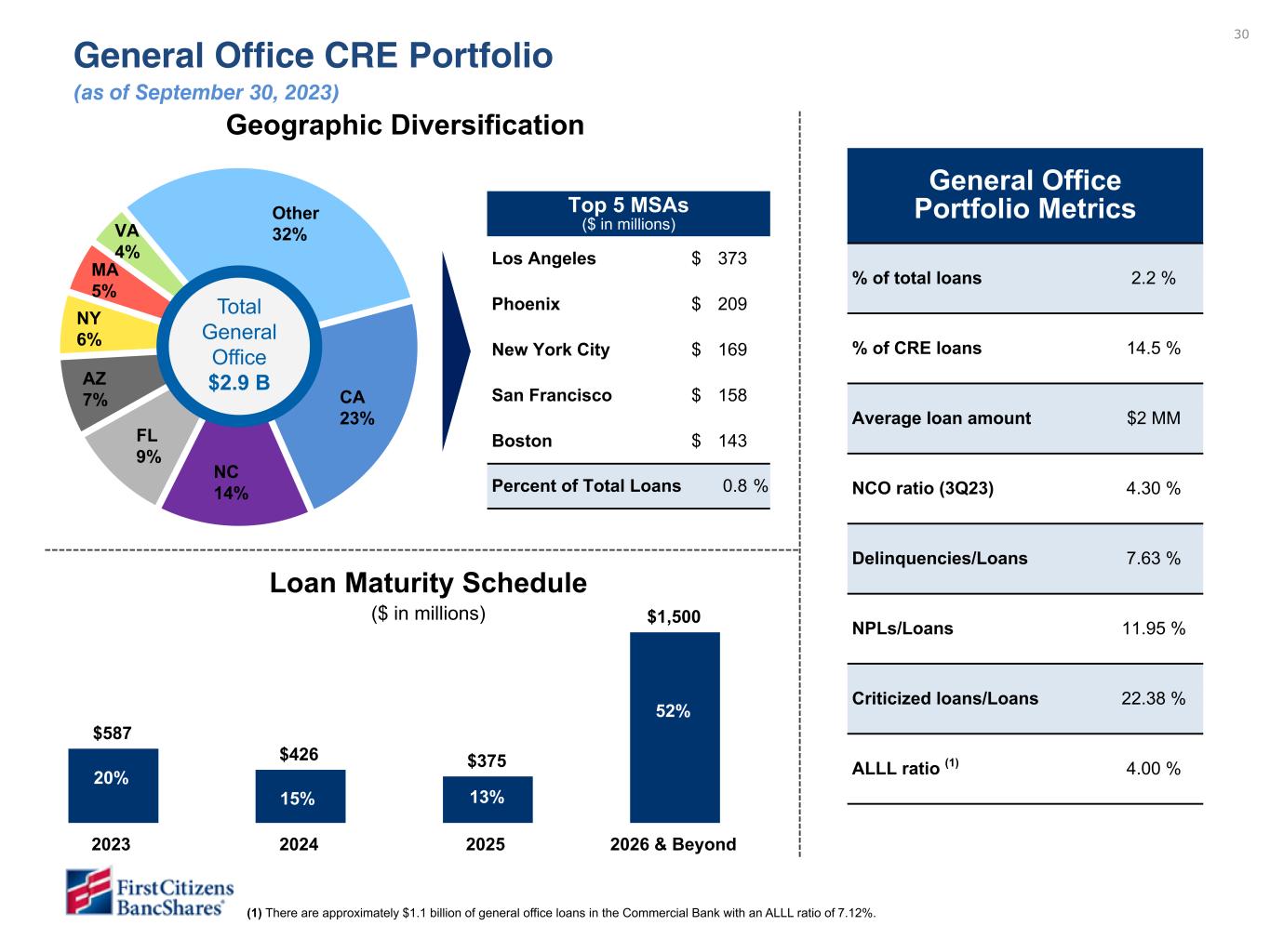 30 General Office CRE Portfolio (as of September 30, 2023) CA 23% NC 14% FL 9% AZ 7% NY 6% MA 5% VA 4% Other 32% Total General Office $2.9 B Geographic Diversification $587 $426 $375 $1,500 2023 2024 2025 2026 & Beyond Loan Maturity Schedule ($ in millions) 20% 15% 13% 52% (1) There are approximately $1.1 billion of general office loans in the Commercial Bank with an ALLL ratio of 7.12%. Top 5 MSAs ($ in millions) Los Angeles $ 373 Phoenix $ 209 New York City $ 169 San Francisco $ 158 Boston $ 143 Percent of Total Loans 0.8 % General Office Portfolio Metrics % of total loans 2.2 % % of CRE loans 14.5 % Average loan amount $2 MM NCO ratio (3Q23) 4.30 % Delinquencies/Loans 7.63 % NPLs/Loans 11.95 % Criticized loans/Loans 22.38 % ALLL ratio (1) 4.00 % CRE and Office Charts - Tim Farmer IR calcs CRE and Office Charts - Tim Farmer IR calc IR calcs CRE and Office Charts - Tim Farmer IR calc IR calc CRE and Office Charts - Tim Farmer IR calc Ask Tim to add current quarter average CRE balance to file IR calc IR calc IR calc ACL Deck? ACL Deck?ACL Deck?