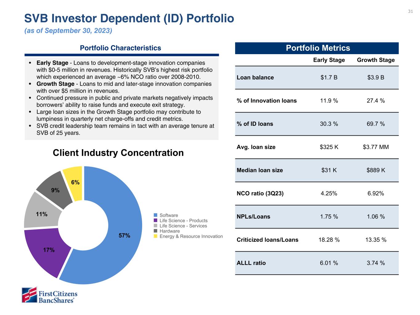31 SVB Investor Dependent (ID) Portfolio (as of September 30, 2023) Portfolio Metrics Early Stage Growth Stage Loan balance $1.7 B $3.9 B % of Innovation loans 11.9 % 27.4 % % of ID loans 30.3 % 69.7 % Avg. loan size $325 K $3.77 MM Median loan size $31 K $889 K NCO ratio (3Q23) 4.25% 6.92% NPLs/Loans 1.75 % 1.06 % Criticized loans/Loans 18.28 % 13.35 % ALLL ratio 6.01 % 3.74 % Software 57% Life Science - Products 17% Life Science - Services, 11% Hardware 9% Energy & Resource Innovation, 6% Client Industry Concentration Niche from Credit deck - is sub-niche available? Is there any industry specific story in the ID portfolio? What metrics make sense here? How can we demonstrate lumpiness in the portfolio? 2008-2010 NPL and NCO (bps) What is causing increased charge-offs? Companies unable to secure next round of funding? Are VCs pulling support from portfolio companies more than we anticipated? Portfolio Characteristics • Early Stage - Loans to development-stage innovation companies with $0-5 million in revenues. Historically SVB’s highest risk portfolio which experienced an average ~6% NCO ratio over 2008-2010. • Growth Stage - Loans to mid and later-stage innovation companies with over $5 million in revenues. • Continued pressure in public and private markets negatively impacts borrowers’ ability to raise funds and execute exit strategy. • Large loan sizes in the Growth Stage portfolio may contribute to lumpiness in quarterly net charge-offs and credit metrics. • SVB credit leadership team remains in tact with an average tenure at SVB of 25 years. PLEASE DO NOT REVIEW Data Unavailable & slide remains under development with credit 57% 17% 11% 9% 6% Software Life Science - Products Life Science - Services Hardware Energy & Resource Innovation