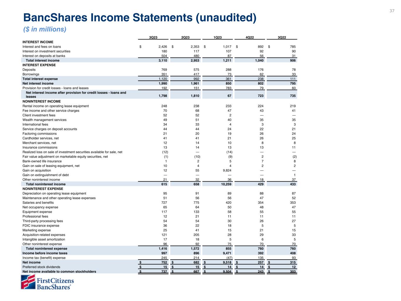 37 3Q23 2Q23 1Q23 4Q22 3Q22 INTEREST INCOME Interest and fees on loans $ 2,426 $ 2,353 $ 1,017 $ 892 $ 785 Interest on investment securities 180 117 107 92 90 Interest on deposits at banks 504 480 87 56 31 Total interest income 3,110 2,953 1,211 1,040 906 INTEREST EXPENSE Deposits 769 575 288 176 78 Borrowings 351 417 73 62 33 Total interest expense 1,120 992 361 238 111 Net interest income 1,990 1,961 850 802 795 Provision for credit losses - loans and leases 192 151 783 79 60 Net interest income after provision for credit losses - loans and leases 1,798 1,810 67 723 735 NONINTEREST INCOME Rental income on operating lease equipment 248 238 233 224 219 Fee income and other service charges 70 68 47 43 41 Client investment fees 52 52 2 — — Wealth management services 49 51 40 35 35 International fees 34 33 4 3 3 Service charges on deposit accounts 44 44 24 22 21 Factoring commissions 21 20 19 26 24 Cardholder services, net 41 41 21 26 25 Merchant services, net 12 14 10 8 8 Insurance commissions 13 14 13 13 11 Realized loss on sale of investment securities available for sale, net (12) — (14) — — Fair value adjustment on marketable equity securities, net (1) (10) (9) 2 (2) Bank-owned life insurance 1 2 5 7 8 Gain on sale of leasing equipment, net 10 4 4 2 2 Gain on acquisition 12 55 9,824 — — Gain on extinguishment of debt — — — — 1 Other noninterest income 21 32 36 18 37 Total noninterest income 615 658 10,259 429 433 NONINTEREST EXPENSE Depreciation on operating lease equipment 95 91 89 88 87 Maintenance and other operating lease expenses 51 56 56 47 52 Salaries and benefits 727 775 420 354 353 Net occupancy expense 65 64 50 48 47 Equipment expense 117 133 58 55 55 Professional fees 12 21 11 11 11 Third-party processing fees 54 54 30 26 27 FDIC insurance expense 36 22 18 5 5 Marketing expense 25 41 15 21 15 Acquisition-related expenses 121 205 28 29 33 Intangible asset amortization 17 18 5 6 5 Other noninterest expense 96 92 75 70 70 Total noninterest expense 1,416 1,572 855 760 760 Income before income taxes 997 896 9,471 392 408 Income tax (benefit) expense 245 214 (47) 135 93 Net income $ 752 $ 682 $ 9,518 $ 257 $ 315 Preferred stock dividends $ 15 $ 15 $ 14 $ 14 $ 12 Net income available to common stockholders $ 737 $ 667 $ 9,504 $ 243 $ 303 BancShares Income Statements (unaudited) ($ in millions)
