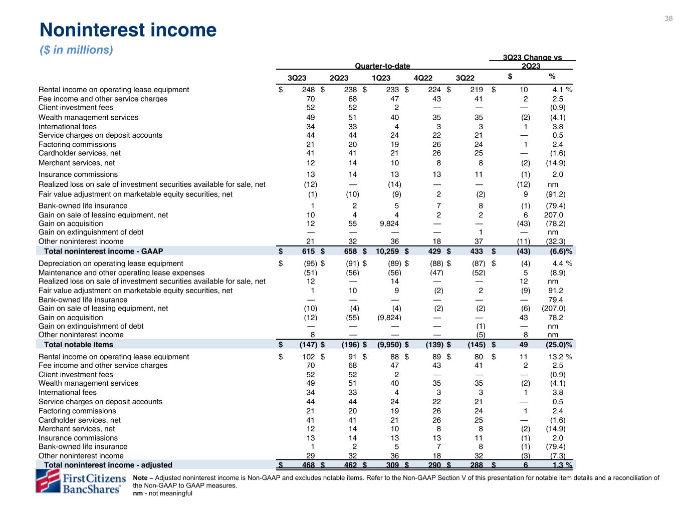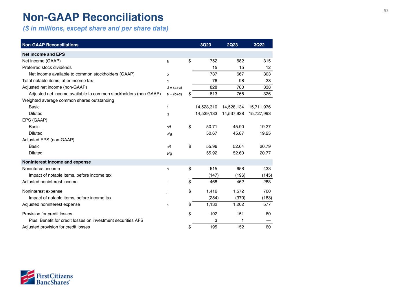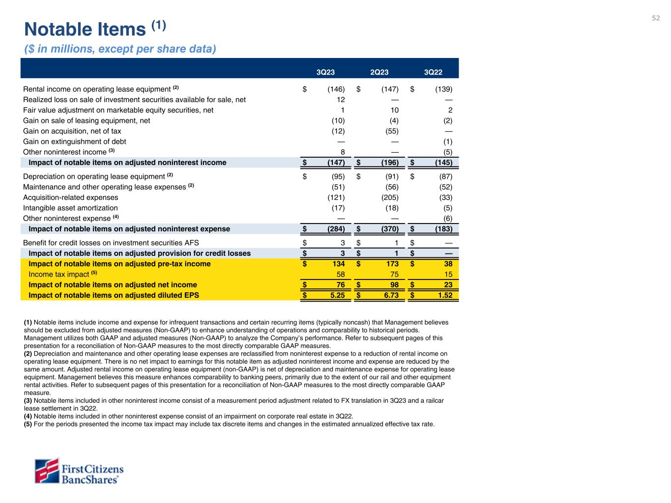 52 1Q23 4Q22 1Q22 Rental income on operating lease equipment (2) $ (146) $ (147) $ (139) Realized gain on sale of investment securities available for sale, net 12 — — Fair value adjustment on marketable equity securities, net 1 10 2 Gain on sale of leasing equipment, net (10) (4) (2) Gain on acquisition (12) (55) — Gain on extinguishment of debt — — (1) Other noninterest income(3) 8 — (5) Impact on adjusted noninterest income $ (147) $ (196) $ (145) Depreciation on operating lease equipment (2) $ (95) $ (91) $ (87) Maintenance and other operating lease expenses (2) (51) (56) (52) Salaries and benefits — — — Acquisition-related expenses (121) (205) (33) Intangible asset amortization (17) (18) (5) Other noninterest expense (4) — — (6) Impact on adjusted noninterest expense $ (284) $ (370) $ (183) CECL Day 2 provision and reserve for unfunded commitments — (716) — Provision for credit losses- investment securities available for sale 3 (4) — Provision for credit losses - total adjustments $ 3 $ 1 $ — Impact on adjusted pre-tax income $ 134 $ 173 $ 38 Income tax impact (5) (6) 58 75 15 Impact on adjusted net income $ 76 $ 98 $ 23 Impact on adjusted diluted EPS $ 5.25 $ 6.73 1.52 Notable Items (1) ($ in millions, except per share data) 3Q23 2Q23 3Q22 Rental income on operating lease equipment (2) $ (146) $ (147) $ (139) Realized loss on sale of investment securities available for sale, net 12 — — Fair value adjustment on marketable equity securities, net 1 10 2 Gain on sale of leasing equipment, net (10) (4) (2) Gain on acquisition, net of tax (12) (55) — Gain on extinguishment of debt — — (1) Other noninterest income (3) 8 — (5) Impact of notable items on adjusted noninterest income $ (147) $ (196) $ (145) Depreciation on operating lease equipment (2) $ (95) $ (91) $ (87) Maintenance and other operating lease expenses (2) (51) (56) (52) Acquisition-related expenses (121) (205) (33) Intangible asset amortization (17) (18) (5) Other noninterest expense (4) — — (6) Impact of notable items on adjusted noninterest expense $ (284) $ (370) $ (183) Benefit for credit losses on investment securities AFS $ 3 $ 1 $ — Impact of notable items on adjusted provision for credit losses $ 3 $ 1 $ — Impact of notable items on adjusted pre-tax income $ 134 $ 173 $ 38 Income tax impact (5) 58 75 15 Impact of notable items on adjusted net income $ 76 $ 98 $ 23 Impact of notable items on adjusted diluted EPS $ 5.25 $ 6.73 $ 1.52 (1) Notable items include income and expense for infrequent transactions and certain recurring items (typically noncash) that Management believes should be excluded from adjusted measures (Non-GAAP) to enhance understanding of operations and comparability to historical periods. Management utilizes both GAAP and adjusted measures (Non-GAAP) to analyze the Company’s performance. Refer to subsequent pages of this presentation for a reconciliation of Non-GAAP measures to the most directly comparable GAAP measures. (2) Depreciation and maintenance and other operating lease expenses are reclassified from noninterest expense to a reduction of rental income on operating lease equipment. There is no net impact to earnings for this notable item as adjusted noninterest income and expense are reduced by the same amount. Adjusted rental income on operating lease equipment (non-GAAP) is net of depreciation and maintenance expense for operating lease equipment. Management believes this measure enhances comparability to banking peers, primarily due to the extent of our rail and other equipment rental activities. Refer to subsequent pages of this presentation for a reconciliation of Non-GAAP measures to the most directly comparable GAAP measure. (3) Notable items included in other noninterest income consist of a measurement period adjustment related to FX translation in 3Q23 and a railcar lease settlement in 3Q22. (4) Notable items included in other noninterest expense consist of an impairment on corporate real estate in 3Q22. (5) For the periods presented the income tax impact may include tax discrete items and changes in the estimated annualized effective tax rate.