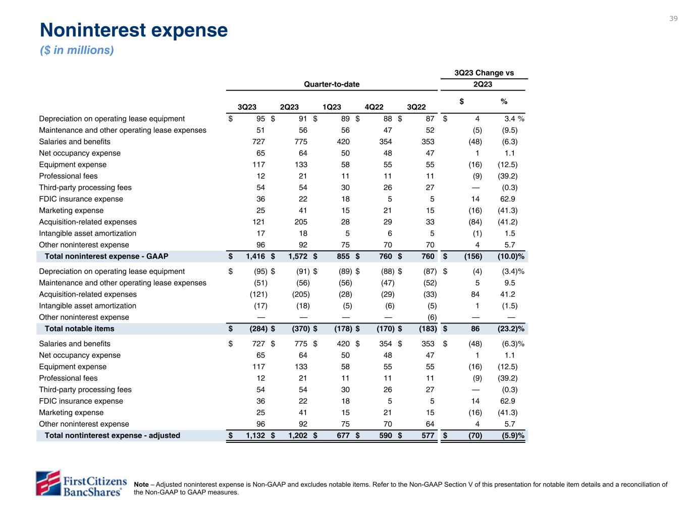 38 Noninterest income ($ in millions) 3Q23 Change vs Quarter-to-date 2Q23 3Q23 2Q23 1Q23 4Q22 3Q22 $ % Rental income on operating lease equipment $ 248 $ 238 $ 233 $ 224 $ 219 $ 10 4.1 % Fee income and other service charges 70 68 47 43 41 2 2.5 Client investment fees 52 52 2 — — — (0.9) Wealth management services 49 51 40 35 35 (2) (4.1) International fees 34 33 4 3 3 1 3.8 Service charges on deposit accounts 44 44 24 22 21 — 0.5 Factoring commissions 21 20 19 26 24 1 2.4 Cardholder services, net 41 41 21 26 25 — (1.6) Merchant services, net 12 14 10 8 8 (2) (14.9) Insurance commissions 13 14 13 13 11 (1) 2.0 Realized loss on sale of investment securities available for sale, net (12) — (14) — — (12) nm Fair value adjustment on marketable equity securities, net (1) (10) (9) 2 (2) 9 (91.2) Bank-owned life insurance 1 2 5 7 8 (1) (79.4) Gain on sale of leasing equipment, net 10 4 4 2 2 6 207.0 Gain on acquisition 12 55 9,824 — — (43) (78.2) Gain on extinguishment of debt — — — — 1 — nm Other noninterest income 21 32 36 18 37 (11) (32.3) Total noninterest income - GAAP $ 615 $ 658 $ 10,259 $ 429 $ 433 $ (43) (6.6) % Depreciation on operating lease equipment $ (95) $ (91) $ (89) $ (88) $ (87) $ (4) 4.4 % Maintenance and other operating lease expenses (51) (56) (56) (47) (52) 5 (8.9) Realized loss on sale of investment securities available for sale, net 12 — 14 — — 12 nm Fair value adjustment on marketable equity securities, net 1 10 9 (2) 2 (9) 91.2 Bank-owned life insurance — — — — — — 79.4 Gain on sale of leasing equipment, net (10) (4) (4) (2) (2) (6) (207.0) Gain on acquisition (12) (55) (9,824) — — 43 78.2 Gain on extinguishment of debt — — — — (1) — nm Other noninterest income 8 — — — (5) 8 nm Total notable items $ (147) $ (196) $ (9,950) $ (139) $ (145) $ 49 (25.0) % Rental income on operating lease equipment $ 102 $ 91 $ 88 $ 89 $ 80 $ 11 13.2 % Fee income and other service charges 70 68 47 43 41 2 2.5 Client investment fees 52 52 2 — — — (0.9) Wealth management services 49 51 40 35 35 (2) (4.1) International fees 34 33 4 3 3 1 3.8 Service charges on deposit accounts 44 44 24 22 21 — 0.5 Factoring commissions 21 20 19 26 24 1 2.4 Cardholder services, net 41 41 21 26 25 — (1.6) Merchant services, net 12 14 10 8 8 (2) (14.9) Insurance commissions 13 14 13 13 11 (1) 2.0 Bank-owned life insurance 1 2 5 7 8 (1) (79.4) Other noninterest income 29 32 36 18 32 (3) (7.3) Total noninterest income - adjusted $ 468 $ 462 $ 309 $ 290 $ 288 $ 6 1.3 % Note – Adjusted noninterest income is Non-GAAP and excludes notable items. Refer to the Non-GAAP Section V of this presentation for notable item details and a reconciliation of the Non-GAAP to GAAP measures. nm - not meaningful