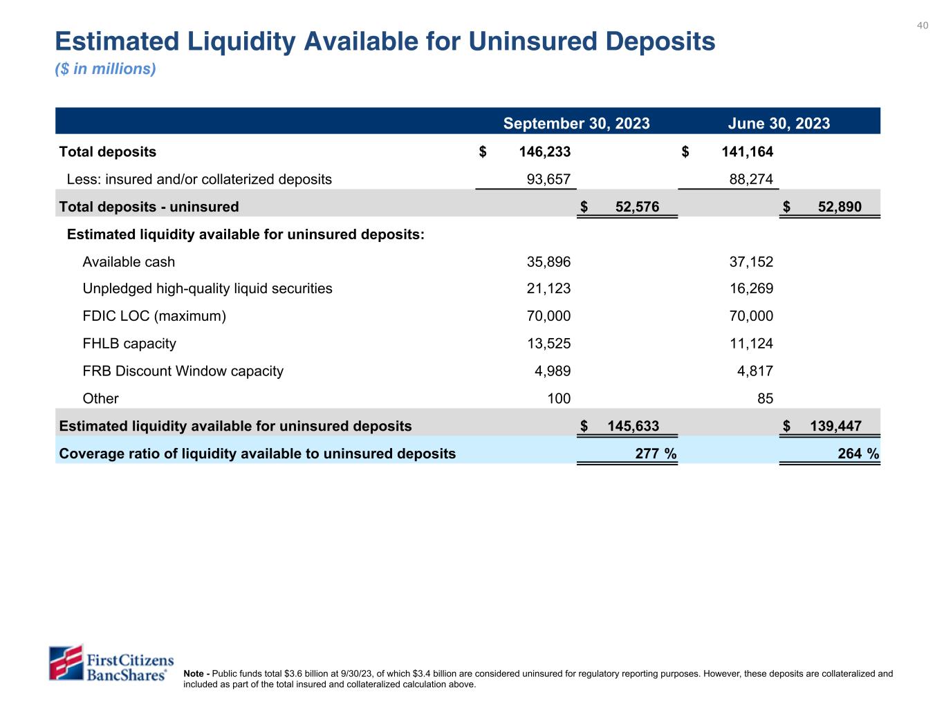 40 Estimated Liquidity Available for Uninsured Deposits ($ in millions) Total Deposits Less: Insured and/or collateralized deposits Total deposits - uninsured/ uncollateralized Estimated liquidity available for uninsured deposits: Immediately available cash Unpledged securities FDIC Line of Credit FHLB Fed Discount Window BTFP Program Estimated liquidity available for uninsured deposits Coverage ratio of liquidity available to uninsured and un-collateralized deposits $XX,XXX (XX,XXX) $X,XXX $X,XXX $X,XXX $X,XXX $X,XXX $XX,XXX $XX,XXX $XX,XXX September 30, 2023 June 30, 2023 Total deposits $ 146,233 $ 141,164 Less: insured and/or collaterized deposits 93,657 88,274 Total deposits - uninsured $ 52,576 $ 52,890 Estimated liquidity available for uninsured deposits: Available cash 35,896 37,152 Unpledged high-quality liquid securities 21,123 16,269 FDIC LOC (maximum) 70,000 70,000 FHLB capacity 13,525 11,124 FRB Discount Window capacity 4,989 4,817 Other 100 85 Estimated liquidity available for uninsured deposits $ 145,633 $ 139,447 Coverage ratio of liquidity available to uninsured deposits 277 % 264 % Note - Public funds total $3.6 billion at 9/30/23, of which $3.4 billion are considered uninsured for regulatory reporting purposes. However, these deposits are collateralized and included as part of the total insured and collateralized calculation above. SEC MD&A Liquidity Risk