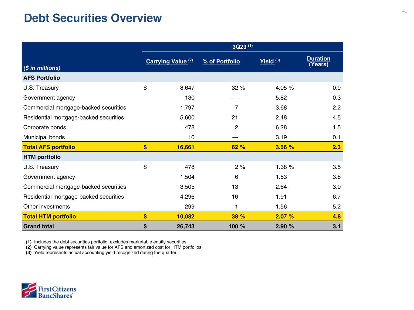 41 (1) (1) Includes the debt securities portfolio; excludes marketable equity securities. (2) Carrying value represents fair value for AFS and amortized cost for HTM portfolios. (3) Yield represents actual accounting yield recognized during the quarter. 3Q23 (1) ($ in millions) Carrying Value (2) % of Portfolio Yield (3) Duration (Years) AFS Portfolio U.S. Treasury $ 8,647 32 % 4.05 % 0.9 Government agency 130 — 5.82 0.3 Commercial mortgage-backed securities 1,797 7 3.68 2.2 Residential mortgage-backed securities 5,600 21 2.48 4.5 Corporate bonds 478 2 6.28 1.5 Municipal bonds 10 — 3.19 0.1 Total AFS portfolio $ 16,661 62 % 3.56 % 2.3 HTM portfolio U.S. Treasury $ 478 2 % 1.38 % 3.5 Government agency 1,504 6 1.53 3.8 Commercial mortgage-backed securities 3,505 13 2.64 3.0 Residential mortgage-backed securities 4,296 16 1.91 6.7 Other investments 299 1 1.56 5.2 Total HTM portfolio $ 10,082 38 % 2.07 % 4.8 Grand total $ 26,743 100 % 2.90 % 3.1 Debt Securities Overview