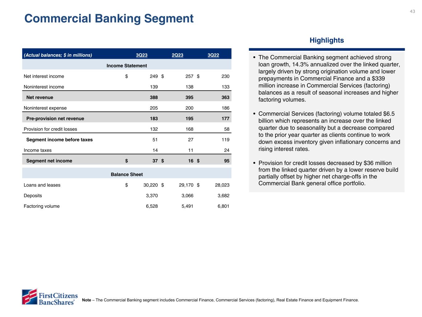42 Change vs. 3Q23 2Q23 3Q22 2Q23 3Q22 Avg. Balance Income / Expense Yield / Rate Avg. Balance Income / Expense Yield / Rate Avg. Balance Income / Expense Yield / Rate Avg. Balance Income / Expense Yield / Rate Avg. Balance Income / Expense Yield / Rate Loans and leases (1) $ 131,926 $ 2,426 7.29 % $ 133,407 $ 2,353 7.07 % $ 67,413 $ 785 4.63 % $ (1,481) $ 73 0.22 % $ 64,513 $ 1,641 2.66 % Investment securities 24,388 177 2.90 19,806 117 2.36 19,119 90 1.88 4,582 60 0.54 5,269 87 1.02 Securities purchased under agreements to resell 223 3 5.28 191 3 4.92 — — — 32 — 0.36 223 3 5.28 Interest-earning deposits at banks 37,456 504 5.34 38,014 480 5.07 5,685 31 2.17 (558) 24 0.27 31,771 473 3.17 Total interest-earning assets (1) $ 193,993 $ 3,110 6.36 % $ 191,418 $ 2,953 6.18 % $ 92,217 $ 906 3.90 % $ 2,575 $ 157 0.18 % $ 101,776 $ 2,204 2.46 % Interest-bearing deposits $ 100,958 $ 769 3.02 % $ 90,167 $ 575 2.56 % $ 61,545 $ 78 0.50 % $ 10,791 $ 194 0.46 % $ 39,413 $ 691 2.52 % Securities sold under customer repurchase agreements 454 — 0.35 456 1 0.31 617 1 0.16 (2) (1) 0.04 (163) (1) 0.19 Other short-term borrowings — — — 110 1 5.17 1,188 8 2.60 (110) (1) (5.17) (1,188) (8) (2.60) Long-term borrowings 37,699 351 3.69 42,569 415 3.91 3,803 24 2.62 (4,870) (64) (0.22) 33,896 327 1.07 Total borrowings $ 38,153 $ 351 3.65 % $ 43,135 $ 417 3.88 % $ 5,608 $ 33 2.34 % $ (4,982) $ (66) (0.23) % $ 32,545 $ 318 1.31 % Total interest-bearing liabilities $ 139,111 $ 1,120 3.19 % $ 133,302 $ 992 2.99 % $ 67,153 $ 111 0.66 % $ 5,809 $ 128 0.20 % $ 71,958 $ 1,009 2.53 % Net interest income $ 1,990 $ 1,961 $ 795 $ 29 $ 1,195 Net interest spread (1) 3.17 % 3.19 % 3.24 % (0.02) % (0.07) % Net interest margin (1) 4.07 % 4.10 % 3.42 % (0.03) % 0.65 % Change vs. YTD23 YTD22 YTD22 Avg. Balance Income / Expense Yield / Rate Avg. Balance Income / Expense Yield / Rate Avg. Balance Income / Expense Yield / Rate Loans and leases (1) $ 66,634 $ 2,953 4.41 % $ 65,639 $ 2,697 4.09 % $ 995 $ 256 0.32 % Investment securities 19,166 354 1.85 16,110 216 1.32 3,056 138 0.53 Interest-earning deposits at banks 7,726 106 1.38 13,246 17 0.13 (5,520) 89 1.25 Total interest-earning assets (1) $ 93,526 $ 3,413 3.63 % $ 94,995 $ 2,930 3.07 % $ (1,469) $ 483 0.56 % Interest-bearing deposits $ 63,598 $ 335 0.53 % $ 65,295 $ 239 0.37 % $ (1,697) $ 96 0.16 % Securities sold under customer repurchase agreements 590 1 0.19 660 1 0.20 (70) — (0.01) Other short-term borrowings 824 28 3.30 — — — 824 28 3.30 Long-term borrowings 3,882 103 2.64 5,915 249 4.15 (2,033) (146) (1.51) Total borrowings $ 5,296 $ 132 2.47 % $ 6,575 $ 250 3.75 % $ (1,279) $ (118) (1.28) % Total interest-bearing liabilities $ 68,894 $ 467 0.68 % $ 71,870 $ 489 0.68 % $ (2,976) $ (22) — % Net interest income $ 2,946 $ 2,441 $ 505 Net interest spread (1) 2.95 % 2.39 % 0.56 % Net interest margin (1) 3.14 % 2.55 % 0.59 % Average Balances and Yields ($ in millions) (1) The balance and rate presented is calculated including assets held for sale and net of credit balances of factoring clients. YTD not disclosed Q1