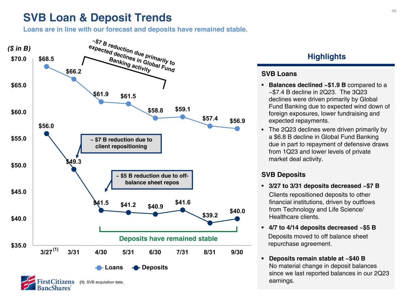45 Highlights • Silicon Valley Banking segment loans decreased $1.9 billion, or 13.1% annualized, compared to the linked quarter driven by paydowns and payoffs in the Global Fund Banking portfolio, low draws and new fundings given current market conditions and by the expected wind down of foreign exposure. • Deposit balances declined by $890 million from the linked quarter as client cash burn outpaced fundraising. Overall, deposits have been relatively stable between April 30th and September 30th, reflecting the positive benefits of client outreach efforts. • Noninterest income decreased $18 million from the linked quarter driven primarily by lower wealth management fees from a decline in assets under management and a slowdown in card and cash management volumes. • Provision for credit losses increased from the linked quarter driven primarily by a large provision benefit in the second quarter. Net charge-offs were relatively flat at $100 million in the third quarter compared to $97 million in the second quarter. • The impact of cost saves realized in 2Q23 continues to favorably impact the expense run rate of the SVB segment. (Actual balances; $ in millions) 3Q23 2Q23 Income Statement Net interest income $ 635 $ 635 Noninterest income 151 169 Net revenue 786 804 Noninterest expense 514 592 Pre-provision net revenue 272 212 Provision (benefit) for credit losses 56 (47) Segment income before taxes 216 259 Income taxes 59 70 Segment net income $ 157 $ 189 Period-end Balance Sheet Loans and leases $ 56,864 $ 58,803 Deposits 39,970 40,860 Other Key Metrics Private Bank assets under management ($B) $ 8.9 $ 10.8 Off balance sheet client funds ($B) $ 60.4 $ 70.4 Silicon Valley Banking Segment Note – Silicon Valley Banking Segment results reflect a full quarter for the 2Q23 reporting period, and only 5 days of financial results for the 1Q23 reporting period, following the 3/27/23 acquisition date. Additionally, there is no provision expense in 1Q23 as this was recorded as part of purchase accounting. Reinstate note during 1Q24 when 1Q23 is shown again PLEASE DO NOT REVIEW Data Unavailable Note – The Silicon Valley Banking segment includes SVB Commercial Bank and SVB Private Bank. Silicon Valley Banking Segment results do not include the accretion impact of SVB loans or the impact of interest bearing cash and debt that was added at the acquisition date (the aforementioned items are contained within the Corporate segment).