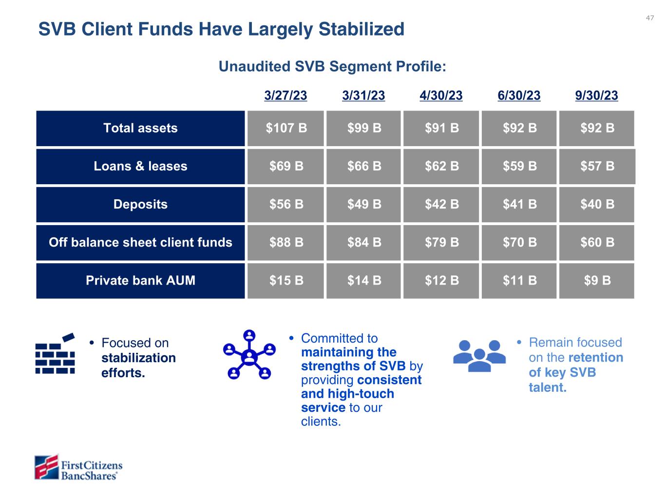 47 SVB Client Funds Have Largely Stabilized 3/27/23 3/31/23 4/30/23 6/30/23 9/30/23 Total assets $107 B $99 B $91 B $92 B $92 B Loans & leases $69 B $66 B $62 B $59 B $57 B Deposits $56 B $49 B $42 B $41 B $40 B Off balance sheet client funds $88 B $84 B $79 B $70 B $60 B Private bank AUM $15 B $14 B $12 B $11 B $9 B Unaudited SVB Segment Profile: • Focused on stabilization efforts. • Committed to maintaining the strengths of SVB by providing consistent and high-touch service to our clients. • Remain focused on the retention of key SVB talent.