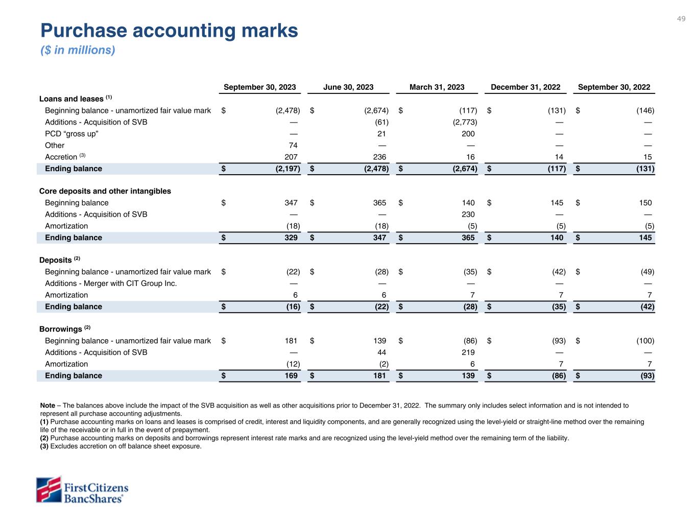 49 September 30, 2023 June 30, 2023 March 31, 2023 December 31, 2022 September 30, 2022 Loans and leases (1) Beginning balance - unamortized fair value mark $ (2,478) $ (2,674) $ (117) $ (131) $ (146) Additions - Acquisition of SVB — (61) (2,773) — — PCD “gross up” — 21 200 — — Other 74 — — — — Accretion (3) 207 236 16 14 15 Ending balance $ (2,197) $ (2,478) $ (2,674) $ (117) $ (131) Core deposits and other intangibles Beginning balance $ 347 $ 365 $ 140 $ 145 $ 150 Additions - Acquisition of SVB — — 230 — — Amortization (18) (18) (5) (5) (5) Ending balance $ 329 $ 347 $ 365 $ 140 $ 145 Deposits (2) Beginning balance - unamortized fair value mark $ (22) $ (28) $ (35) $ (42) $ (49) Additions - Merger with CIT Group Inc. — — — — — Amortization 6 6 7 7 7 Ending balance $ (16) $ (22) $ (28) $ (35) $ (42) Borrowings (2) Beginning balance - unamortized fair value mark $ 181 $ 139 $ (86) $ (93) $ (100) Additions - Acquisition of SVB — 44 219 — — Amortization (12) (2) 6 7 7 Ending balance $ 169 $ 181 $ 139 $ (86) $ (93) Note – The balances above include the impact of the SVB acquisition as well as other acquisitions prior to December 31, 2022. The summary only includes select information and is not intended to represent all purchase accounting adjustments. (1) Purchase accounting marks on loans and leases is comprised of credit, interest and liquidity components, and are generally recognized using the level-yield or straight-line method over the remaining life of the receivable or in full in the event of prepayment. (2) Purchase accounting marks on deposits and borrowings represent interest rate marks and are recognized using the level-yield method over the remaining term of the liability. (3) Excludes accretion on off balance sheet exposure. Purchase accounting marks ($ in millions)