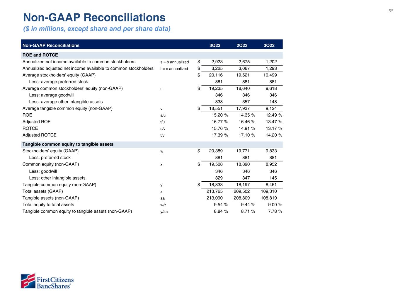 54 Non-GAAP Reconciliations ($ in millions, except share and per share data) Non-GAAP Reconciliations 3Q23 2Q23 3Q22 PPNR Net income (GAAP) a $ 752 682 315 Plus: Provision for credit losses 192 151 60 Income tax expense 245 214 93 PPNR (non-GAAP) l $ 1,189 1,047 468 Impact of notable items (1) 137 174 38 Adjusted PPNR (non-GAAP) m $ 1,326 1,221 506 ROA Net income (GAAP) a $ 752 682 315 Annualized net income n = a annualized 2,983 2,734 1,250 Adjusted net income (non-GAAP) d 828 780 338 Annualized adjusted net income p = d annualized 3,286 3,126 1,341 Average assets o 211,994 209,309 107,969 ROA n/o 1.41 % 1.31 % 1.16 % Adjusted ROA p/o 1.55 % 1.49 % 1.24 % PPNR ROA PPNR (non-GAAP) l $ 1,189 1,047 468 Annualized PPNR q = l annualized 4,717 4,200 1,858 Adjusted PPNR (non-GAAP) m 1,326 1,221 506 Annualized PPNR r = m annualized 5,261 4,893 2,009 PPNR ROA q/o 2.23 % 2.00 % 1.72 % Adjusted PPNR ROA r/o 2.48 % 2.34 % 1.86 % (1) Excludes the notable items for the provision for credit losses and income taxes as these items are excluded from PPNR as presented in the table above.