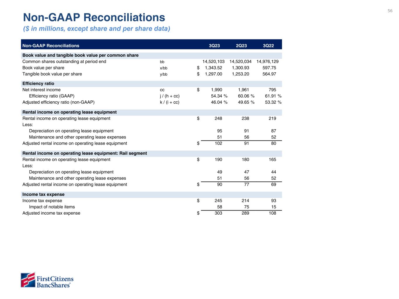 56 Non-GAAP Reconciliations ($ in millions, except share and per share data) Non-GAAP Reconciliations 3Q23 2Q23 3Q22 Book value and tangible book value per common share Common shares outstanding at period end bb 14,520,103 14,520,034 14,976,129 Book value per share x/bb $ 1,343.52 1,300.93 597.75 Tangible book value per share y/bb $ 1,297.00 1,253.20 564.97 Efficiency ratio Net interest income cc $ 1,990 1,961 795 Efficiency ratio (GAAP) j / (h + cc) 54.34 % 60.06 % 61.91 % Adjusted efficiency ratio (non-GAAP) k / (i + cc) 46.04 % 49.65 % 53.32 % Rental income on operating lease equipment Rental income on operating lease equipment $ 248 238 219 Less: Depreciation on operating lease equipment 95 91 87 Maintenance and other operating lease expenses 51 56 52 Adjusted rental income on operating lease equipment $ 102 91 80 Rental income on operating lease equipment: Rail segment Rental income on operating lease equipment $ 190 180 165 Less: Depreciation on operating lease equipment 49 47 44 Maintenance and other operating lease expenses 51 56 52 Adjusted rental income on operating lease equipment $ 90 77 69 Income tax expense Income tax expense $ 245 214 93 Impact of notable items 58 75 15 Adjusted income tax expense $ 303 289 108