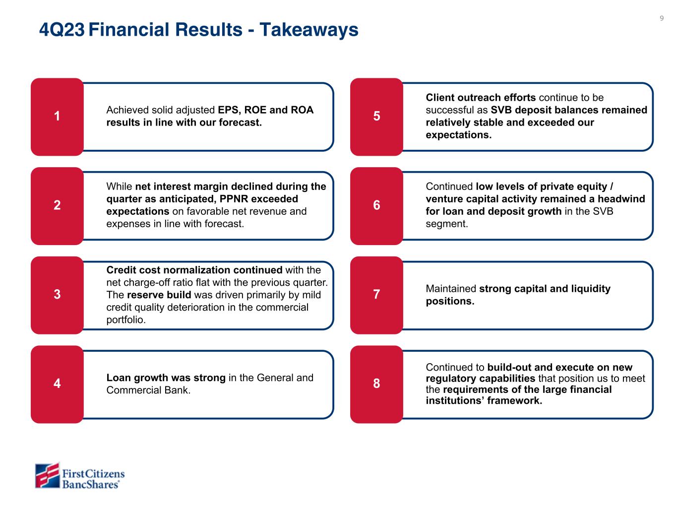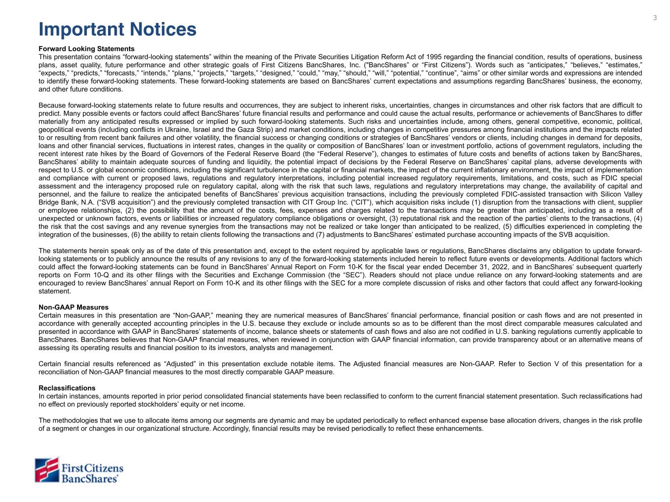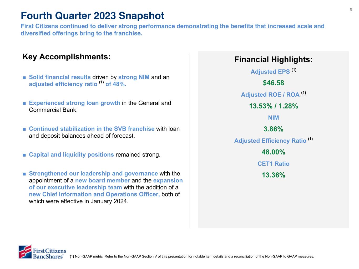 3 Forward Looking Statements This presentation contains “forward-looking statements” within the meaning of the Private Securities Litigation Reform Act of 1995 regarding the financial condition, results of operations, business plans, asset quality, future performance and other strategic goals of First Citizens BancShares, Inc. ("BancShares” or “First Citizens”). Words such as “anticipates,” “believes,” “estimates,” “expects,” “predicts,” “forecasts,” “intends,” “plans,” “projects,” “targets,” “designed,” “could,” “may,” “should,” “will,” “potential,” “continue”, “aims” or other similar words and expressions are intended to identify these forward-looking statements. These forward-looking statements are based on BancShares’ current expectations and assumptions regarding BancShares’ business, the economy, and other future conditions. Because forward-looking statements relate to future results and occurrences, they are subject to inherent risks, uncertainties, changes in circumstances and other risk factors that are difficult to predict. Many possible events or factors could affect BancShares’ future financial results and performance and could cause the actual results, performance or achievements of BancShares to differ materially from any anticipated results expressed or implied by such forward-looking statements. Such risks and uncertainties include, among others, general competitive, economic, political, geopolitical events (including conflicts in Ukraine, Israel and the Gaza Strip) and market conditions, including changes in competitive pressures among financial institutions and the impacts related to or resulting from recent bank failures and other volatility, the financial success or changing conditions or strategies of BancShares’ vendors or clients, including changes in demand for deposits, loans and other financial services, fluctuations in interest rates, changes in the quality or composition of BancShares’ loan or investment portfolio, actions of government regulators, including the recent interest rate hikes by the Board of Governors of the Federal Reserve Board (the “Federal Reserve”), changes to estimates of future costs and benefits of actions taken by BancShares, BancShares’ ability to maintain adequate sources of funding and liquidity, the potential impact of decisions by the Federal Reserve on BancShares’ capital plans, adverse developments with respect to U.S. or global economic conditions, including the significant turbulence in the capital or financial markets, the impact of the current inflationary environment, the impact of implementation and compliance with current or proposed laws, regulations and regulatory interpretations, including potential increased regulatory requirements, limitations, and costs, such as FDIC special assessment and the interagency proposed rule on regulatory capital, along with the risk that such laws, regulations and regulatory interpretations may change, the availability of capital and personnel, and the failure to realize the anticipated benefits of BancShares’ previous acquisition transactions, including the previously completed FDIC-assisted transaction with Silicon Valley Bridge Bank, N.A. (“SVB acquisition”) and the previously completed transaction with CIT Group Inc. (“CIT”), which acquisition risks include (1) disruption from the transactions with client, supplier or employee relationships, (2) the possibility that the amount of the costs, fees, expenses and charges related to the transactions may be greater than anticipated, including as a result of unexpected or unknown factors, events or liabilities or increased regulatory compliance obligations or oversight, (3) reputational risk and the reaction of the parties’ clients to the transactions, (4) the risk that the cost savings and any revenue synergies from the transactions may not be realized or take longer than anticipated to be realized, (5) difficulties experienced in completing the integration of the businesses, (6) the ability to retain clients following the transactions and (7) adjustments to BancShares’ estimated purchase accounting impacts of the SVB acquisition. The statements herein speak only as of the date of this presentation and, except to the extent required by applicable laws or regulations, BancShares disclaims any obligation to update forward- looking statements or to publicly announce the results of any revisions to any of the forward-looking statements included herein to reflect future events or developments. Additional factors which could affect the forward-looking statements can be found in BancShares’ Annual Report on Form 10-K for the fiscal year ended December 31, 2022, and in BancShares’ subsequent quarterly reports on Form 10-Q and its other filings with the Securities and Exchange Commission (the “SEC”). Readers should not place undue reliance on any forward-looking statements and are encouraged to review BancShares’ annual Report on Form 10-K and its other filings with the SEC for a more complete discussion of risks and other factors that could affect any forward-looking statement. Non-GAAP Measures Certain measures in this presentation are “Non-GAAP,” meaning they are numerical measures of BancShares’ financial performance, financial position or cash flows and are not presented in accordance with generally accepted accounting principles in the U.S. because they exclude or include amounts so as to be different than the most direct comparable measures calculated and presented in accordance with GAAP in BancShares’ statements of income, balance sheets or statements of cash flows and also are not codified in U.S. banking regulations currently applicable to BancShares. BancShares believes that Non-GAAP financial measures, when reviewed in conjunction with GAAP financial information, can provide transparency about or an alternati
