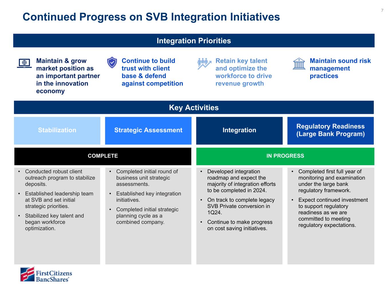 6 Strategic Priorities First Citizens Strategic Priorities Risk Management • Maximize growth opportunities in our core lines of business and optimize funding by growing core deposits. • Deliver specialized business solutions across all business lines and channels. • Remain a key partner to the innovation economy. • Attract, retain and develop associates who align with our long-term direction and culture while scaling for continued growth. • Continue to build a leading culture based on behaviors that demonstrate our shared values, regardless of the legacy organization. • Execute on SVB integration to optimize revenue and deliver integration synergies, while retaining and growing client base. • Remain focused on balance sheet management to optimize our long- term liquidity position through core deposit growth. • Support regulatory readiness and successfully implement enhanced regulatory requirements. • Continue to enhance program to support compliance and position the Bank for future growth. Client-Focused Business Model Talent & Culture Operational Efficiency Regulatory Readiness