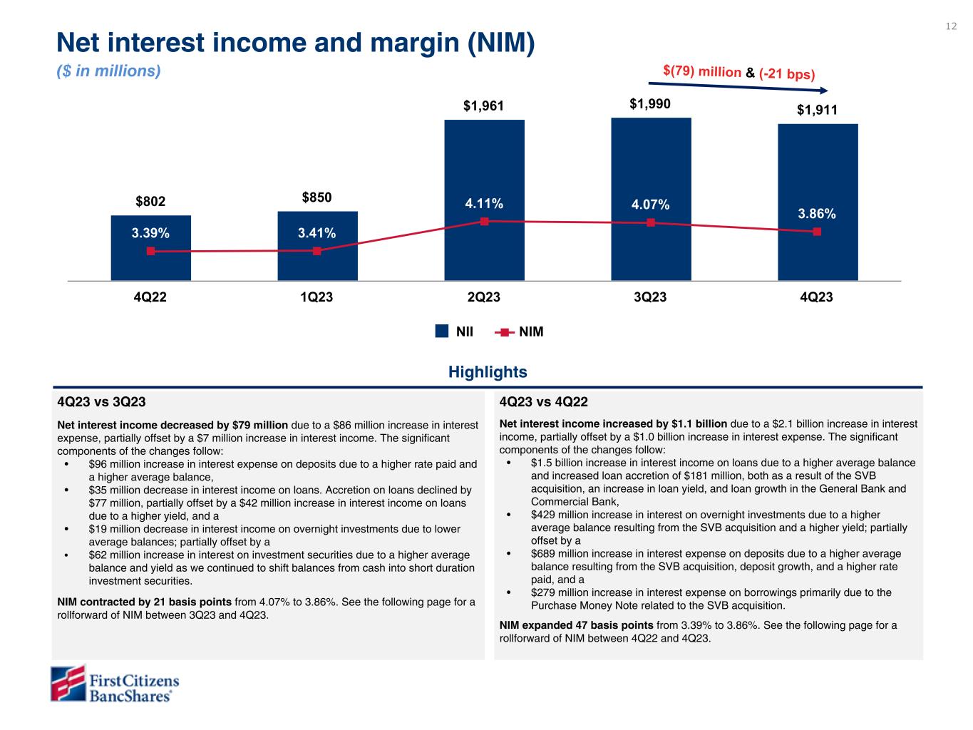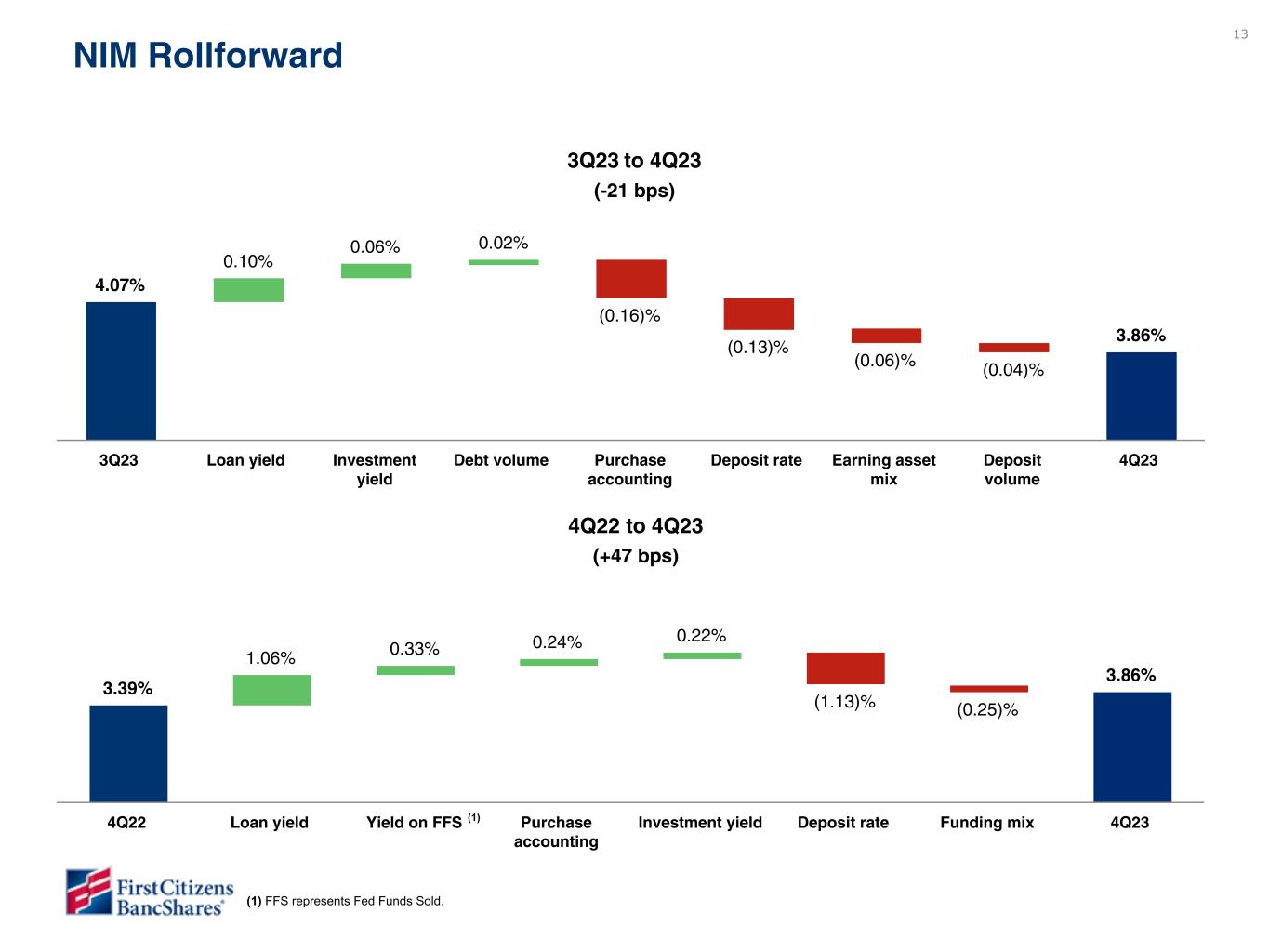 12 $802 $850 $1,961 $1,990 $1,911 3.39% 3.41% 4.11% 4.07% 3.86% NII NIM 4Q22 1Q23 2Q23 3Q23 4Q23 $2,441 $2,946 2.55% 3.14% YTD Dec 21 YTD Dec 22 4Q23 vs 3Q23 Net interest income decreased by $79 million due to a $86 million increase in interest expense, partially offset by a $7 million increase in interest income. The significant components of the changes follow: • $96 million increase in interest expense on deposits due to a higher rate paid and a higher average balance, • $35 million decrease in interest income on loans. Accretion on loans declined by $77 million, partially offset by a $42 million increase in interest income on loans due to a higher yield, and a • $19 million decrease in interest income on overnight investments due to lower average balances; partially offset by a • $62 million increase in interest on investment securities due to a higher average balance and yield as we continued to shift balances from cash into short duration investment securities. NIM contracted by 21 basis points from 4.07% to 3.86%. See the following page for a rollforward of NIM between 3Q23 and 4Q23. YTD December 2022 vs YTD December 2021 Net interest income increased by $505 million due to a $483 million increase in interest income and a $22 million decrease in interest expense. The change in net interest income was primarily due to the following: ◦ $256 million increase on interest income on loans due to a higher yield and growth offset by lower SBA- PPP interest and fee income and lower accretion income, ◦ $138 million increase in interest income on investment securities due to higher yield and average balance, ◦ $118 million decline in interest expense on borrowings due to a lower rate and average balance, ◦ $89 million increase in interest income on overnight investments due to a higher yield despite a lower average balance; partially offset by a ◦ $96 million increase in interest expense on deposits due to a higher rate paid. NIM expanded from 2.55% to 3.14%. $505 million & 59 bps Highlights $(79) million & (-21 bps) 4Q23 vs 4Q22 Net interest income increased by $1.1 billion due to a $2.1 billion increase in interest income, partially offset by a $1.0 billion increase in interest expense. The significant components of the changes follow: • $1.5 billion increase in interest income on loans due to a higher average balance and increased loan accretion of $181 million, both as a result of the SVB acquisition, an increase in loan yield, and loan growth in the General Bank and Commercial Bank, • $429 million increase in interest on overnight investments due to a higher average balance resulting from the SVB acquisition and a higher yield; partially offset by a • $689 million increase in interest expense on deposits due to a higher average balance resulting from the SVB acquisition, deposit growth, and a higher rate paid, and a • $279 million increase in interest expense on borrowings primarily due to the Purchase Money Note related to the SVB acquisition. NIM expanded 47 basis points from 3.39% to 3.86%. See the following page for a rollforward of NIM between 4Q22 and 4Q23. Net interest income and margin (NIM) ($ in millions)