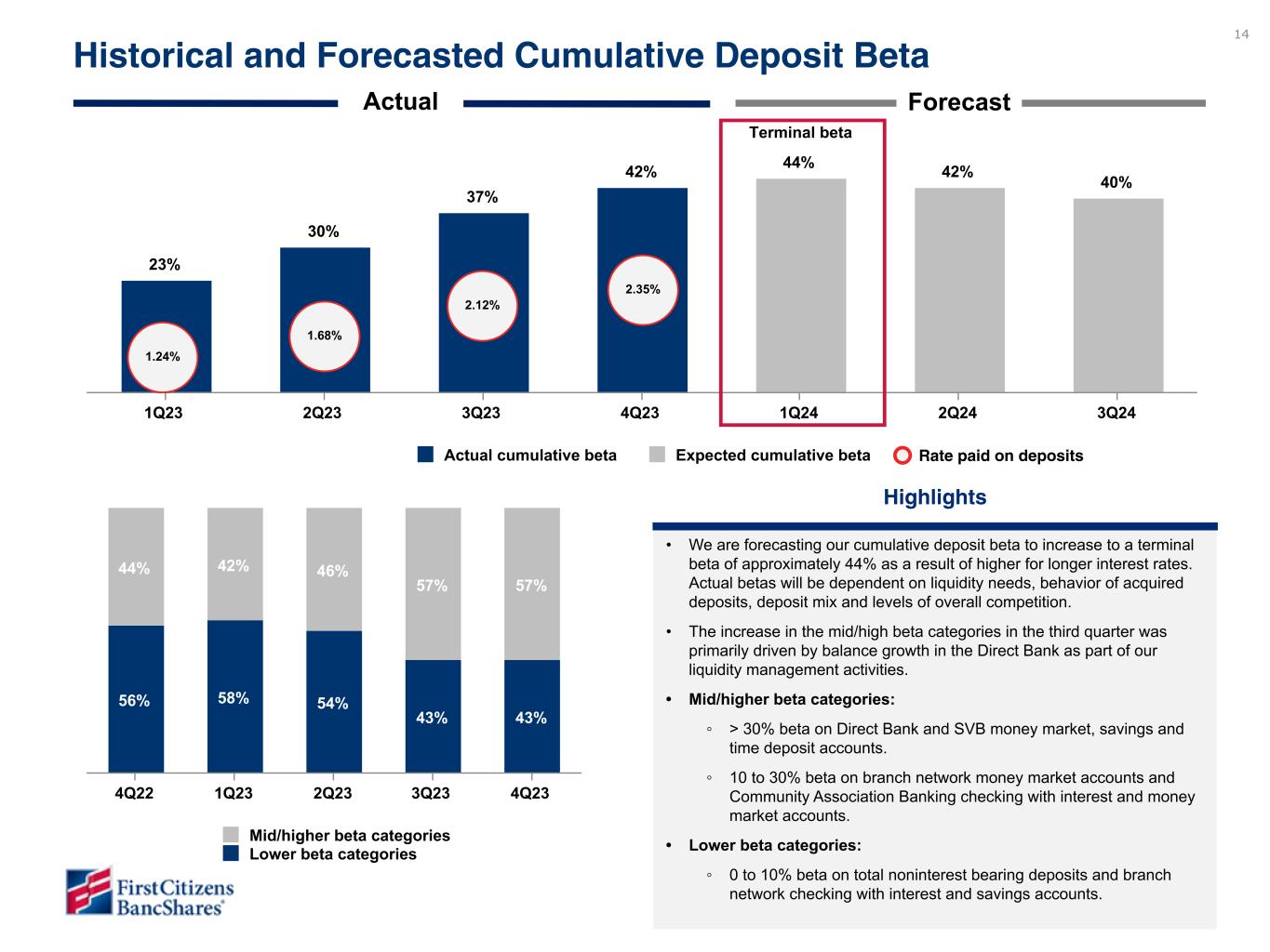 13 3.39% 1.06% 0.33% 0.24% 0.22% (1.13)% (0.25)% 3.86% 4Q22 Loan yield Yield on FFS Purchase accounting Investment yield Deposit rate Funding mix 4Q23 4Q22 to 4Q23 (+47 bps) NIM Rollforward 4.07% 0.10% 0.06% 0.02% (0.16)% (0.13)% (0.06)% (0.04)% 3.86% 3Q23 Loan yield Investment yield Debt volume Purchase accounting Deposit rate Earning asset mix Deposit volume 4Q23 3Q23 to 4Q23 (-21 bps) (1) (1) Includes purchase accounting impact between March 27, 2023 and March 31, 2023. (1) FFS represents Fed Funds Sold. (1) NIM rollforward has not been finalized. Will be provided in the next draft Craig - We added in earning asset mix on the current quarter roll as the straight math was showing a decline in loans due to volume despite stable average balances. The reason is really because loans as a percentage of interest earning assets declined so we discussed with Tom and decided the best approach was to net with the changes in investment and FFS volume and call earning asset mix.