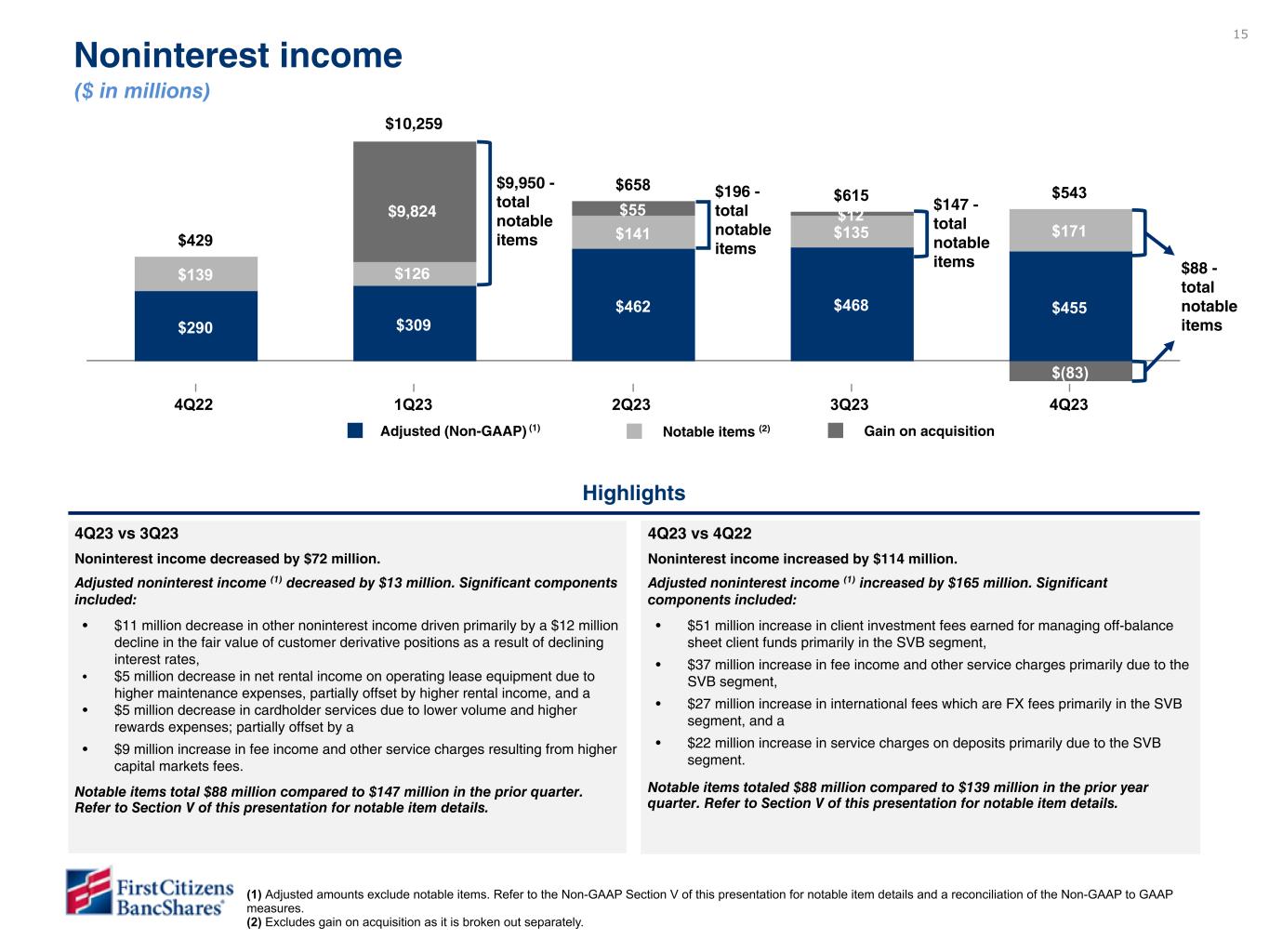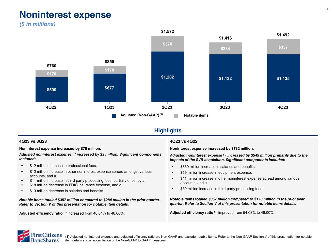 15 $10,259 $429 $658 $615 $543 $290 $309 $462 $468 $455 $139 $141 $135 $171 $55 $12 $(83) 4Q22 1Q23 2Q23 3Q23 4Q23 $295 $171 1Q23 SVB contribution $1,940 $2,136 $996 $1,141 $944 $995 YTD Dec 21 YTD Dec 22 4Q23 vs 3Q23 Noninterest income decreased by $72 million. Adjusted noninterest income (1) decreased by $13 million. Significant components included: • $11 million decrease in other noninterest income driven primarily by a $12 million decline in the fair value of customer derivative positions as a result of declining interest rates, • $5 million decrease in net rental income on operating lease equipment due to higher maintenance expenses, partially offset by higher rental income, and a • $5 million decrease in cardholder services due to lower volume and higher rewards expenses; partially offset by a • $9 million increase in fee income and other service charges resulting from higher capital markets fees. Notable items total $88 million compared to $147 million in the prior quarter. Refer to Section V of this presentation for notable item details. YTD22 vs YTD21 Noninterest income increased $196 million. Significant components of the change were: ◦ Rental income on operating leases increased $91 million due to the same reasons as in the linked quarter. Expenses on operating lease equipment declined $16 million resulting in a $107 million increase in adjusted rental income. ◦ Cardholder services income, net increased $15 million due to higher volume and fee income and other service charges increased $14 million, primarily due to higher capital markets and portfolio servicing fees. ◦ Wealth management services increased $13 million due to increased brokerage transactions and higher assets under management. ◦ Other noninterest income increased $63 million spread among various line items, including a $431 million bargain purchase gain, partially offset by a $147 million decline in investment gains and a $188 million decline in gains on asset and loan sales. Highlights Noninterest income ($ in millions) Core: ### increase 4Q23 vs 4Q22 Noninterest income increased by $114 million. Adjusted noninterest income (1) increased by $165 million. Significant components included: • $51 million increase in client investment fees earned for managing off-balance sheet client funds primarily in the SVB segment, • $37 million increase in fee income and other service charges primarily due to the SVB segment, • $27 million increase in international fees which are FX fees primarily in the SVB segment, and a • $22 million increase in service charges on deposits primarily due to the SVB segment. Notable items totaled $88 million compared to $139 million in the prior year quarter. Refer to Section V of this presentation for notable item details. (1) Adjusted amounts exclude notable items. Refer to the Non-GAAP Section V of this presentation for notable item details and a reconciliation of the Non-GAAP to GAAP measures. (2) Excludes gain on acquisition as it is broken out separately. $126 Adjusted (Non-GAAP) (1) Notable items (2) Gain on acquisition $9,824 $139 - total notable items $88 - total notable items $455 - total adjusted (Non-GAAP) (1) $9,950 - total notable items $147 - total notable items $196 - total notable items $88 - total notable items