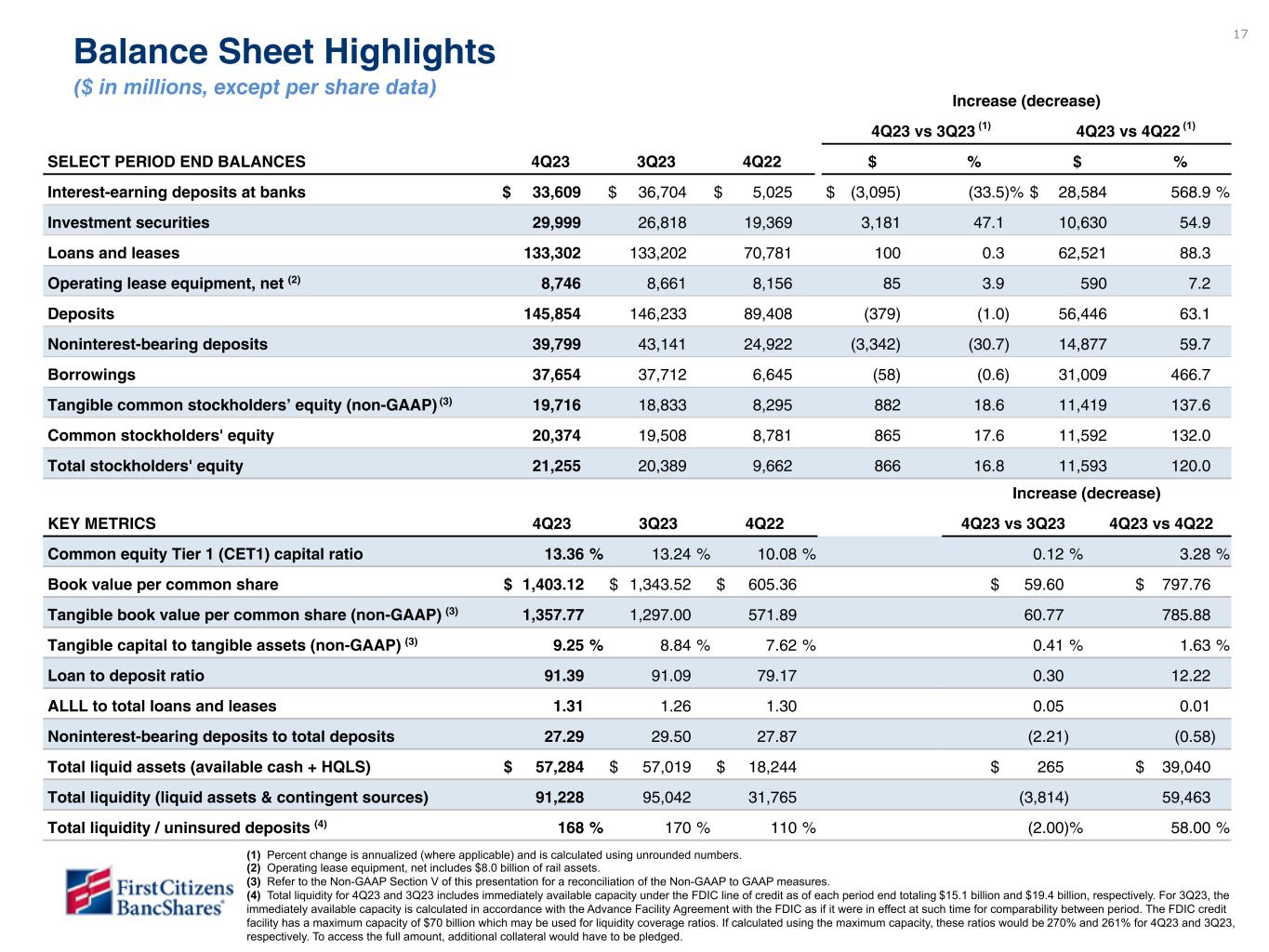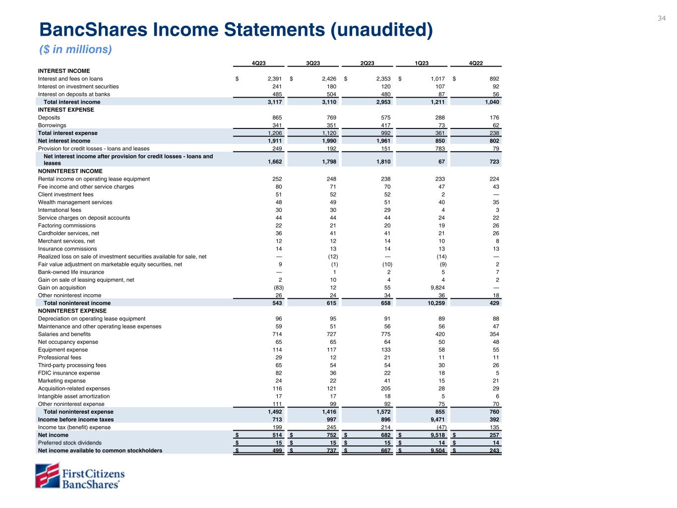 33 Dec 31, 2023 Sep 30, 2023 Jun 30, 2023 Mar 31, 2023 Dec 31, 2022 ASSETS Cash and due from banks $ 908 $ 791 $ 917 $ 1,598 $ 518 Interest-earning deposits at banks 33,609 36,704 37,846 38,522 5,025 Securities purchased under agreements to resell 473 549 298 — — Investment in marketable equity securities 84 75 76 85 95 Investment securities available for sale 19,936 16,661 11,894 9,061 8,995 Investment securities held to maturity 9,979 10,082 10,201 10,381 10,279 Assets held for sale 76 58 117 94 60 Loans and leases 133,302 133,202 133,015 138,288 70,781 Allowance for loan and lease losses (1,747) (1,673) (1,637) (1,605) (922) Loans and leases, net of allowance for loan and lease losses 131,555 131,529 131,378 136,683 69,859 Operating lease equipment, net 8,746 8,661 8,531 8,331 8,156 Premises and equipment, net 1,877 1,768 1,782 1,743 1,456 Goodwill 346 346 346 346 346 Other intangible assets 312 329 347 364 140 Other assets 5,857 6,212 5,769 7,450 4,369 Total assets $ 213,758 $ 213,765 $ 209,502 $ 214,658 $ 109,298 LIABILITIES Deposits: Noninterest-bearing $ 39,799 $ 43,141 $ 44,547 $ 54,649 $ 24,922 Interest-bearing 106,055 103,092 96,617 85,401 64,486 Total deposits 145,854 146,233 141,164 140,050 89,408 Credit balances of factoring clients 1,089 1,282 1,067 1,126 995 Short-term borrowings 485 453 454 1,009 2,186 Long-term borrowings 37,169 37,259 39,685 45,085 4,459 Total borrowings 37,654 37,712 40,139 46,094 6,645 Other liabilities 7,906 8,149 7,361 8,172 2,588 Total liabilities 192,503 193,376 189,731 195,442 99,636 STOCKHOLDERS’ EQUITY Preferred stock 881 881 881 881 881 Common stock 15 15 15 15 15 Additional paid in capital 4,108 4,106 4,106 4,104 4,109 Retained earnings 16,742 16,267 15,541 14,885 5,392 Accumulated other comprehensive (loss) income (491) (880) (772) (669) (735) Total stockholders’ equity 21,255 20,389 19,771 19,216 9,662 Total liabilities and stockholders’ equity $ 213,758 $ 213,765 $ 209,502 $ 214,658 $ 109,298 BancShares Balance Sheets (unaudited) ($ in millions)