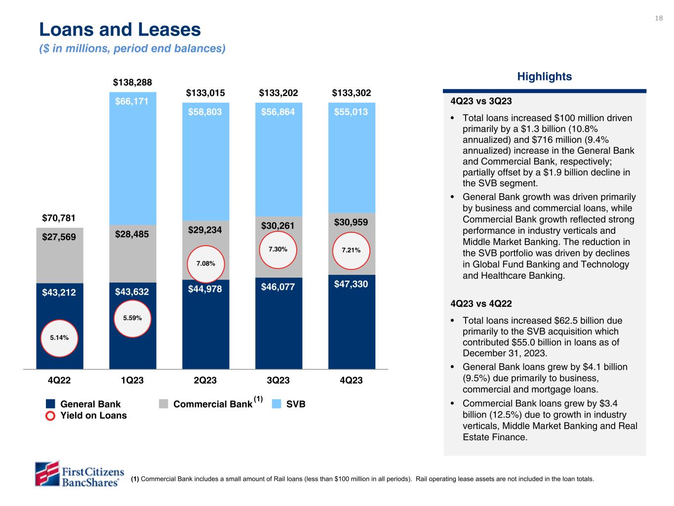 17 17 Increase (decrease) 4Q23 vs 3Q23 4Q23 vs 4Q22 SELECT PERIOD END BALANCES 4Q23 3Q23 4Q22 $ % $ % Interest-earning deposits at banks $ 33,609 $ 36,704 $ 5,025 $ (3,095) (33.5) % $ 28,584 568.9 % Investment securities 29,999 26,818 19,369 3,181 47.1 10,630 54.9 Loans and leases 133,302 133,202 70,781 100 0.3 62,521 88.3 Operating lease equipment, net (2) 8,746 8,661 8,156 85 3.9 590 7.2 Deposits 145,854 146,233 89,408 (379) (1.0) 56,446 63.1 Noninterest-bearing deposits 39,799 43,141 24,922 (3,342) (30.7) 14,877 59.7 Borrowings 37,654 37,712 6,645 (58) (0.6) 31,009 466.7 Tangible common stockholders’ equity (non-GAAP) (3) 19,716 18,833 8,295 882 18.6 11,419 137.6 Common stockholders' equity 20,374 19,508 8,781 865 17.6 11,592 132.0 Total stockholders' equity 21,255 20,389 9,662 866 16.8 11,593 120.0 Increase (decrease) KEY METRICS 4Q23 3Q23 4Q22 4Q23 vs 3Q23 4Q23 vs 4Q22 Common equity Tier 1 (CET1) capital ratio 13.36 % 13.24 % 10.08 % 0.12 % 3.28 % Book value per common share $ 1,403.12 $ 1,343.52 $ 605.36 $ 59.60 $ 797.76 Tangible book value per common share (non-GAAP) (3) 1,357.77 1,297.00 571.89 60.77 785.88 Tangible capital to tangible assets (non-GAAP) (3) 9.25 % 8.84 % 7.62 % 0.41 % 1.63 % Loan to deposit ratio 91.39 91.09 79.17 0.30 12.22 ALLL to total loans and leases 1.31 1.26 1.30 0.05 0.01 Noninterest-bearing deposits to total deposits 27.29 29.50 27.87 (2.21) (0.58) Total liquid assets (available cash + HQLS) $ 57,284 $ 57,019 $ 18,244 $ 265 $ 39,040 Total liquidity (liquid assets & contingent sources) 91,228 95,042 31,765 (3,814) 59,463 Total liquidity / uninsured deposits (4) 168 % 170 % 110 % (2.00) % 58.00 % Balance Sheet Highlights ($ in millions, except per share data) (1) Percent change is annualized (where applicable) and is calculated using unrounded numbers. (2) Operating lease equipment, net includes $8.0 billion of rail assets. (3) Refer to the Non-GAAP Section V of this presentation for a reconciliation of the Non-GAAP to GAAP measures. (4) Total liquidity for 4Q23 and 3Q23 includes immediately available capacity under the FDIC line of credit as of each period end totaling $15.1 billion and $19.4 billion, respectively. For 3Q23, the immediately available capacity is calculated in accordance with the Advance Facility Agreement with the FDIC as if it were in effect at such time for comparability between period. The FDIC credit facility has a maximum capacity of $70 billion which may be used for liquidity coverage ratios. If calculated using the maximum capacity, these ratios would be 270% and 261% for 4Q23 and 3Q23, respectively. To access the full amount, additional collateral would have to be pledged. (1) (1)