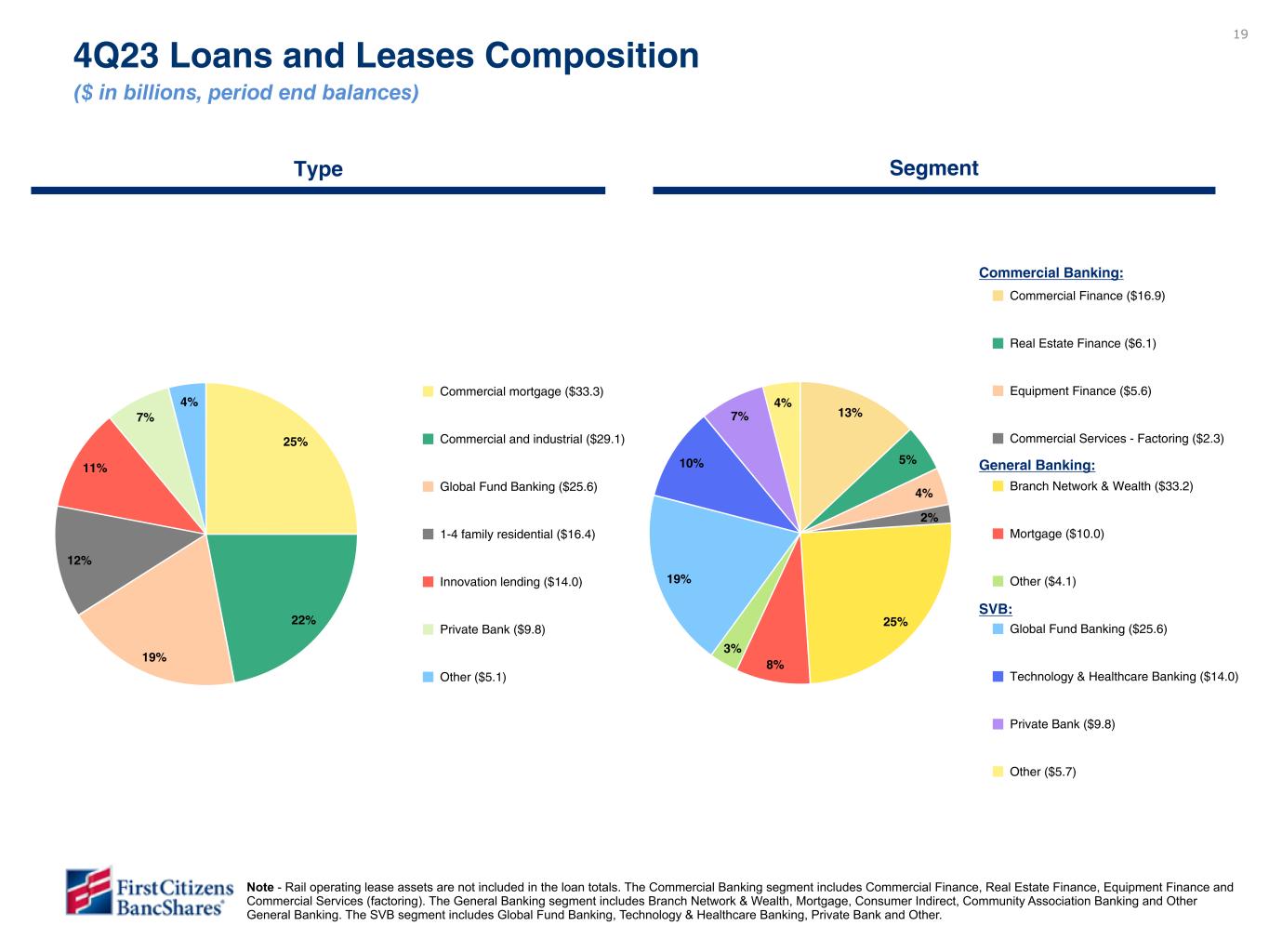 18 $70,781 $138,288 $133,015 $133,202 $133,302 $43,212 $43,632 $44,978 $46,077 $47,330 $27,569 $28,485 $29,234 $30,261 $30,959 $66,171 $58,803 $56,864 $55,013 General Bank Commercial Bank SVB Yield on Loans 4Q22 1Q23 2Q23 3Q23 4Q23 Highlights 4Q23 vs 3Q23 • Total loans increased $100 million driven primarily by a $1.3 billion (10.8% annualized) and $716 million (9.4% annualized) increase in the General Bank and Commercial Bank, respectively; partially offset by a $1.9 billion decline in the SVB segment. • General Bank growth was driven primarily by business and commercial loans, while Commercial Bank growth reflected strong performance in industry verticals and Middle Market Banking. The reduction in the SVB portfolio was driven by declines in Global Fund Banking and Technology and Healthcare Banking. 4Q23 vs 4Q22 • Total loans increased $62.5 billion due primarily to the SVB acquisition which contributed $55.0 billion in loans as of December 31, 2023. • General Bank loans grew by $4.1 billion (9.5%) due primarily to business, commercial and mortgage loans. • Commercial Bank loans grew by $3.4 billion (12.5%) due to growth in industry verticals, Middle Market Banking and Real Estate Finance. Loans and Leases ($ in millions, period end balances) (1) Commercial Bank includes a small amount of Rail loans (less than $100 million in all periods). Rail operating lease assets are not included in the loan totals. 7.30% 7.08% 5.59% 5.14% 7.21% 10.1% (1)