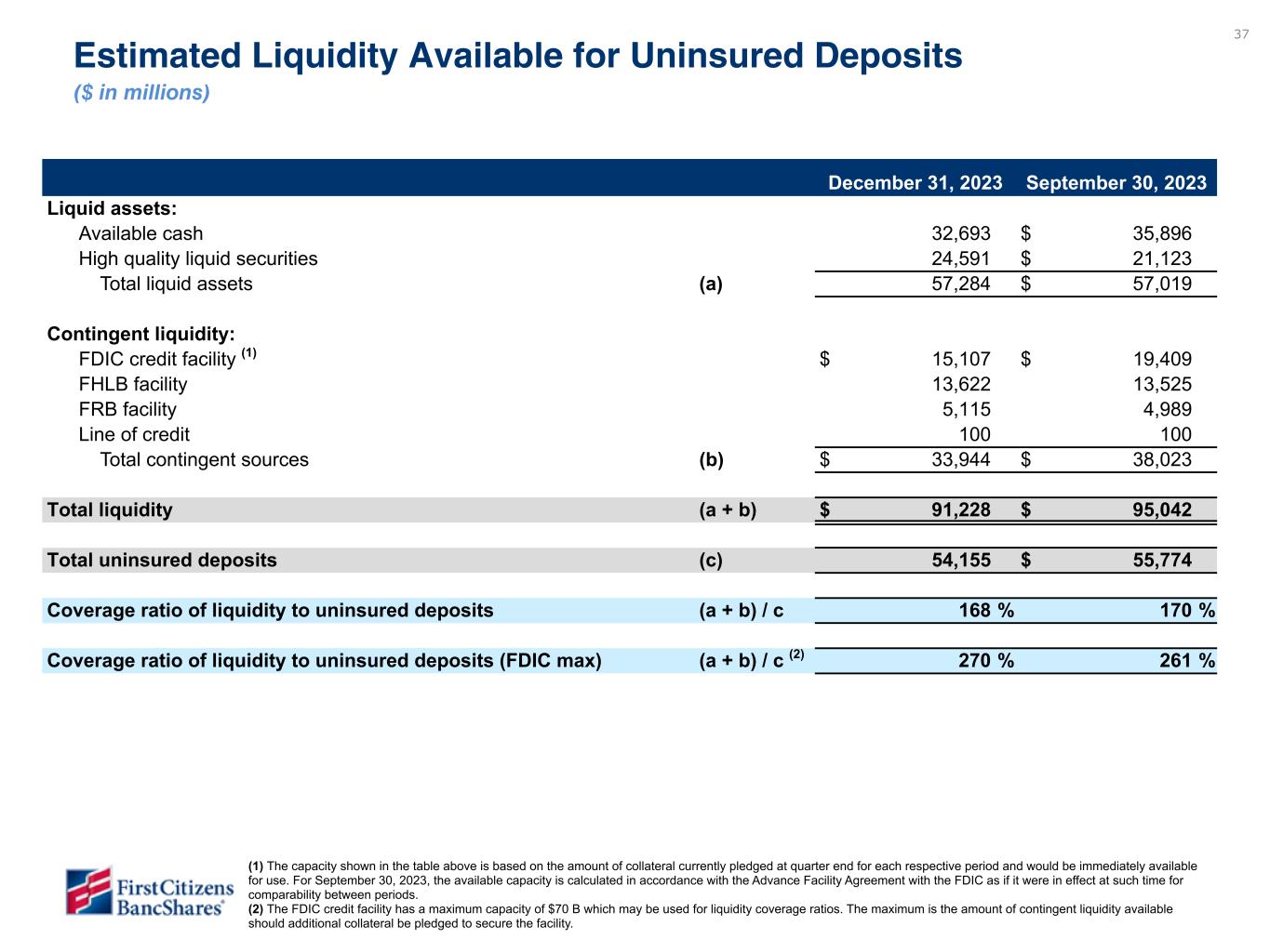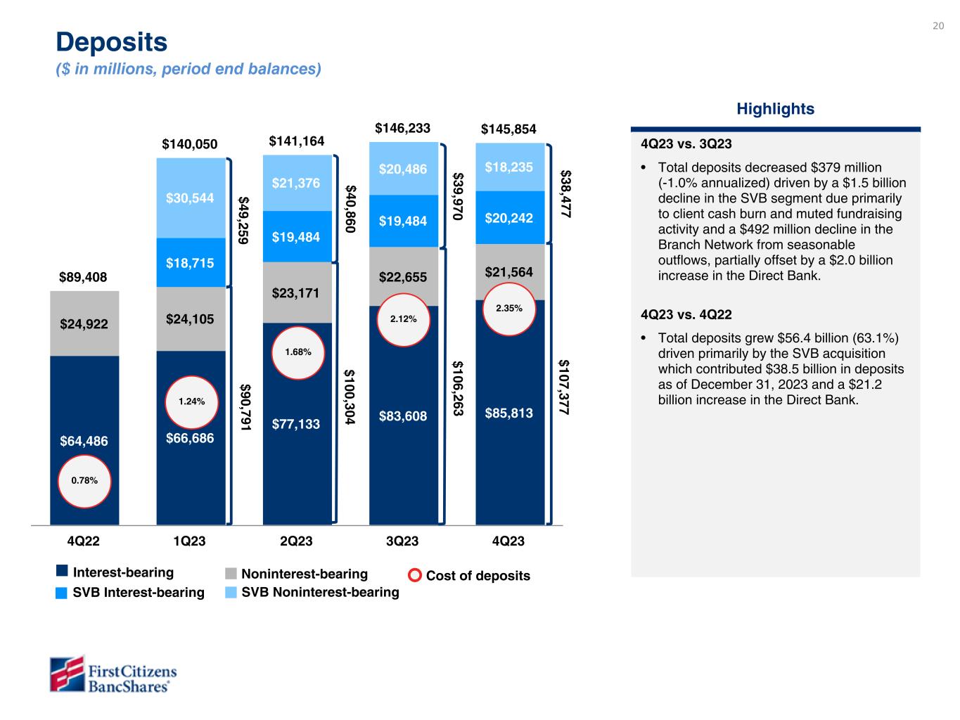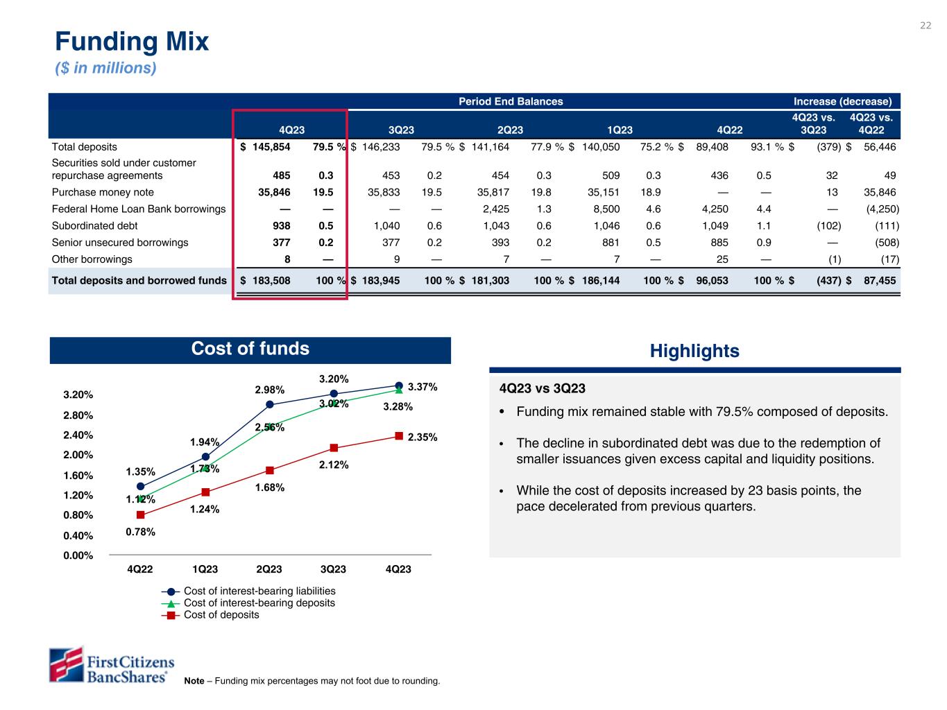 22 1.35% 1.94% 2.98% 3.20% 3.37% 1.12% 1.73% 2.56% 3.02% 3.28% 0.78% 1.24% 1.68% 2.12% 2.35% Cost of interest-bearing liabilities Cost of interest-bearing deposits Cost of deposits 4Q22 1Q23 2Q23 3Q23 4Q23 0.00% 0.40% 0.80% 1.20% 1.60% 2.00% 2.40% 2.80% 3.20% Cost of funds Additional sources of liquidity Categories $ in millions FHLB $ 9,218 FRB 4,203 Line of credit 100 Total $ 13,521 Period End Balances Increase (decrease) 4Q23 3Q23 2Q23 1Q23 4Q22 4Q23 vs. 3Q23 4Q23 vs. 4Q22 Total deposits $ 145,854 79.5 % $ 146,233 79.5 % $ 141,164 77.9 % $ 140,050 75.2 % $ 89,408 93.1 % $ (379) $ 56,446 Securities sold under customer repurchase agreements 485 0.3 453 0.2 454 0.3 509 0.3 436 0.5 32 49 Purchase money note 35,846 19.5 35,833 19.5 35,817 19.8 35,151 18.9 — — 13 35,846 Federal Home Loan Bank borrowings — — — — 2,425 1.3 8,500 4.6 4,250 4.4 — (4,250) Subordinated debt 938 0.5 1,040 0.6 1,043 0.6 1,046 0.6 1,049 1.1 (102) (111) Senior unsecured borrowings 377 0.2 377 0.2 393 0.2 881 0.5 885 0.9 — (508) Other borrowings 8 — 9 — 7 — 7 — 25 — (1) (17) Total deposits and borrowed funds $ 183,508 100 % $ 183,945 100 % $ 181,303 100 % $ 186,144 100 % $ 96,053 100 % $ (437) $ 87,455 Funding Mix ($ in millions) Highlights 4Q23 vs 3Q23 • Funding mix remained stable with 79.5% composed of deposits. • The decline in subordinated debt was due to the redemption of smaller issuances given excess capital and liquidity positions. • While the cost of deposits increased by 23 basis points, the pace decelerated from previous quarters. Note – Funding mix percentages may not foot due to rounding.
