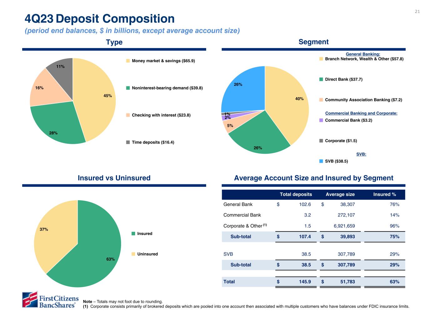 20 $89,408 $140,050 $141,164 $146,233 $145,854 $64,486 $66,686 $77,133 $83,608 $85,813 $24,922 $24,105 $23,171 $22,655 $21,564 $18,715 $19,484 $19,484 $20,242 $30,544 $21,376 $20,486 $18,235 4Q22 1Q23 2Q23 3Q23 4Q23 $39,970 2.12% 1.68% 1.24% 0.78% 2.35% $107,377 $38,477 $106,263 $40,860 $100,304 Highlights Deposits ($ in millions, period end balances) $140,050 $66,686 $24,105 $18,715 $30,544 1Q23 SVB Interest-bearing SVB Noninterest-bearing Interest-bearing Noninterest-bearing Cost of deposits 4Q23 vs. 3Q23 • Total deposits decreased $379 million (-1.0% annualized) driven by a $1.5 billion decline in the SVB segment due primarily to client cash burn and muted fundraising activity and a $492 million decline in the Branch Network from seasonable outflows, partially offset by a $2.0 billion increase in the Direct Bank. 4Q23 vs. 4Q22 • Total deposits grew $56.4 billion (63.1%) driven primarily by the SVB acquisition which contributed $38.5 billion in deposits as of December 31, 2023 and a $21.2 billion increase in the Direct Bank. $49,259 $90,791