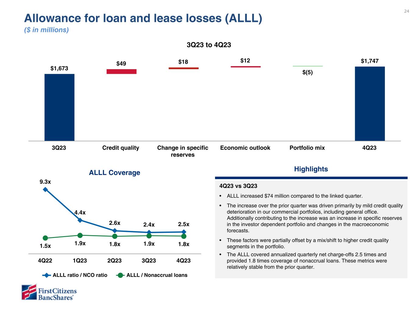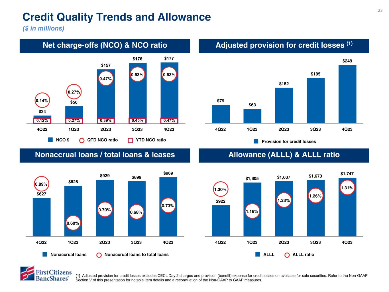23 $79 $63 $152 $195 $249 Provision for credit losses 4Q22 1Q23 2Q23 3Q23 4Q23 Credit Quality Trends and Allowance ($ in millions) Net charge-offs (NCO) & NCO ratio Adjusted provision for credit losses (1) $24 $50 $157 $176 $177 0.14% 0.27% 0.47% 0.53% 0.53% NCO $ QTD NCO ratio YTD NCO ratio 4Q22 1Q23 2Q23 3Q23 4Q23 $627 $828 $929 $899 $969 0.89% 0.60% 0.70% 0.68% 0.73% Nonaccrual loans Nonaccrual loans to total loans 4Q22 1Q23 2Q23 3Q23 4Q23 Nonaccrual loans / total loans & leases Allowance (ALLL) & ALLL ratio $922 $1,605 $1,637 $1,673 $1,747 1.30% 1.16% 1.23% 1.26% 1.31% ALLL ALLL ratio 4Q22 1Q23 2Q23 3Q23 4Q23 (1) Adjusted provision for credit losses excludes CECL Day 2 charges and provision (benefit) expense for credit losses on available for sale securities. Refer to the Non-GAAP Section V of this presentation for notable item details and a reconciliation of the Non-GAAP to GAAP measures. 0.47%0.12% 0.27% 0.39% 0.45% Please see addition of the YTD NCO totals. Note that we did not move the coverage ratios here as the rollforward slide looked bare without another metric included on that slide.