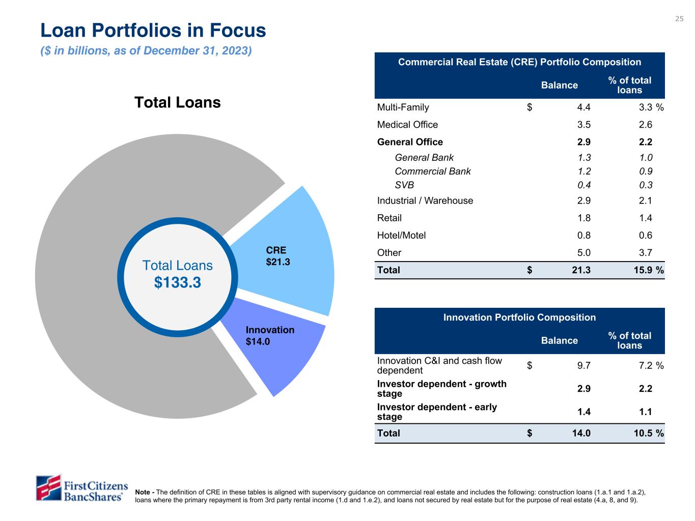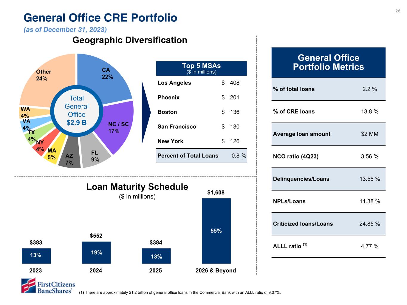 25 Loan Portfolios in Focus ($ in billions, as of December 31, 2023) Total Loans $133.3 Total Loans CRE $21.3 Commercial Real Estate (CRE) Portfolio Composition Balance % of total loans Multi-Family $ 4.4 3.3 % Medical Office 3.5 2.6 General Office 2.9 2.2 General Bank 1.3 1.0 Commercial Bank 1.2 0.9 SVB 0.4 0.3 Industrial / Warehouse 2.9 2.1 Retail 1.8 1.4 Hotel/Motel 0.8 0.6 Other 5.0 3.7 Total $ 21.3 15.9 % Note - The definition of CRE in these tables is aligned with supervisory guidance on commercial real estate and includes the following: construction loans (1.a.1 and 1.a.2), loans where the primary repayment is from 3rd party rental income (1.d and 1.e.2), and loans not secured by real estate but for the purpose of real estate (4.a, 8, and 9). Innovation Portfolio Composition Balance % of total loans Innovation C&I and cash flow dependent $ 9.7 7.2 % Investor dependent - growth stage 2.9 2.2 Investor dependent - early stage 1.4 1.1 Total $ 14.0 10.5 % Innovation $14.0