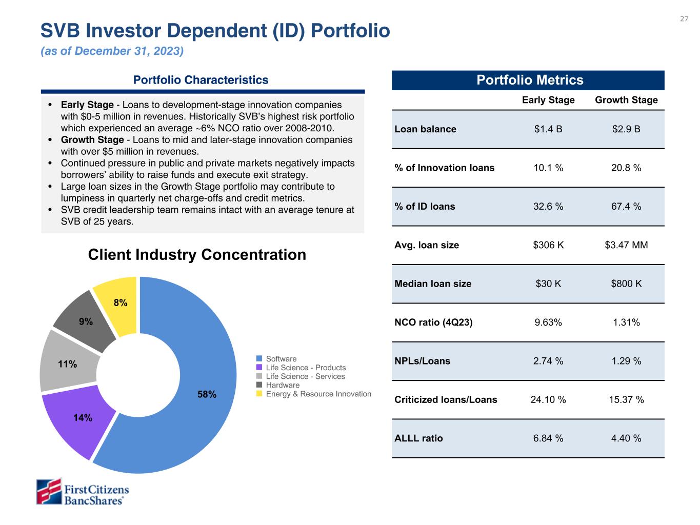 27 SVB Investor Dependent (ID) Portfolio (as of December 31, 2023) Portfolio Metrics Early Stage Growth Stage Loan balance $1.4 B $2.9 B % of Innovation loans 10.1 % 20.8 % % of ID loans 32.6 % 67.4 % Avg. loan size $306 K $3.47 MM Median loan size $30 K $800 K NCO ratio (4Q23) 9.63% 1.31% NPLs/Loans 2.74 % 1.29 % Criticized loans/Loans 24.10 % 15.37 % ALLL ratio 6.84 % 4.40 % Client Industry Concentration Portfolio Characteristics • Early Stage - Loans to development-stage innovation companies with $0-5 million in revenues. Historically SVB’s highest risk portfolio which experienced an average ~6% NCO ratio over 2008-2010. • Growth Stage - Loans to mid and later-stage innovation companies with over $5 million in revenues. • Continued pressure in public and private markets negatively impacts borrowers’ ability to raise funds and execute exit strategy. • Large loan sizes in the Growth Stage portfolio may contribute to lumpiness in quarterly net charge-offs and credit metrics. • SVB credit leadership team remains intact with an average tenure at SVB of 25 years. 58% 14% 11% 9% 8% Software Life Science - Products Life Science - Services Hardware Energy & Resource Innovation