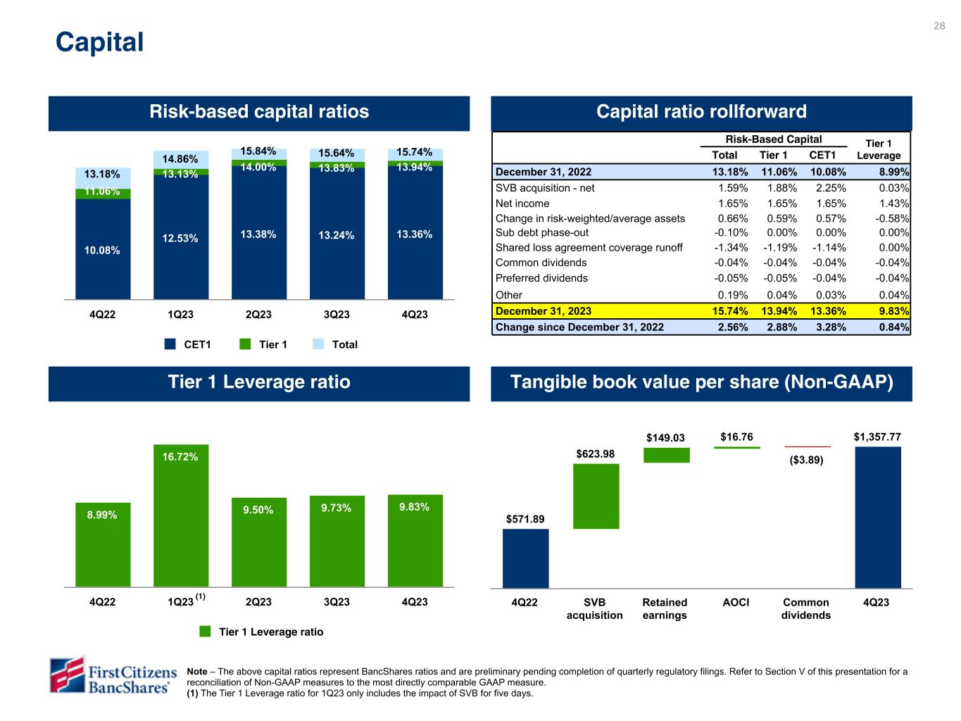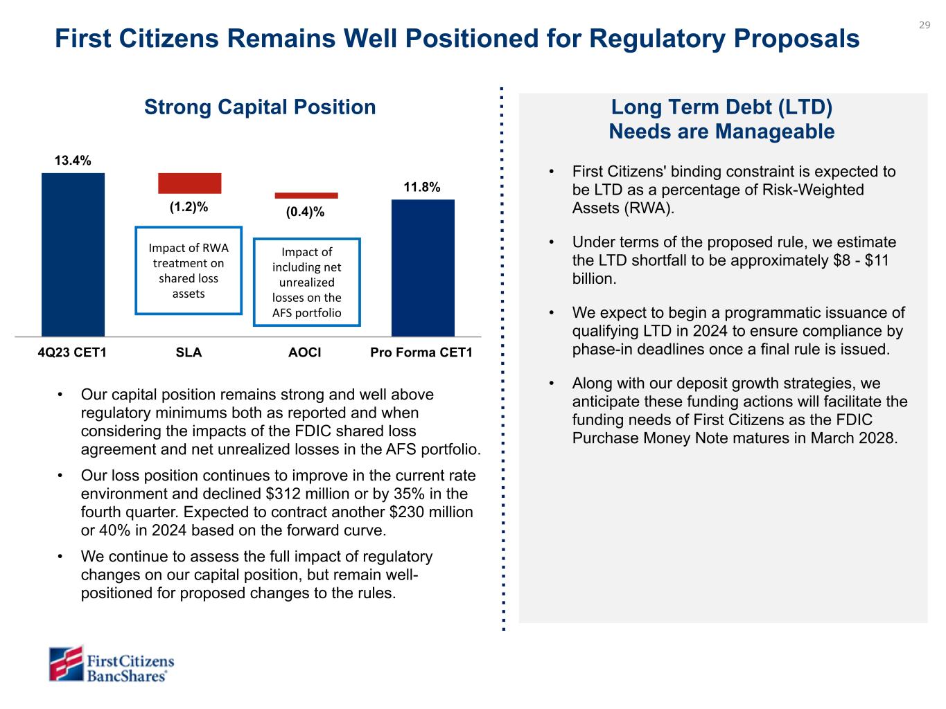 28 8.99% 16.72% 9.50% 9.73% 9.83% Tier 1 Leverage ratio 4Q22 1Q23 2Q23 3Q23 4Q23 Risk-based capital ratios Capital ratio rollforward Tier 1 Leverage ratio Tangible book value per share (Non-GAAP) Capital Risk-Based Capital Tier 1 Leverage Total Tier 1 CET1 December 31, 2022 13.18 % 11.06 % 10.08 % 8.99 % SVB acquisition - net 1.59 % 1.88 % 2.25 % 0.03 % Net income 1.65 % 1.65 % 1.65 % 1.43 % Change in risk-weighted/average assets 0.66 % 0.59 % 0.57 % -0.58 % Sub debt phase-out -0.10 % 0.00 % 0.00 % 0.00 % Shared loss agreement coverage runoff -1.34 % -1.19 % -1.14 % 0.00 % Common dividends -0.04 % -0.04 % -0.04 % -0.04 % Preferred dividends -0.05 % -0.05 % -0.04 % -0.04 % Other 0.19 % 0.04 % 0.03 % 0.04 % December 31, 2023 15.74 % 13.94 % 13.36 % 9.83 % Change since December 31, 2022 2.56 % 2.88 % 3.28 % 0.84 % Note – The above capital ratios represent BancShares ratios and are preliminary pending completion of quarterly regulatory filings. Refer to Section V of this presentation for a reconciliation of Non-GAAP measures to the most directly comparable GAAP measure. (1) The Tier 1 Leverage ratio for 1Q23 only includes the impact of SVB for five days. 10.08% 12.53% 13.38% 13.24% 13.36% 11.06% 13.13% 14.00% 13.83% 13.94%13.18% 14.86% 15.84% 15.64% 15.74% CET1 Tier 1 Total 4Q22 1Q23 2Q23 3Q23 4Q23 $571.89 $623.98 $149.03 $16.76 ($3.89) $1,357.77 4Q22 SVB acquisition Retained earnings AOCI Common dividends 4Q23(1) Please do not review. Data not updated.