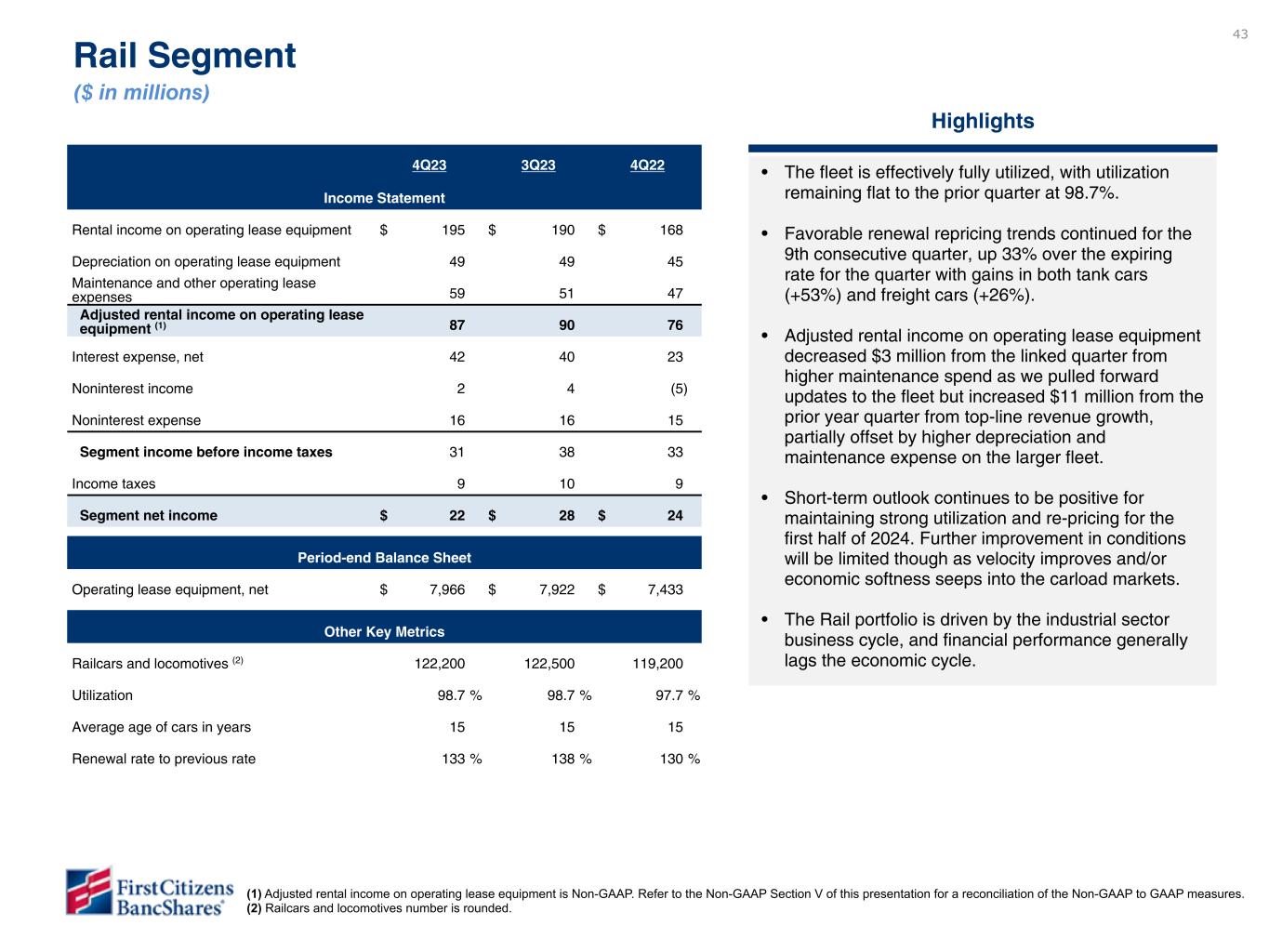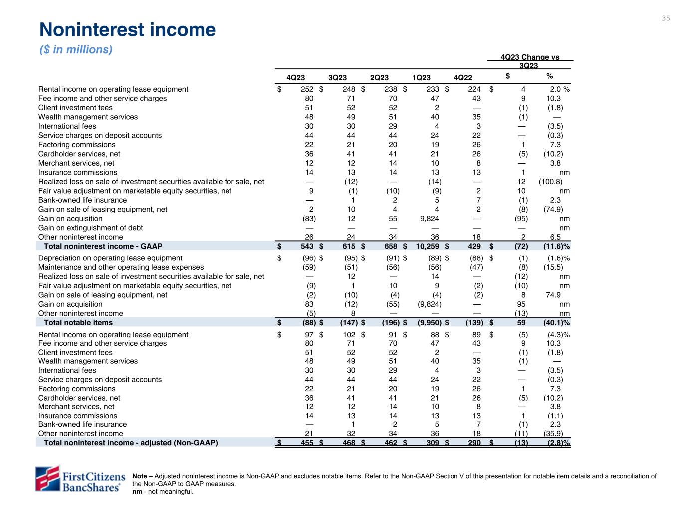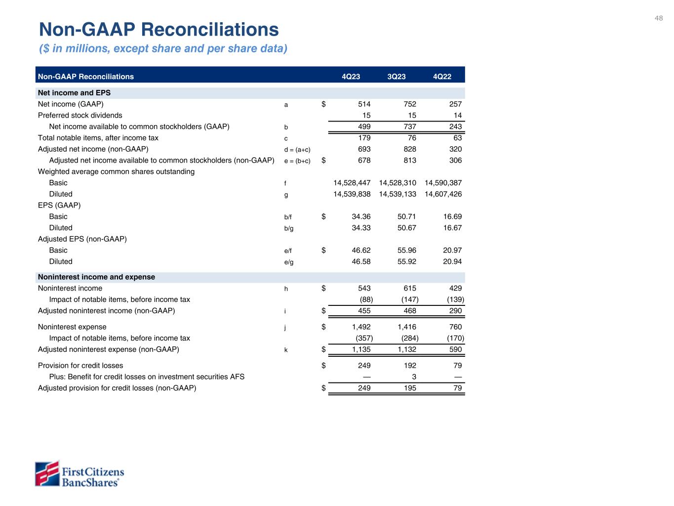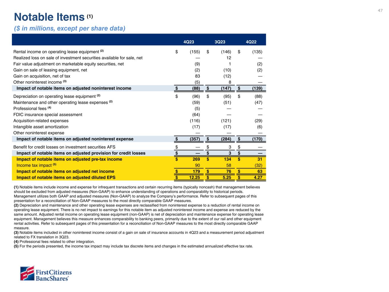47 1Q23 4Q22 1Q22 Rental income on operating lease equipment (2) $ (155) $ (146) $ (135) Realized gain on sale of investment securities available for sale, net — 12 — Fair value adjustment on marketable equity securities, net (9) 1 (2) Gain on sale of leasing equipment, net (2) (10) (2) Gain on acquisition 83 (12) — Gain on extinguishment of debt — — — Other noninterest income(3) (5) 8 — Impact on adjusted noninterest income $ (88) $ (147) $ (139) Depreciation on operating lease equipment (2) $ (96) $ (95) $ (88) Maintenance and other operating lease expenses (2) (59) (51) (47) Salaries and benefits — — — Acquisition-related expenses (116) (121) (29) Intangible asset amortization (17) (17) (6) Other noninterest expense (4) — — — Impact on adjusted noninterest expense $ (357) $ (284) $ (170) CECL Day 2 provision and reserve for unfunded commitments — (716) — Provision for credit losses- investment securities available for sale — (4) — Provision for credit losses - total adjustments $ — $ 3 $ — Impact on adjusted pre-tax income $ 134 $ 173 $ 38 Income tax impact (5) (6) 90 58 (32) Impact on adjusted net income $ 179 $ 76 $ 63 Impact on adjusted diluted EPS $ 12.25 $ 5.25 4.27 Notable Items (1) ($ in millions, except per share data) 4Q23 3Q23 4Q22 Rental income on operating lease equipment (2) $ (155) $ (146) $ (135) Realized loss on sale of investment securities available for sale, net — 12 — Fair value adjustment on marketable equity securities, net (9) 1 (2) Gain on sale of leasing equipment, net (2) (10) (2) Gain on acquisition, net of tax 83 (12) — Other noninterest income (3) (5) 8 — Impact of notable items on adjusted noninterest income $ (88) $ (147) $ (139) Depreciation on operating lease equipment (2) $ (96) $ (95) $ (88) Maintenance and other operating lease expenses (2) (59) (51) (47) Professional fees (4) (5) — — FDIC insurance special assessment (64) — — Acquisition-related expenses (116) (121) (29) Intangible asset amortization (17) (17) (6) Other noninterest expense — — — Impact of notable items on adjusted noninterest expense $ (357) $ (284) $ (170) Benefit for credit losses on investment securities AFS $ — $ 3 $ — Impact of notable items on adjusted provision for credit losses $ — $ 3 $ — Impact of notable items on adjusted pre-tax income $ 269 $ 134 $ 31 Income tax impact (5) 90 58 (32) Impact of notable items on adjusted net income $ 179 $ 76 $ 63 Impact of notable items on adjusted diluted EPS $ 12.25 $ 5.25 $ 4.27 (1) Notable items include income and expense for infrequent transactions and certain recurring items (typically noncash) that management believes should be excluded from adjusted measures (Non-GAAP) to enhance understanding of operations and comparability to historical periods. Management utilizes both GAAP and adjusted measures (Non-GAAP) to analyze the Company’s performance. Refer to subsequent pages of this presentation for a reconciliation of Non-GAAP measures to the most directly comparable GAAP measures. (2) Depreciation and maintenance and other operating lease expenses are reclassified from noninterest expense to a reduction of rental income on operating lease equipment. There is no net impact to earnings for this notable item as adjusted noninterest income and expense are reduced by the same amount. Adjusted rental income on operating lease equipment (non-GAAP) is net of depreciation and maintenance expense for operating lease equipment. Management believes this measure enhances comparability to banking peers, primarily due to the extent of our rail and other equipment rental activities. Refer to subsequent pages of this presentation for a reconciliation of Non-GAAP measures to the most directly comparable GAAP measure. (3) Notable items included in other noninterest income consist of a gain on sale of insurance accounts in 4Q23 and a measurement period adjustment related to FX translation in 3Q23. (4) Professional fees related to other integration. (5) For the periods presented, the income tax impact may include tax discrete items and changes in the estimated annualized effective tax rate.