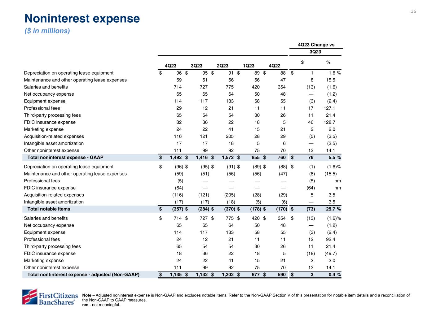35 Noninterest income ($ in millions) 4Q23 Change vs 3Q23 4Q23 3Q23 2Q23 1Q23 4Q22 $ % Rental income on operating lease equipment $ 252 $ 248 $ 238 $ 233 $ 224 $ 4 2.0 % Fee income and other service charges 80 71 70 47 43 9 10.3 Client investment fees 51 52 52 2 — (1) (1.8) Wealth management services 48 49 51 40 35 (1) — International fees 30 30 29 4 3 — (3.5) Service charges on deposit accounts 44 44 44 24 22 — (0.3) Factoring commissions 22 21 20 19 26 1 7.3 Cardholder services, net 36 41 41 21 26 (5) (10.2) Merchant services, net 12 12 14 10 8 — 3.8 Insurance commissions 14 13 14 13 13 1 nm Realized loss on sale of investment securities available for sale, net — (12) — (14) — 12 (100.8) Fair value adjustment on marketable equity securities, net 9 (1) (10) (9) 2 10 nm Bank-owned life insurance — 1 2 5 7 (1) 2.3 Gain on sale of leasing equipment, net 2 10 4 4 2 (8) (74.9) Gain on acquisition (83) 12 55 9,824 — (95) nm Gain on extinguishment of debt — — — — — — nm Other noninterest income 26 24 34 36 18 2 6.5 Total noninterest income - GAAP $ 543 $ 615 $ 658 $ 10,259 $ 429 $ (72) (11.6) % Depreciation on operating lease equipment $ (96) $ (95) $ (91) $ (89) $ (88) $ (1) (1.6) % Maintenance and other operating lease expenses (59) (51) (56) (56) (47) (8) (15.5) Realized loss on sale of investment securities available for sale, net — 12 — 14 — (12) nm Fair value adjustment on marketable equity securities, net (9) 1 10 9 (2) (10) nm Gain on sale of leasing equipment, net (2) (10) (4) (4) (2) 8 74.9 Gain on acquisition 83 (12) (55) (9,824) — 95 nm Other noninterest income (5) 8 — — — (13) nm Total notable items $ (88) $ (147) $ (196) $ (9,950) $ (139) $ 59 (40.1) % Rental income on operating lease equipment $ 97 $ 102 $ 91 $ 88 $ 89 $ (5) (4.3) % Fee income and other service charges 80 71 70 47 43 9 10.3 Client investment fees 51 52 52 2 — (1) (1.8) Wealth management services 48 49 51 40 35 (1) — International fees 30 30 29 4 3 — (3.5) Service charges on deposit accounts 44 44 44 24 22 — (0.3) Factoring commissions 22 21 20 19 26 1 7.3 Cardholder services, net 36 41 41 21 26 (5) (10.2) Merchant services, net 12 12 14 10 8 — 3.8 Insurance commissions 14 13 14 13 13 1 (1.1) Bank-owned life insurance — 1 2 5 7 (1) 2.3 Other noninterest income 21 32 34 36 18 (11) (35.9) Total noninterest income - adjusted (Non-GAAP) $ 455 $ 468 $ 462 $ 309 $ 290 $ (13) (2.8) % Note – Adjusted noninterest income is Non-GAAP and excludes notable items. Refer to the Non-GAAP Section V of this presentation for notable item details and a reconciliation of the Non-GAAP to GAAP measures. nm - not meaningful.