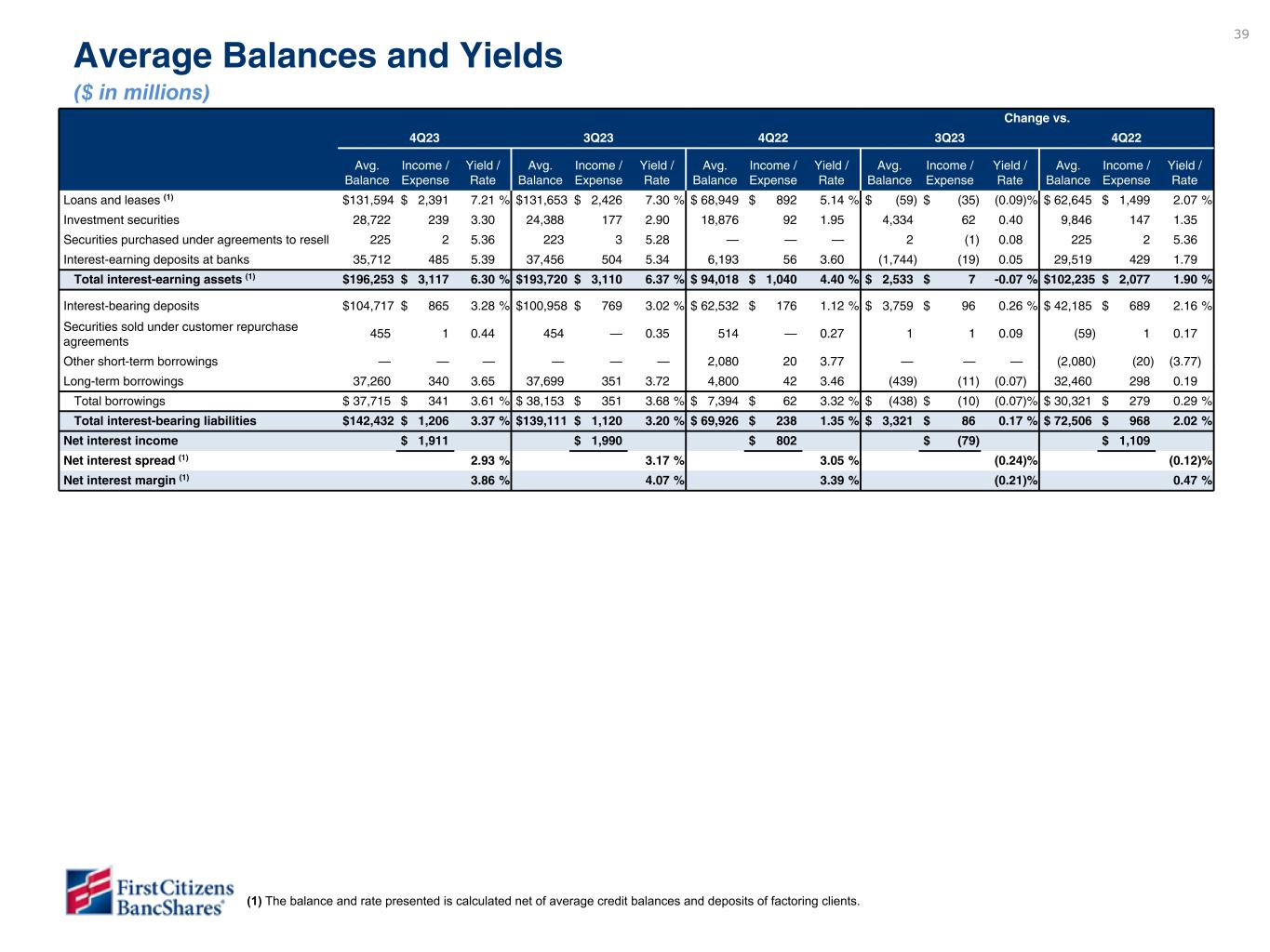 39 Change vs. 4Q23 3Q23 4Q22 3Q23 4Q22 Avg. Balance Income / Expense Yield / Rate Avg. Balance Income / Expense Yield / Rate Avg. Balance Income / Expense Yield / Rate Avg. Balance Income / Expense Yield / Rate Avg. Balance Income / Expense Yield / Rate Loans and leases (1) $ 131,594 $ 2,391 7.21 % $ 131,653 $ 2,426 7.30 % $ 68,949 $ 892 5.14 % $ (59) $ (35) (0.09) % $ 62,645 $ 1,499 2.07 % Investment securities 28,722 239 3.30 24,388 177 2.90 18,876 92 1.95 4,334 62 0.40 9,846 147 1.35 Securities purchased under agreements to resell 225 2 5.36 223 3 5.28 — — — 2 (1) 0.08 225 2 5.36 Interest-earning deposits at banks 35,712 485 5.39 37,456 504 5.34 6,193 56 3.60 (1,744) (19) 0.05 29,519 429 1.79 Total interest-earning assets (1) $ 196,253 $ 3,117 6.30 % $ 193,720 $ 3,110 6.37 % $ 94,018 $ 1,040 4.40 % $ 2,533 $ 7 -0.07 % $ 102,235 $ 2,077 1.90 % Interest-bearing deposits $ 104,717 $ 865 3.28 % $ 100,958 $ 769 3.02 % $ 62,532 $ 176 1.12 % $ 3,759 $ 96 0.26 % $ 42,185 $ 689 2.16 % Securities sold under customer repurchase agreements 455 1 0.44 454 — 0.35 514 — 0.27 1 1 0.09 (59) 1 0.17 Other short-term borrowings — — — — — — 2,080 20 3.77 — — — (2,080) (20) (3.77) Long-term borrowings 37,260 340 3.65 37,699 351 3.72 4,800 42 3.46 (439) (11) (0.07) 32,460 298 0.19 Total borrowings $ 37,715 $ 341 3.61 % $ 38,153 $ 351 3.68 % $ 7,394 $ 62 3.32 % $ (438) $ (10) (0.07) % $ 30,321 $ 279 0.29 % Total interest-bearing liabilities $ 142,432 $ 1,206 3.37 % $ 139,111 $ 1,120 3.20 % $ 69,926 $ 238 1.35 % $ 3,321 $ 86 0.17 % $ 72,506 $ 968 2.02 % Net interest income $ 1,911 $ 1,990 $ 802 $ (79) $ 1,109 Net interest spread (1) 2.93 % 3.17 % 3.05 % (0.24) % (0.12) % Net interest margin (1) 3.86 % 4.07 % 3.39 % (0.21) % 0.47 % Change vs. YTD23 YTD22 YTD22 Avg. Balance Income / Expense Yield / Rate Avg. Balance Income / Expense Yield / Rate Avg. Balance Income / Expense Yield / Rate Loans and leases (1) $ 66,634 $ 2,953 4.41 % $ 65,639 $ 2,697 4.09 % $ 995 $ 256 0.32 % Investment securities 19,166 354 1.85 16,110 216 1.32 3,056 138 0.53 Interest-earning deposits at banks 7,726 106 1.38 13,246 17 0.13 (5,520) 89 1.25 Total interest-earning assets (1) $ 93,526 $ 3,413 3.63 % $ 94,995 $ 2,930 3.07 % $ (1,469) $ 483 0.56 % Interest-bearing deposits $ 63,598 $ 335 0.53 % $ 65,295 $ 239 0.37 % $ (1,697) $ 96 0.16 % Securities sold under customer repurchase agreements 590 1 0.19 660 1 0.20 (70) — (0.01) Other short-term borrowings 824 28 3.30 — — — 824 28 3.30 Long-term borrowings 3,882 103 2.64 5,915 249 4.15 (2,033) (146) (1.51) Total borrowings $ 5,296 $ 132 2.47 % $ 6,575 $ 250 3.75 % $ (1,279) $ (118) (1.28) % Total interest-bearing liabilities $ 68,894 $ 467 0.68 % $ 71,870 $ 489 0.68 % $ (2,976) $ (22) — % Net interest income $ 2,946 $ 2,441 $ 505 Net interest spread (1) 2.95 % 2.39 % 0.56 % Net interest margin (1) 3.14 % 2.55 % 0.59 % Average Balances and Yields ($ in millions) (1) The balance and rate presented is calculated net of average credit balances and deposits of factoring clients. YTD not disclosed Q1